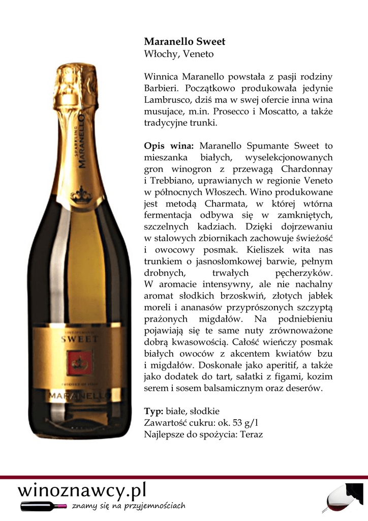 Maranello Sweet Włochy, Veneto Winnica Maranello powstała z pasji rodziny Barbieri. Początkowo produkowała jedynie Lambrusco, dziś ma w swej ofercie inna wina musujace, m.in. Prosecco i Moscatto, a także tradycyjne trunki. Opis wina: Maranello Spumante Sweet to mieszanka białych, wyselekcjonowanych gron winogron z przewagą Chardonnay i Trebbiano, uprawianych w regionie Veneto w północnych Włoszech. Wino produkowane jest metodą Charmata, w której wtórna fermentacja odbywa się w zamkniętych, szczelnych kadziach. Dzięki dojrzewaniu w stalowych zbiornikach zachowuje świeżość i owocowy posmak. Kieliszek wita nas trunkiem o jasnosłomkowej barwie, pełnym drobnych, trwałych pęcherzyków. W aromacie intensywny, ale nie nachalny aromat słodkich brzoskwiń, złotych jabłek moreli i ananasów przyprószonych szczyptą prażonych migdałów. Na podniebieniu pojawiają się te same nuty zrównoważone dobrą kwasowością. Całość wieńczy posmak białych owoców z akcentem kwiatów bzu i migdałów. Doskonałe jako aperitif, a także jako dodatek do tart, sałatki z figami, kozim serem i sosem balsamicznym oraz deserów. Typ: białe, słodkie Zawartość cukru: ok. 53 g/l Najlepsze do spożycia: Teraz