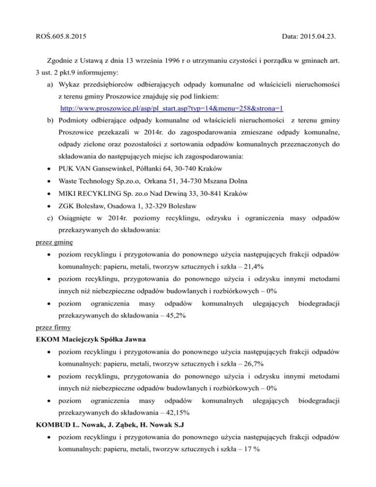 ROŚ.605.8.2015 Data: 2015.04.23. Zgodnie z Ustawą z dnia 13 września 1996 r o utrzymaniu czystości i porządku w gminach art. 3 ust. 2 pkt.9 informujemy: a) Wykaz przedsiębiorców odbierających odpady komunalne od właścicieli nieruchomości z terenu gminy Proszowice znajduję się pod linkiem: http://www.proszowice.pl/asp/pl_start.asp?typ=14&menu=258&strona=1 b) Podmioty odbierające odpady komunalne od właścicieli nieruchomości z terenu gminy Proszowice przekazali w 2014r. do zagospodarowania zmieszane odpady komunalne, odpady zielone oraz pozostałości z sortowania odpadów komunalnych przeznaczonych do składowania do następujących miejsc ich zagospodarowania: PUK VAN Gansewinkel, Półłanki 64, 30-740 Kraków Waste Technology Sp.zo.o, Orkana 51, 34-730 Mszana Dolna MIKI RECYKLING Sp. zo.o Nad Drwiną 33, 30-841 Kraków ZGK Bolesław, Osadowa 1, 32-329 Bolesław c) Osiągnięte w 2014r. poziomy recyklingu, odzysku i ograniczenia masy odpadów przekazywanych do składowania: przez gminę poziom recyklingu i przygotowania do ponownego użycia następujących frakcji odpadów komunalnych: papieru, metali, tworzyw sztucznych i szkła – 21,4% poziom recyklingu, przygotowania do ponownego użycia i odzysku innymi metodami innych niż niebezpieczne odpadów budowlanych i rozbiórkowych – 0% poziom ograniczenia masy odpadów komunalnych ulegających biodegradacji przekazywanych do składowania – 45,2% przez firmy EKOM Maciejczyk Spółka Jawna poziom recyklingu i przygotowania do ponownego użycia następujących frakcji odpadów komunalnych: papieru, metali, tworzyw sztucznych i szkła – 26,7% poziom recyklingu, przygotowania do ponownego użycia i odzysku innymi metodami innych niż niebezpieczne odpadów budowlanych i rozbiórkowych – 0% poziom ograniczenia masy odpadów komunalnych ulegających biodegradacji przekazywanych do składowania – 42,15% KOMBUD L. Nowak, J. Ząbek, H. Nowak S.J poziom recyklingu i przygotowania do ponownego użycia następujących frakcji odpadów komunalnych: papieru, metali, tworzyw sztucznych i szkła – 17 % poziom recyklingu, przygotowania do ponownego użycia i odzysku innymi metodami innych niż niebezpieczne odpadów budowlanych i rozbiórkowych – 0% poziom ograniczenia masy odpadów komunalnych ulegających biodegradacji przekazywanych do składowania – 3,08% MPGO Spółka z o. o w Krakowie poziom recyklingu i przygotowania do ponownego użycia następujących frakcji odpadów komunalnych: papieru, metali, tworzyw sztucznych i szkła – 39,37% poziom recyklingu, przygotowania do ponownego użycia i odzysku innymi metodami innych niż niebezpieczne odpadów budowlanych i rozbiórkowych – 0% poziom ograniczenia masy odpadów komunalnych ulegających biodegradacji przekazywanych do składowania – 0,23% Wymagane poziomy zgodnie z Rozporządzeniami Ministra Środowiska Rozporządzenie Ministra Środowiska z dnia 29 maja 2012 r. w sprawie poziomów recyklingu, przygotowania do ponownego użycia i odzysku innymi metodami niektórych frakcji odpadów komunalnych Tabela nr 1 Poziom recyklingu i przygotowania do ponownego użycia [%] Papier, metal, tworzywa sztuczne, szkło1) 2012 r. 2013 r. 2014 r. 2015 r. 2016 r. 2017 r. 2018 r. 2019 r. 2020 r. 10 12 14 16 18 20 30 40 50 Tabela nr 2 Poziom recyklingu, przygotowania do ponownego użycia i odzysku innymi metodami [%] Inne niż niebezpieczne odpady budowlane i rozbiórkowe 2012 r. 2013 r. 2014 r. 2015 r. 2016 r. 2017 r. 2018 r. 2019 r. 2020 r. 30 36 38 40 42 45 50 60 70 Rozporządzenie Ministra Środowiska z dnia 25 maja 2012 r. w sprawie poziomów ograniczenia masy odpadów komunalnych ulegających biodegradacji przekazywanych do składowania oraz sposobu obliczana poziomu ograniczenia masy tych odpadów Rok Dopuszczalny poziom masy odpadów komunalnych ulegających biodegradacji przekazywanych do składowania w stosunku do masy tych odpadów wytworzonych w 1995 r. [%] 2012 16 lipca 2013 2014 2015 2016 2017 2018 2019 16 lipca 2020 75 50 50 50 45 45 40 40 35 d) Punkty selektywnego zbierania odpadów komunalnych Gminny Punkt Selektywnej Zbiórki Odpadów Komunalnych GPSZOK Kowala 6 Punkt Skupu Surowców Wtórnych P.H.U „EKOPARTNER” A. Liszka os. Albertyńskie 21/56, 31-853 Kraków Punkt Kowala 6, 32-100 Proszowice Punkt Skupu Złomu Zakład Wielobranżowy UNIWERS AW Anna Włodarska ul Podgórze 5, 32-100 Proszowice e) Informacja o zbierających zużyty sprzęt elektryczny i elektroniczny pochodzący z gospodarstw domowych. Pralki, telewizory etc. stanowią zużyty sprzęt elektryczny i elektroniczny (ZSEE). Zasady wprowadzania do obrotu i zbierania ZSSE reguluje Ustawa z dnia 29 lipca 2005 r. o zużytym sprzęcie elektrycznym i elektronicznym (tekst jednolity DZ.U.2013 .poz.1155). W ustawie tej art. 42 nakłada na sprzedawcę przy sprzedaży obowiązek nieodpłatnego przyjęcia sprzętu podobnego rodzaju. Art. 42. 1. Sprzedawca detaliczny i sprzedawca hurtowy są obowiązani przy sprzedaży sprzętu przeznaczonego dla gospodarstw domowych do nieodpłatnego przyjęcia zużytego sprzętu w ilości nie większej niż sprzedawany nowy sprzęt, jeżeli zużyty sprzęt jest tego samego rodzaju. 2. Sprzedawca detaliczny jest obowiązany do nieodpłatnego przekazania przyjętego zużytego sprzętu, o którym mowa w ust. 1, prowadzącemu zakład przetwarzania lub sprzedawcy hurtowemu. 3. Sprzedawca hurtowy jest obowiązany do nieodpłatnego przekazania przyjętego zużytego sprzętu, o którym mowa w ust. 1, prowadzącemu zakład przetwarzania. Przedsiębiorcy prowadzący zbieranie ZSEE podlegają wpisowi do Rejestru Przedsiębiorców i Organizacji Odzysku Zużytego Sprzętu Elektrycznego i Elektronicznego prowadzonego przez Głównego Inspektora Ochrony Środowiska. Aktualny rejestr pod adresem http://rzseie.gios.gov.pl/szukaj_rzseie.php w rejestrze znajduje się m. in. BIM Bujakowscy i Machnikowie Proszowice ul. Kopernika 2, 32-100 Proszowice Firma Handlowo Usługowa ELEKTRONIKA mg