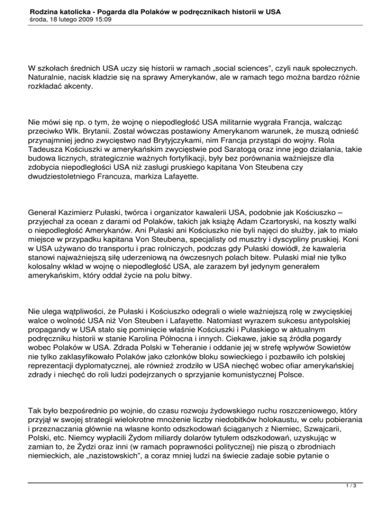 Rodzina katolicka - Pogarda dla Polaków w podręcznikach historii w USA środa, 18 lutego 2009 15:09 W szkołach średnich USA uczy się historii w ramach „social sciences”, czyli nauk społecznych. Naturalnie, nacisk kładzie się na sprawy Amerykanów, ale w ramach tego można bardzo różnie rozkładać akcenty. Nie mówi się np. o tym, że wojnę o niepodległość USA militarnie wygrała Francja, walcząc przeciwko Wlk. Brytanii. Został wówczas postawiony Amerykanom warunek, że muszą odnieść przynajmniej jedno zwycięstwo nad Brytyjczykami, nim Francja przystąpi do wojny. Rola Tadeusza Kościuszki w amerykańskim zwycięstwie pod Saratogą oraz inne jego działania, takie budowa licznych, strategicznie ważnych fortyfikacji, były bez porównania ważniejsze dla zdobycia niepodległości USA niż zasługi pruskiego kapitana Von Steubena czy dwudziestoletniego Francuza, markiza Lafayette. Generał Kazimierz Pułaski, twórca i organizator kawalerii USA, podobnie jak Kościuszko – przyjechał za ocean z darami od Polaków, takich jak książę Adam Czartoryski, na koszty walki o niepodległość Amerykanów. Ani Pułaski ani Kościuszko nie byli najęci do służby, jak to miało miejsce w przypadku kapitana Von Steubena, specjalisty od musztry i dyscypliny pruskiej. Koni w USA używano do transportu i prac rolniczych, podczas gdy Pułaski dowiódł, że kawaleria stanowi najważniejszą siłę uderzeniową na ówczesnych polach bitew. Pułaski miał nie tylko kolosalny wkład w wojnę o niepodległość USA, ale zarazem był jedynym generałem amerykańskim, który oddał życie na polu bitwy. Nie ulega wątpliwości, że Pułaski i Kościuszko odegrali o wiele ważniejszą rolę w zwycięskiej walce o wolność USA niż Von Steuben i Lafayette. Natomiast wyrazem sukcesu antypolskiej propagandy w USA stało się pominięcie właśnie Kościuszki i Pułaskiego w aktualnym podręczniku historii w stanie Karolina Północna i innych. Ciekawe, jakie są źródła pogardy wobec Polaków w USA. Zdrada Polski w Teheranie i oddanie jej w strefę wpływów Sowietów nie tylko zaklasyfikowało Polaków jako członków bloku sowieckiego i pozbawiło ich polskiej reprezentacji dyplomatycznej, ale również zrodziło w USA niechęć wobec ofiar amerykańskiej zdrady i niechęć do roli ludzi podejrzanych o sprzyjanie komunistycznej Polsce. Tak było bezpośrednio po wojnie, do czasu rozwoju żydowskiego ruchu roszczeniowego, który przyjął w swojej strategii wielokrotne mnożenie liczby niedobitków holokaustu, w celu pobierania i przeznaczania głównie na własne konto odszkodowań ściąganych z Niemiec, Szwajcarii, Polski, etc. Niemcy wypłacili Żydom miliardy dolarów tytułem odszkodowań, uzyskując w zamian to, że Żydzi oraz inni (w ramach poprawności politycznej) nie piszą o zbrodniach niemieckich, ale „nazistowskich”, a coraz mniej ludzi na świecie zadaje sobie pytanie o 1/3 Rodzina katolicka - Pogarda dla Polaków w podręcznikach historii w USA środa, 18 lutego 2009 15:09 narodowość tych nazistów. Żydowskiemu ruchowi roszczeniowemu potrzebna była oszczercza propaganda przeciwko Polakom, żeby móc uzasadnić żądanie płacenia odszkodowań przez polskie ofiary wojny na rzecz żyjących jeszcze żydowskich ofiar zbrodni niemieckich, których liczbę pomnożono wielokrotnie. Niedawno widziałem nagranie z przemówieniem profesora Normana Finkelsteina. Po prelekcji wstała Żydówka i zapytała prelegenta, jakie ma samopoczucie jako antyżydowski Żyd. Prelegent odparł, że aby odpowiedzieć na to pytanie, musiałby się poddać psychoanalizie. Okazało się, że wśród obecnych na prelekcji Żydów byli ludzie wychowani na propagandzie żydowskiego ruchu roszczeniowego, który to ruch – zdaniem profesora Finkelsteina – kierowany jest przez notorycznych oszustów, a jego przywódca, miliarder Edgar Bronfman, to „crook” (kanciarz), podobnie jak i skompromitowany rabin Israel Singer, który publicznie wielokrotnie atakował Polskę. W piątek 19 kwietnia 1996 roku Buenos Aires, w Argentynie, odbyło się – jak doniosła Agencja Reutera – spotkanie zarządu Światowego Kongresu Żydow (The World Jewish Congress), głównej organizacji roszczeniowej wymierzonej przeciw Polsce. Rabin Israel Singer, ówczesny sekretarz generalny, powiedział: „Ponad trzy miliony Żydów zginęło w Polsce i Polacy nie będą spadkobiercami Żydów polskich. Nigdy na to nie pozwolimy. (…) Jeżeli Polska nie zaspokoi żądań żydowskich, to będzie publicznie atakowana i upokarzana” na forum międzynarodowym, a zwłaszcza w USA, gdzie aż nadto często jesteśmy świadkami tych ataków i upokorzeń. Z wystąpieniem Singera solidaryzuje się wielu Żydów, między innymi wydawcy gazet i książek. Dla takich ludzi prawda głoszona przez profesora Finkelsteina jest nie do przyjęcia. W czasie wyżej wspomnianego wykładu profesor Finkelstein przypomniał, że przez ponad dwadzieścia lat walczył o niewielkie odszkodowanie dla swojej matki, która była więziona w hitlerowskich obozach koncentracyjnych. Cytował też liczne wypowiedzi żydowskich ofiar zbrodni niemieckich, które żyją nieraz w nędzy, podczas gdy działacze żydowskiego ruchu roszczeniowego wzbogacili się na ich cierpieniach w czasie wojny. Ciekawe, czy usunięcie z amerykańskich podręczników historii polskich bohaterów wojny o niepodległość USA ma źródło w akcjach takich ludzi, jak rabin Singer, który szkaluje Polaków i szerzy nienawiść do wszystkiego, co polskie. 2/3 Rodzina katolicka - Pogarda dla Polaków w podręcznikach historii w USA środa, 18 lutego 2009 15:09 Iwo Cyprian Pogonowski Źródło: Pogonowski.com Za: Prawy.pl 3/3