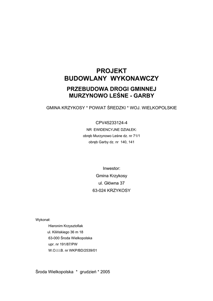 PROJEKT BUDOWLANY WYKONAWCZY PRZEBUDOWA DROGI GMINNEJ MURZYNOWO LEŚNE - GARBY GMINA KRZYKOSY * POWIAT ŚREDZKI * WOJ. WIELKOPOLSKIE CPV45233124-4 NR EWIDENCYJNE DZIAŁEK: obręb Murzynowo Leśne dz. nr 71/1 obręb Garby dz. nr 140, 141 Inwestor: Gmina Krzykosy ul. Główna 37 63-024 KRZYKOSY Wykonał: Hieronim Krzysztofiak ul. Kilińskiego 36 m 18 63-000 Środa Wielkopolska upr. nr 191/87/PW W.O.I.I.B. nr WKP/BD/2539/01 Środa Wielkopolska * grudzień * 2005 OPIS TECHNICZNY DO PROJEKTU BUDOWLANEGO WYKONAWCZEGO PRZEBUDOWA DROGI GMINNEJ MURZYNOWI LEŚNE - GARBY GMINA KRZYKOSY * POWIAT ŚREDZKI WOJEWÓDZTWO WIELKOPOLSKIE 1. Podstawa opracowania Rozporządzenie Ministra Transportu i Gospodarki Morskiej z dnia 2 marca 1999r w sprawie warunków technicznych, jakim powinny odpowiadać drogi publiczne i ich usytuowanie (Dz. U. nr 43 z dnia14 maja 1999r) Katalog Typowych Konstrukcji Nawierzchni Podatnych i Półsztywnych 1997r Mapa sytuacyjno-wysokościowa w skali 1:1000 Pomiary uzupełniające (wysokościowe)w terenie wykonane siłami własnymi Decyzja nr P/7/05 o lokalizacji inwestycji celu publicznego z dnia 20.10.2005r Rozporządzenie Ministra Infrastruktury oraz Spraw Wewnętrznych i Administracji z dnia 31 lipca 2002 roku „w sprawie znaków i sygnałów drogowych” (Dz.U. nr 89 poz. 414) Ustawa z dnia 20 czerwca 1997 roku „Prawo o ruchu drogowym (Dz. U. 98 poz. 602) Katalog powtarzalnych elementów drogowych część I i II – Transprojekt Warszawa 1979 r. Projekt obejmuje przebudowę odcinka drogi gminnej od skrzyżowania z drogą powiatową nr 3675P we wsi Murzynowo Leśne do skrzyżowania z drogą powiatową nr 3671P we wsi Garby. Według uzyskanych informacji teren nie podlega ochronie konserwatora. 2. Stan istniejący. Projektowany odcinek rozpoczyna się od końca nawierzchni bitumicznej przy skrzyżowaniu z drogą powiatową nr 3676P w m. Murzynowo Leśne. Na całej długości projektowanego odcinka droga posiada nawierzchnię gruntową ulepszoną żużlem paleniskowym i kruszywem łamanym. Odcinek początkowy, przebiega przez teren zabudowany, pas drogowy ograniczony jest parkanami. Dalej droga przebiega przez grunty rolnicze i leśne, o rozproszonej zabudowie zagrodowej. Szerokość pasa drogowego od 9,50 m do 15,00 m. Od km 0+000 do km 1+700 i dalej od km2+200 do końca odcinka, wzdłuż drogi, po jej prawej stronie, biegnie napowietrzna linia energetyczna. W koronie drogi znajduje się sieć wodociągowa i kabel telekomunikacyjny. Koniec projektowanego odcinka na skrzyżowaniu z drogą powiatową nr 3671P w m. Garby. 3. Projekt. Droga Murzynowo Leśne –Garby jest drogą gminną i łączy te dwie miejscowości. Dalej poprzez połączenie z drogą powiatową stanowi ciąg do miasta Środa Wielkopolska. Ruch pojazdów ciężarowych jest sporadyczny i związany z bezpośrednią obsługą mieszkańców i transportem rolniczym. Ruch pojazdów ciężarowych zwiększa się w przypadku objazdów związanych np. z kolizjami na drodze krajowej nr 11. Kategoria ruchu Do celów wymiarowania konstrukcji nawierzchni przyjęto ruch KR2, tj. liczba osi obliczeniowych (100 kN) na dobę na pas obliczeniowy - od 13 do 70. Warunki gruntowo-wodne W podłożu występują grunty piaszczyste (piaski drobnoziarniste, piaski pylaste). Istniejąca droga posiada wykształcony korpus drogowy. W miejscach zaniżonych jest wyniesiona ponad teren. Woda gruntowa zalega na głębokości poniżej 1,50 m od poziomu terenu. Warunki wodne podłoża zakwalifikowano jako dobre i przeciętne. Z uwagi na istniejącą ulepszoną nawierzchnię gruntową, która na przeważającej długości zostaje w podłożu pod projektowaną podbudową, rodzaj gruntu i warunki wodne podłoża zaliczono do grupy nośności podłoża G1. Konstrukcja nawierzchni. Przyjęto następującą konstrukcję nawierzchni: - warstwa ścieralna z betonu asfaltowego (KR1-2) grubości 5 cm, - warstwa podbudowy z betonu asfaltowego (KR1-2) grubości 7 cm, - podbudowa pomocnicza z kruszywa łamanego stabilizowanego mechanicznie grubości 20 cm, - podłoże istniejące (żużel, kruszywo łamane, lub grunt niewysadzinowy). Podstawowe parametry techniczne. - klasa drogi L – lokalna, - prędkość projektowa 40 km/h, - szerokość w liniach rozgraniczających 15 m (zachowano stan istniejący 9,50 – 15,00 m), - szerokość jezdni * na odcinku od km 0+000 do km 0+054,73– 5,50 m, * na pozostałym odcinku – 5,00 m (z ew. poszerzeniami na łukach) - szerokość poboczy – 0,75 m – 1,00 m, - spadek poprzeczny jezdni daszkowy 2% (na prostej i łukach poziomych o dużych promieniach) - spadek poprzeczny jezdni na łukach jednostronny 2%-4% - spadek poprzeczny poboczy 6%, - promień łuku poziomego min 40 m, (12 m) - promień łuku pionowego wklęsłego i wypukłego min 600 m. 4. Trasa drogi w planie. Projektowany odcinek rozpoczyna się w km 0+000 przy skrzyżowaniu z drogą powiatową nr 3676P w m. Murzynowo Leśne i kończy się na skrzyżowaniu z drogą powiatową nr 3671 w m Garby. Trasa składa się z 15 odcinków prostych wyokrąglonych łukami kołowymi o promieniach od 12 (skrzyżowanie) do 3000 m. Zmiana szerokości jezdni i spadków poprzecznych odbywa się na długości krzywych przejściowych lub prostych przejściowych. Kąty załamania trasy wynoszą od 0º40’ do 63º20’. Trasę poprowadzono po istniejącym przebiegu drogi gminnej. Punkty charakterystyczne trasy dowiązano do stałych punktów w terenie. Granice opracowania wyznaczają granice własności. Realizacja projektu nie zakłada zajmowania gruntów obcych. 5. Niweleta. Niweletę jezdni zaprojektowano dowiązując ją do punktów stałych tj. do istniejących nawierzchni dróg powiatowych. Na terenie zabudowanym wsi Murzynowo Leśne, niweletę zaprojektowano z dowiązaniem się do istniejących wjazdów i biorąc pod uwagę konieczność odwodnienia. Na pozostałym odcinku niweletę dostosowano do istniejącej niwelety drogi (pozostawiając istniejącą nawierzchnię gr