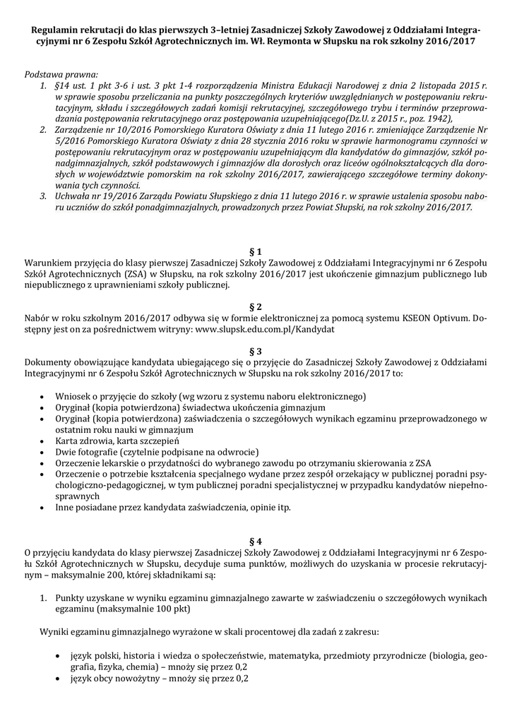 Regulamin rekrutacji do klas pierwszych 3–letniej Zasadniczej Szkoły Zawodowej z Oddziałami Integracyjnymi nr 6 Zespołu Szkół Agrotechnicznych im. Wł. Reymonta w Słupsku na rok szkolny 2016/2017 Podstawa prawna: 1. §14 ust. 1 pkt 3-6 i ust. 3 pkt 1-4 rozporządzenia Ministra Edukacji Narodowej z dnia 2 listopada 2015 r. w sprawie sposobu przeliczania na punkty poszczególnych kryteriów uwzględnianych w postępowaniu rekrutacyjnym, składu i szczegółowych zadań komisji rekrutacyjnej, szczegółowego trybu i terminów przeprowadzania postępowania rekrutacyjnego oraz postępowania uzupełniającego(Dz.U. z 2015 r., poz. 1942), 2. Zarządzenie nr 10/2016 Pomorskiego Kuratora Oświaty z dnia 11 lutego 2016 r. zmieniające Zarządzenie Nr 5/2016 Pomorskiego Kuratora Oświaty z dnia 28 stycznia 2016 roku w sprawie harmonogramu czynności w postępowaniu rekrutacyjnym oraz w postępowaniu uzupełniającym dla kandydatów do gimnazjów, szkół ponadgimnazjalnych, szkół podstawowych i gimnazjów dla dorosłych oraz liceów ogólnokształcących dla dorosłych w województwie pomorskim na rok szkolny 2016/2017, zawierającego szczegółowe terminy dokonywania tych czynności. 3. Uchwała nr 19/2016 Zarządu Powiatu Słupskiego z dnia 11 lutego 2016 r. w sprawie ustalenia sposobu naboru uczniów do szkół ponadgimnazjalnych, prowadzonych przez Powiat Słupski, na rok szkolny 2016/2017. §1 Warunkiem przyjęcia do klasy pierwszej Zasadniczej Szkoły Zawodowej z Oddziałami Integracyjnymi nr 6 Zespołu Szkół Agrotechnicznych (ZSA) w Słupsku, na rok szkolny 2016/2017 jest ukończenie gimnazjum publicznego lub niepublicznego z uprawnieniami szkoły publicznej. §2 Nabór w roku szkolnym 2016/2017 odbywa się w formie elektronicznej za pomocą systemu KSEON Optivum. Dostępny jest on za pośrednictwem witryny: www.slupsk.edu.com.pl/Kandydat §3 Dokumenty obowiązujące kandydata ubiegającego się o przyjęcie do Zasadniczej Szkoły Zawodowej z Oddziałami Integracyjnymi nr 6 Zespołu Szkół Agrotechnicznych w Słupsku na rok szkolny 2016/2017 to: Wniosek o przyjęcie do szkoły (wg wzoru z systemu naboru elektronicznego) Oryginał (kopia potwierdzona) świadectwa ukończenia gimnazjum Oryginał (kopia potwierdzona) zaświadczenia o szczegółowych wynikach egzaminu przeprowadzonego w ostatnim roku nauki w gimnazjum Karta zdrowia, karta szczepień Dwie fotografie (czytelnie podpisane na odwrocie) Orzeczenie lekarskie o przydatności do wybranego zawodu po otrzymaniu skierowania z ZSA Orzeczenie o potrzebie kształcenia specjalnego wydane przez zespół orzekający w publicznej poradni psychologiczno-pedagogicznej, w tym publicznej poradni specjalistycznej w przypadku kandydatów niepełnosprawnych Inne posiadane przez kandydata zaświadczenia, opinie itp. §4 O przyjęciu kandydata do klasy pierwszej Zasadniczej Szkoły Zawodowej z Oddziałami Integracyjnymi nr 6 Zespołu Szkół Agrotechnicznych w Słupsku, decyduje suma punktów, możliwych do uzyskania w procesie rekrutacyjnym – maksymalnie 200, której składnikami są: 1. Punkty uzyskane w wyniku egzaminu gimnazjalnego zawarte w zaświadczeniu o szczegółowych wynikach egzaminu (maksymalnie 100 pkt) Wyniki egzaminu gimnazjalnego wyrażone w skali procentowej dla zadań z zakresu: język polski, historia i wiedza o społeczeństwie, matematyka, przedmioty przyrodnicze (biologia, geografia, fizyka, chemia) – mnoży się przez 0,2 język obcy nowożytny – mnoży się przez 0,2 2. Punkty uzyskane za oceny z języka polskiego i trzech wybranych przez szkołę obowiązkowych zajęć edukacyjnych (maksymalnie 80 pkt) 3. Punkty uzyskane za inne osiągnięcia wymienione na świadectwie ukończenia gimnazjum (maksymalnie 20 pkt) §5 1. Punkty pochodzące z przeliczenia ocen uzyskanych na świadectwie ukończenia gimnazjum, są przyznawane z języka polskiego, oraz wybranych zajęć edukacyjnych, w poszczególnych klasach są to: KLASA ZAWÓD 1 ZK kucharz 1 ZO ogrodnik PUNKTOWANE ZAJĘCIA EDUKACYJNE matematyka, język obcy, technika matematyka, język obcy, technika 2. Punkty są obliczane wg następujących zasad: o stopień celujący – 20 punktów o stopień bardzo dobry – 16 punktów o stopień dobry – 12 punktów o stopień dostateczny – 8 punktów o stopień dopuszczający – 2 punkty §6 1. Punktacji podlegają inne osiągnięcia kandydata wymienione na świadectwie ukończenia gimnazjum. Są to: a) ukończenie gimnazjum z wyróżnieniem – 5 punktów; b) uzyskanie w zawodach wiedzy, będących konkursem o zasięgu ponadwojewódzkim organizowanym przez kuratorów oświaty na podstawie porozumień: tytuł finalisty konkursu przedmiotowego – 10 punktów, tytuł laureata konkursu tematycznego lub interdyscyplinarnego – 7 punktów tytuł finalisty konkursu tematycznego lub interdyscyplinarnego – 5 punktów, c) uzyskanie w zawodach wiedzy będących konkursem o zasięgu międzynarodowym lub ogólnopolskim albo turniejem o zasięgu ogólnopolskim przeprowadzonym zgodnie z przepisami wydanymi na podst. art. 32 ust. 4 i art. 22 ust. 2 pkt 8 ustawy: tytuł finalisty konkursu z przedmiotu lub przedmiotów artystycznych objętych ramowym planem nauczania szkoły artystycznej – 10 punktów tytuł laureata turnieju z przedmiotu lub przedmiotów artystycznych nieobjętych ramowym planem nauczania szkoły artystycznej – 4 punkty tytuł finalisty konkursu z przedmiotu lub przedmiotów artystycznych nieobjętych ramowym planem nauczania szkoły artystycznej – 3 punkty d) uzyskanie w zawodach wiedzy będących konkursem o zasięgu wojewódzkim, organizowanym przez kuratora oświaty: dwóch lub więcej tytułów finalisty konkursu przedmiotowego – 10 punktów dwóch lub więcej tytułów laureata konkursu tematycznego i interdyscyplinarnego – 7 punktów dwóch lub więcej tytułów finalisty konkursu tematycznego i interdyscyplinarnego – 5 punktów tytuł finalisty konkursu przedmiotowego – 7 punktów tytuł laur
