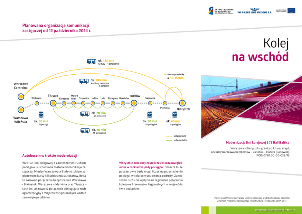 Planowana organizacja komunikacji zastępczej od 12 października 2014 r. Kolej na wschód ok. 180 min IC Busy – 4 połączenia czas na przesiadkę ok. 10-15 min ok. 100 min Warszawa Centralna autobusy zastępcze 8 połączeń Wołomin Tłuszcz Mokra Chrzęsne Wieś Szewnica Jadów Urle Borzymy Barchów Łochów Sadowne Małkinia ok. 70 min Warszawa Wileńska Białystok 26 połączeń ok. 50 min ok. 30 min 52 pociągi 28 pociągów ok. 65 min 8 pociągów ok. 30 min 24 połączenia połączenia IC połączenia KM Warszawa – Białystok – granica z Litwą, etap I, odcinek Warszawa Rembertów – Zielonka – Tłuszcz (Sadowne). POIS.07.01.00-00-038/12 Autobusem w trakcie modernizacji Wzdłuż linii kolejowej z zawieszonym ruchem pociągów uruchomiona zostanie komunikacja zastępcza. Między Warszawą a Białymstokiem zaplanowano kursy kilkudziesięciu autokarów. Będą to zarówno połączenia bezpośrednie Warszawa – Białystok, Warszawa – Małkinia oraz Tłuszcz – Łochów, jak również połączenia obsługujące ruch aglomeracyjny z miejscowości położonych wzdłuż zamkniętego odcinka. Modernizacja linii kolejowej E 75 Rail Baltica Wszystkie autobusy zastępcze zostaną uwzględnione w rozkładzie jazdy pociągów. Oznacza to, że pasażerowie będą mogli liczyć na przesiadkę do pociągu, w celu kontynuowania podróży. Zawieszenie ruchu nie wpłynie na regionalne połączenia kolejowe Przewozów Regionalnych w województwie podlaskim. Projekt współfinansowany przez Unię Europejską ze środków Funduszu Spójności w ramach Programu Operacyjnego Infrastruktura i Środowisko 2007–2013 Dla rozwoju infrastruktury i środowiska Dlaczego modernizujemy linię kolejową Warszawa – Białystok? Linia kolejowa między Warszawą a Białymstokiem należy do najważniejszych tras w Polsce. Ruch między dwoma aglomeracjami systematycznie rośnie. Ważne jest zapewnienie mieszkańcom Białegostoku, Warszawy oraz okolicznych miejscowości szybkiego i sprawnego połączenia. Obecny stan infrastruktury pozwala pociągom jechać z maksymalną prędkością 100 km/h, która – w przypadku niewykonania modernizacji – malałaby z roku na rok. Dzięki wymianie torów składy będą mogły rozpędzić się do 160 km/h. Jakie prace wykonamy w trakcie modernizacji? Zmodernizujemy 66 km linii kolejowej, zbudujemy nowoczesną sieć trakcyjną o długości 183 km. Dla wygody i bezpieczeństwa pasażerów unowocześnimy 15 przystanków oraz 4 stacje. Obiekty zyskają nowe perony z wiatami i urządzeniami do obsługi podróżnych, w tym elektroniczne wyświetlacze do prezentacji komunikatów dla pasażerów oraz nowy system nagłaśniający. Na perony dostać się będzie można nowymi przejściami podziemnymi. W celu zapewnienia dostępu osobom o ograniczonej możliwości poruszania się, zamontowane zostaną windy lub pochylnie. Poza dostosowaniem torów i peronów do najwyższych standardów, wyremontowanych zostanie również 30 przejazdów kolejowo–drogowych. W ramach projektu powstaną też obiekty inżynieryjne, m.in. wiadukt drogowy, 5 wiaduktów kolejowych i 9 przejść pod torami. Co zyskamy dzięki modernizacji? Przeprowadzenie kompleksowej modernizacji na całym odcinku Warszawa – Białystok zapewni szybkie i bezpieczne połączenie kolejowe pomiędzy tymi aglomeracjami. Pociągi rozwiną prędkość do 160 km/h, co pozwoli na skrócenie czasu przejazdu. Zastosowanie nowoczesnych rozwiązań technicznych oraz dostosowanie obiektów do potrzeb osób niepełnosprawnych, zwiększą komfort podróżowania i poprawią bezpieczeństwo pasażerów. Wybudowanie ekranów dźwiękoszczelnych ograniczy hałas i drgania, a zastosowanie nowoczesnej konstrukcji nawierzchni wpłynie pozytywnie nie tylko na wygodę podróżowania, ale również na poprawę życia mieszkańców miejscowości znajdujących się wzdłuż linii kolejowej. Co robimy teraz? Na placu budowy wykonawca zgromadził m.in. 60 tys. podkładów oraz ok. 60 km szyn. Obecnie prowadzone są prace na szlakach: Warszawa Rembertów – Zielonka, Wołomin – Tłuszcz, Tłuszcz – Łochów oraz Łochów – Sadowne. Trwa budowa nowych peronów w Zagościńcu, Klembowie i Jasienicy, a także demontaż mostu na rzece Liwiec. Co robimy, żeby zminimalizować utrudnienia? Przywrócenie dobrej jakości połączeń w jak najkrótszym terminie i minimalne utrudnienia dla pasażerów to plan PKP Polskich Linii Kolejowych S.A. w trakcie modernizacji linii Warszawa – Białystok. Zarządca infrastruktury, w celu przyśpieszenia prac, zawiesi ruch kolejowy na odcinku Tłuszcz – Sadowne. Zamknięcie linii pozwoli skrócić czas robót na tym odcinku o 10 miesięcy. PLK przeprowadziły w tej sprawie konsultacje z przewoźnikami, władzami województwa mazowieckiego i podlaskiego oraz z przedstawicielami samorządu. Nadrzędnym celem wybranego wariantu prowadzenia modernizacji jest jak najszybsze zakończenie prac. Czy wiesz, że na kilometr torów potrzeba: • 120 ton szyn, • 1667 podkładów kolejowych – o wadze ok. 325 kg każdy, • 25 słupów trakcyjnych, PKP Polskie Linie Kolejowe S.A. ul. Targowa 74 | 03-734 Warszawa www.plk-sa.pl | www.plk-inwestycje.pl www.mir.gov.pl | www.cupt.gov.pl | www.pois.gov.pl • ok. 5 000 ton tłucznia i innych materiałów. PUBLIKACJA BEZPŁATNA | STAN: październik 2014 r.