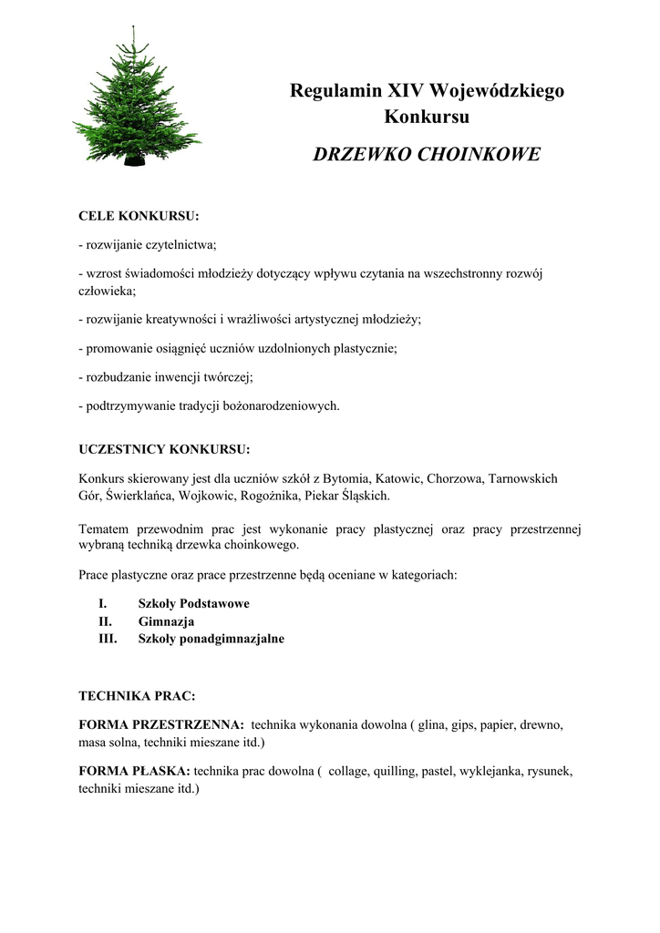 Regulamin XIV Wojewódzkiego Konkursu DRZEWKO CHOINKOWE CELE KONKURSU: - rozwijanie czytelnictwa; - wzrost świadomości młodzieży dotyczący wpływu czytania na wszechstronny rozwój człowieka; - rozwijanie kreatywności i wrażliwości artystycznej młodzieży; - promowanie osiągnięć uczniów uzdolnionych plastycznie; - rozbudzanie inwencji twórczej; - podtrzymywanie tradycji bożonarodzeniowych. UCZESTNICY KONKURSU: Konkurs skierowany jest dla uczniów szkół z Bytomia, Katowic, Chorzowa, Tarnowskich Gór, Świerklańca, Wojkowic, Rogożnika, Piekar Śląskich. Tematem przewodnim prac jest wykonanie pracy plastycznej oraz pracy przestrzennej wybraną techniką drzewka choinkowego. Prace plastyczne oraz prace przestrzenne będą oceniane w kategoriach: I. II. III. Szkoły Podstawowe Gimnazja Szkoły ponadgimnazjalne TECHNIKA PRAC: FORMA PRZESTRZENNA: technika wykonania dowolna ( glina, gips, papier, drewno, masa solna, techniki mieszane itd.) FORMA PŁASKA: technika prac dowolna ( collage, quilling, pastel, wyklejanka, rysunek, techniki mieszane itd.) OPIS: Do każdej pracy powinna być dołączona kartka z opisem: - imię i nazwisko, wiek, dane adresowe, telefon kontaktowy, tytuł pracy - adres szkoły, imię i nazwisko nauczyciela pod kierunkiem, którego powstała praca, telefon kontaktowy. Prace przechodzą na własność organizatorów. TERMIN: Prace należy przesyłać do 12.12.2016r. na adres: Technikum nr 4 im. Marii Skłodowskiej- Curie w Bytomiu ul. Katowicka 35 tel: 32 707 44 60 z dopiskiem XIV Wojewódzki Konkurs „ DRZEWKO CHOINKOWE” lub osobiście w sekretariacie szkoły. ROZSTRZYGNIĘCIE KONKURSU: Nastąpi w dniu 16.12.2016r. o godz. 10.00 Inauguracja zostanie połączona z wystawą nagrodzonych prac. Konkurs objęty jest Patronatem Miejskiej Biblioteki Publicznej w Bytomiu. ORGANIZATORZY: Miejska Biblioteka Publiczna w Bytomiu Technikum nr 4 w Bytomiu
