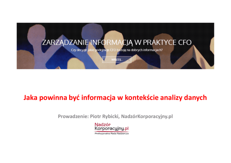 Jaka powinna być informacja w kontekście analizy danych Prowadzenie: Piotr Rybicki, NadzórKorporacyjny.pl Motto na dziś: „Informacja prawdziwa jest to informacja, która wyraża, że tak się rzeczy mają, i rzeczywiście mają się tak właśnie” Definicje Informacja pochodzi od łacińskiego słowa „informatio” i oznacza wyobrażenie, wyjaśnienie, zawiadomienie, w mowie potocznej zaś – jakąkolwiek wiadomość. Informacja to zbiór faktów, zdarzeń, cech. Informacja to transformacja jednego komunikatu w drugi komunikat. Informacja to wiedza przekazywana przez innych lub pozyskana przez obserwacje, studia, badania. Informacja to czynnik wykorzystywany do bardziej sprawnego, efektywnego i celowego działania. Informacja krytyczna – taka informacja, która musi być wykorzystana w procesie decyzyjnym Słowo „analiza” pochodzi od greckiego „analysis” i oznacza rozluźnienie, rozwiązanie, rozłożenie. Analiza to rozłożenie całości na składniki, elementy i badanie poszczególnych właściwości rzeczy lub zjawiska. Różnica między informacją a analizą: - informacja to proste stwierdzenie faktu, - analiza to odpowiedź na pytanie „jakie ma znaczenie” informacja i jak mamy na nią zareagować? Analiza informacji (danych) to sztuka budowania obrazów całości na podstawie oddzielnych fragmentów, interpretacji danych, wyciągania wniosków, tworzenia prognoz i scenariuszy rozwoju wydarzeń. Celem analizy jest wyposażenie odbiorcy w niezbędny do podjęcia optymalnej decyzji maksymalny zasób wiedzy. Cechy idealnej informacji Cechy idealnej informacji: • aktualność (dostępna we właściwym czasie, on-line), • agregacja i dokładność (dostępna syntetycznie w układzie oczekiwanym przez odbiorcę), • celowość (zgodna z oczekiwaniem), • wartość i decyzyjność (informacja niezbędna w procesie decyzyjnym), • jednoznaczność (treść bez wątpliwości), • komunikatywność (ilość czasu niezbędna do jej nadania i odbioru), • pełność (brak niepewności u odbiorcy), • porównywalność (w oczekiwanym przez odbiorcę formacie), • prawdziwość i wiarygodność (zgodność ze stanem rzeczywistym), • precyzyjność (użycie właściwej terminologii), • rzetelność (brak zniekształceń), • źródłowość (pochodzenie informacji ze znanego źródła). Paradoks: Nadmiar danych! (nadmiar informacji może prowadzić do porażki) Największy problem: CZAS! (a w zasadzie jego brak) Selekcja informacji: • Podczas procesu określania swoich zapotrzebowań informacyjnych, precyzowania pytań i dokonywania selekcji informacji analityk łatwo może wpaść w pułapkę „wiedzieć więcej”. Zbyt duża ilość informacji tworzy „szum informacyjny”, który powoduje, że analityk zaczyna pracować nieefektywnie lub też wywołuje prawdziwy „paraliż informacyjny”, który wręcz uniemożliwia pracę. Wartość informacji: • Informacja nigdy nie jest za darmo, koszt jej uzyskania jest zawsze wyższy od zera. Analiza przy braku odpowiedniej ilości informacji: • bardzo często analityk staje wobec wyboru – czy czekać na zdobycie danych, czy próbować dokonać analizy przy braku ich odpowiedniej ilości. Strategiczne zarządzanie zasobami informacyjnymi to: • określenie systemu informacyjnego oraz potrzeb informacyjnych organizacji, • stworzenie standardów przygotowania informacji wewnętrznej i zewnętrznej, • określenie standardów operowania informacją na różnych etapach jej „życia”, • dobór odpowiednich technik informacyjnych, • dobór odpowiedniego personelu, • zabezpieczanie informacji przed nieuprawnionym dostępem lub utratą, • umożliwienie zastosowania informacji do procesu zarządzania. Odbiorcy danych: • Odbiorca danych powinien zostać precyzyjnie określony i nigdy nie powinno być wątpliwości kto nim jest. Dystrybucja: • Analiza dostarczona nieodpowiedniemu odbiorcy jest bezużyteczna, podobnie jak analiza dostarczona właściwemu odbiorcy w niewłaściwym czasie. Dezinformacja: • taki sposób przekazania informacji prawdziwej lub fałszywej, który wprowadza w błąd i czasami wymusza na nim określone działanie. Może to być działanie świadome lub nieświadome. Dziękuję za uwagę