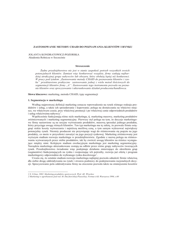 ZASTOSOWANIE METODY CHAID DO POZNAWANIA KLIENTÓW I RYNKU JOLANTA KONDRATOWICZ-POZORSKA Akademia Rolnicza w Szczecinie Streszczenie ĩadne przedsiĊbiorstwo nie jest w stanie zaspokoiü potrzeb wszystkich swoich potencjalnych klientów. Zamiast wiĊc konkurowaü wszĊdzie, firmy szukają najbardziej atrakcyjnej grupy nabywców lub obszaru, który obsłuĪą lepiej niĪ konkurenci. W pracy pod tytułem ,,Zastosowanie metody CHAID do poznawania klientów i rynku’’ przedstawiono praktyczne zastosowanie jednej z wielu metod iloĞciowych do segmentacji klientów firmy ,,A’’. Zastosowanie tego instrumentu pozwala na poznanie klientów oraz sprecyzowanie i ukierunkowanie działaĔ producenta/handlowca. Słowa kluczowe: marketing, metoda CHAID, typy segmentacji 1. Segmentacja w marketingu Według najprostszej definicji marketing oznacza wprowadzenie na rynek rónego rodzaju produktów i usług, a take ich sprzedawanie i kupowanie; polega na dostarczaniu na właciwe miejsce, we właciwym czasie, przy właciwej promocji i po właciwej cenie odpowiednich produktów i usług właciwemu nabywcy1. Współczenie funkcjonuj róne style marketingu, tj. marketing masowy, marketing produktów zrónicowanych i marketing segmentacyjny. Pierwszy styl polega na tym, e decyzje marketingowe firmy nastawione s na seryjne wytwarzanie produktów, masow sprzeda jednego produktu, który przyciga uwag rónych klientów. Ten typ marketingu ma t zalet, e pozwala firmie osign niskie koszty wytwarzania i najnisz moliw cen, a tym samym wykreowa najwikszy potencjalny rynek. Niestety producent nie przywizuje wagi do rónicowania si popytu na jego produkty, co moe w przyszłoci zaway na jego pozycji rynkowej. Marketing zrónicowany jest wyszym stadium rozwoju marketingu w przedsibiorstwie. Zgodnie z nazw polega na rónicowaniu wytwarzanych przez siebie produktów, tak by zwróci uwag klientów na rónice wystpujce midzy nimi. Kolejnym stadium ewolucyjnym marketingu jest marketing segmentacyjny. Narzdzia marketingu ukierunkowane zostaj na odbiór przez róne grupy nabywców tworzcych rynek. Przedsibiorstwo wiadomie wic podejmuje działania zmierzajce do okrelenia grup (segmentów) funkcjonujcych na rynku i rozpoznajc ich potrzeby, rozwija ju ofert i program marketingowy odpowiednio do wybranego rynku docelowego2. Uwaa si, e ostatnie stadium rozwoju marketingu najlepiej pozwala odnale firmie właciw dla siebie drog oddziaływania na rynek i stwarza podstawy do podejmowania racjonalnych decyzji. Sprecyzowanie pola oddziaływania firmy na otoczenie pozwala take na zmniejszenie kosztów 1 S. Urban, 2002. Marketing produktów spoĪywczych. Wyd. AE. Wrocław 2 Marketing w agrobiznesie pod red. M. Duczkowskiej-Piaseckiej. Format A-B, Warszawa 1996, s.60 16 Jolanta Kondratowicz-Pozorska Zastosowanie metody CHAID do poznawania klientów i rynku funkcjonowania firmy, a przede wszystkim kosztów zwizanych z modyfikacj produktów, kanałów dystrybucji, promocj, itd. W badaniach marketingowych znane s liczne metody poznawania rynku, podziału na segmenty lub słuce pogłbianiu wiedzy o klientach. Praktykom zaley jednak, by uyte metody były proste technicznie, ale bogate w wyniki i łatwe do interpretacji. Z tego to punktu widzenia do niniejszej pracy wybrano metod CHAID, jako narzdzie spełniajce te oczekiwania. 2. Metoda CHAID jako narzdzie segmentacji odbiorców firmy ,,A’’ Istota segmentacji rynku sprowadza si do dywersyfikacji polityki sprzeday wobec rónych grup nabywców. Potrzeba segmentacji jest wynikiem uznania, i odbiorcy, na których nakierowane s działania marketingowe firmy, tworz odrbne pod wzgldem atrakcyjnoci ekonomicznej grupy. Grupy te róni si struktur potrzeb oraz sposobem ich zaspokajania. Dostrzeganie tych odmiennoci wymusza uwzgldnienie ich w realizowanej polityce marketingowej firmy3. Inna definicja segmentacji4 mówi, e jest to podział badanej struktury na jednorodne obszary, w których zrónicowanie midzy obiektami ze wzgldu na poszczególne cechy jest mniejsze anieli pomidzy tymi obszarami. Procedura segmentacji obejmuje 4 rodzaje prac. S to: ¾ Zdefiniowanie kryteriów segmentacji, ¾ Okrelenie tzw. zmiennych profilowych, czyli cech, które bd charakteryzowały okrelone segmenty. ¾ Wyznaczenie segmentów. ¾ Profilowanie wyznaczonych segmentów na podstawie wczeniej wybranych deskryptorów. Tematem dalszych rozwaa bdzie okrelenie tzw. zmiennych profilowych i ich roli w kształtowaniu przynalenoci jednostek do poszczególnych grup (segmentów). 2.1. Metoda badawcza Zmienne profilowe odpowiadaj na pytanie, kim s konsumenci zgrupowani w jeden segment ze wzgldu na przyjte kryterium segmentacji. Zmienne te powinny mie okrelone własnoci: 1. by silnie powizane z przyjtym kryterium segmentacji (wówczas kryterium to zmienna zalena, zmienna profilowa – zmienna niezalena) 2. by czytelne i uyteczne w działaniach marketingowych przedsibiorstwa. Analiza segmentacyjna moe by prowadzona za pomoc: analizy dyskryminacji, regresji logistycznej i metoda detekcji interakcji AID. W przypadku, gdy zmienna zalena jest typu nominalnego lub porzdkowego (jak w przypadku podjtych przez autork bada) analiza przebiega zgod2 nie z zasadami pomiaru zalenoci za pomoc statystyki i badania jej istotnoci. Taka procedu2 ra nosi nazw metody automatycznej detekcji interakcji za pomoc statystyki (CHAID). Warunkiem stosowania tej metody jest dysponowanie zmienn zalen typu nominalnego. Zmienne niezalene mog by dowolnego typu. Procedura postpowania składa si z etapów: 3 M. Rószkiewicz, 2002. Metody iloĞciowe w badaniach marketingowych. PWN, Warszawa. 4 S. Mynarski, 1995. Badania rynkowe w warunkach konkurencji. Fogra, Kraków. POLSKIE STOWARZYSZENIE ZARZĄDZANIA WIEDZĄ Seria: Studia i Materiały, nr 14, 2008 a) 17 dla wyrónionych kategorii zmiennej zalenej oraz kadej z wybranych zmiennych nieza, odpowiadajcych i-tej kategorii zmiennej zalenej lenych wyznaczenie liczebnoci ij n i j-tej kategorii zmiennej niezalenej. b) ocena za