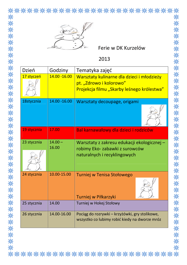 Ferie w DK Kurzelów 2013 Dzień Godziny Tematyka zajęć 17 styczeń 14.00 -16.00 Warsztaty kulinarne dla dzieci i młodzieży pt. „Zdrowo i kolorowo” Projekcja filmu „Skarby leśnego królestwa” 18stycznia 14.00 -16.00 Warsztaty decoupage, origami 19 stycznia 17.00 Bal karnawałowy dla dzieci i rodziców 23 stycznia 14.00 – 16.00 Warsztaty z zakresu edukacji ekologicznej – robimy Eko- zabawki z surowców naturalnych i recyklingowych 24 stycznia 10.00-15.00 Turniej w Tenisa Stołowego Turniej w Piłkarzyki 25 stycznia 14.00 Turniej w Hokej Stołowy 26 stycznia 14.00-16.00 Pociąg do rozrywki – krzyżówki, gry stolikowe, wszystko co lubimy robić kiedy na dworze mróz
