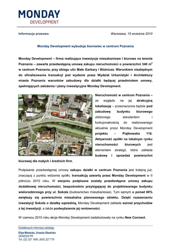 Informacja prasowa Warszawa, 15 września 2010 Monday Development wybuduje biurowiec w centrum Poznania Monday Development – firma realizująca inwestycje mieszkaniowe i biurowe na terenie Poznania – zawarła przedwstępną umowę zakupu nieruchomości o powierzchni 340 m2 w centrum Poznania, przy zbiegu ulic Małe Garbary i BóŜnicza. Warunkiem niezbędnym do sfinalizowania transakcji jest wydanie przez Wydział Urbanistyki i Architektury miasta Poznania warunków zabudowy dla działki będącej przedmiotem umowy, spełniających załoŜenia i plany inwestycyjne Monday Development. Nieruchomość w centrum Poznania – ze względu na jej atrakcyjną lokalizację – przeznaczona będzie pod zabudowę budynku biurowego zbliŜonego standardem funkcjonalnością do i realizowanego aktualnie przez Monday Development projektu – Piątkowska 116. Aktywność spółki na lokalnym rynku nieruchomości elementem budowę biurowych strategii, i sprzedaŜ która jest zakłada powierzchni biurowej dla małych i średnich firm. Podpisanie przedwstępnej umowy zakupu działki w centrum Poznania jest kolejną juŜ, znaczącą z punktu widzenia spółki, transakcją zawartą przez Monday Development w II półroczu 2010 roku. W sierpniu podpisane zostały przedwstępne umowy zakupu dodatkowej nieruchomości, bezpośrednio przylegającej do projektowanego budynku wielorodzinnego przy ul. Sokoła (budownictwo mieszkaniowe). Tym samym o ponad 60% zwiększy się powierzchnia mieszkalna planowanego obiektu. Dzięki rozszerzeniu inwestycji Sokoła o działkę sąsiednią, Monday Development zakłada wzrost przychodów z tej inwestycji, a takŜe podwyŜszenie jej rentowności. W czerwcu 2010 roku akcje Monday Development zadebiutowały na rynku New Connect. Dodatkowych informacji udzielają: Eliza Misiecka, Urszula Głowicka GENESIS PR Tel. (22) 327 1690, (605) 227 779 *** Monday Development realizuje deweloperskie inwestycje mieszkaniowe, biurowe i gruntowe na terenie Poznania. W ramach swojej działalności spółka prowadzi pełny proces inwestycyjny – od pozyskania gruntu, przez jego przekształcenie, uzyskanie niezbędnych pozwoleń, nadzór inwestorski nad wykonawcą, aŜ po komercjalizację przedsięwzięcia. Obecnie Monday Development realizuje 6 projektów na róŜnych etapach zaawansowania: • Piątkowska – budynek biurowy w dzielnicy Piątkowo, zakończenie inwestycji: grudzień 2010 • Sokoła – inwestycja mieszkaniowa w pobliŜu Parku Sołackiego, zakończenie inwestycji: I połowa 2012 • Strzeszyn – deweloperka gruntowa, zakończenie inwestycji: IV kwartał 2012 • Botaniczna – zespół budynków mieszkalnych, sąsiadujący z ogrodem Botanicznym, planowany termin zakończenia inwestycji: 2013/2014 • Rataje – osiedle mieszkaniowe w pobliŜu jeziora Malta, zakończenie inwestycji planowane na 2015 rok • BóŜnicza/Małe Garbary – budynek biurowy w centrum Poznania www.mondaydevelopment.pl Dodatkowych informacji udzielają: Eliza Misiecka, Urszula Głowicka GENESIS PR Tel. (22) 327 1690, (605) 227 779