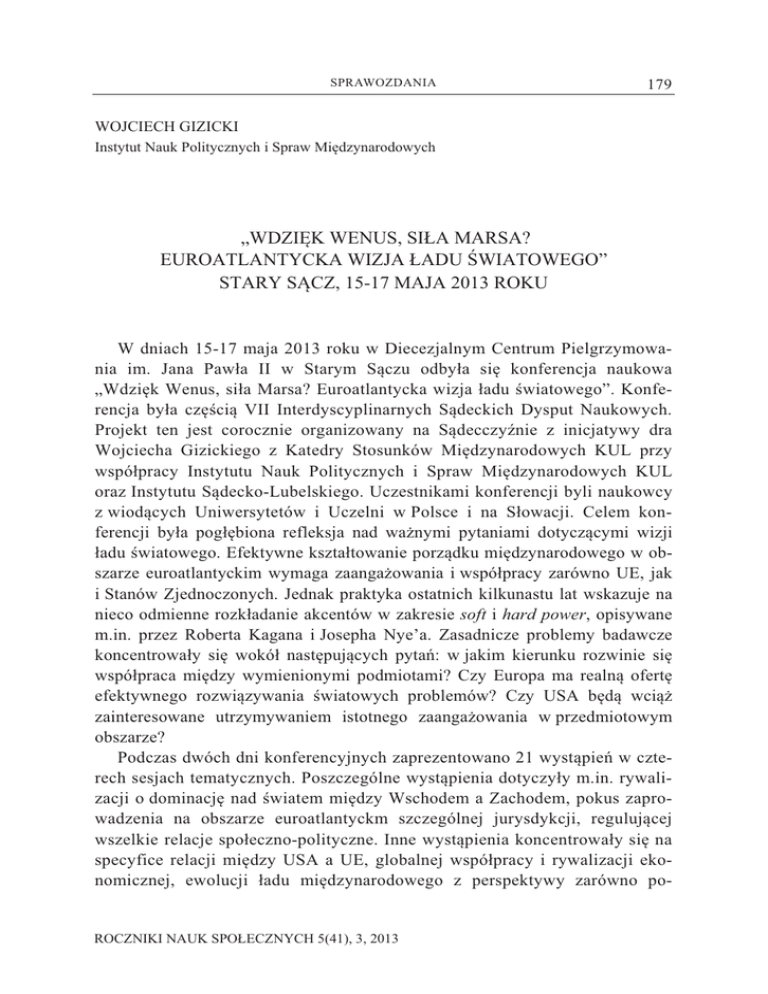 SPRAWOZDANIA 179 WOJCIECH GIZICKI Instytut Nauk Politycznych i Spraw Midzynarodowych „WDZIK WENUS, SIA MARSA? EUROATLANTYCKA WIZJA ADU WIATOWEGO” STARY SCZ, 15-17 MAJA 2013 ROKU W dniach 15-17 maja 2013 roku w Diecezjalnym Centrum Pielgrzymowania im. Jana Pawa II w Starym Sczu odbya si konferencja naukowa „Wdzik Wenus, sia Marsa? Euroatlantycka wizja adu wiatowego”. Konferencja bya czci VII Interdyscyplinarnych Sdeckich Dysput Naukowych. Projekt ten jest corocznie organizowany na Sdecczy nie z inicjatywy dra Wojciecha Gizickiego z Katedry Stosunków Midzynarodowych KUL przy wspópracy Instytutu Nauk Politycznych i Spraw Midzynarodowych KUL oraz Instytutu Sdecko-Lubelskiego. Uczestnikami konferencji byli naukowcy z wiodcych Uniwersytetów i Uczelni w Polsce i na Sowacji. Celem konferencji bya pogbiona refleksja nad wanymi pytaniami dotyczcymi wizji adu wiatowego. Efektywne ksztatowanie porzdku midzynarodowego w obszarze euroatlantyckim wymaga zaangaowania i wspópracy zarówno UE, jak i Stanów Zjednoczonych. Jednak praktyka ostatnich kilkunastu lat wskazuje na nieco odmienne rozkadanie akcentów w zakresie soft i hard power, opisywane m.in. przez Roberta Kagana i Josepha Nye’a. Zasadnicze problemy badawcze koncentroway si wokó nastpujcych pyta: w jakim kierunku rozwinie si wspópraca midzy wymienionymi podmiotami? Czy Europa ma realn ofert efektywnego rozwizywania wiatowych problemów? Czy USA bd wci zainteresowane utrzymywaniem istotnego zaangaowania w przedmiotowym obszarze? Podczas dwóch dni konferencyjnych zaprezentowano 21 wystpie w czterech sesjach tematycznych. Poszczególne wystpienia dotyczyy m.in. rywalizacji o dominacj nad wiatem midzy Wschodem a Zachodem, pokus zaprowadzenia na obszarze euroatlantyckm szczególnej jurysdykcji, regulujcej wszelkie relacje spoeczno-polityczne. Inne wystpienia koncentroway si na specyfice relacji midzy USA a UE, globalnej wspópracy i rywalizacji ekonomicznej, ewolucji adu midzynarodowego z perspektywy zarówno po- ROCZNIKI NAUK SPOECZNYCH 5(41), 3, 2013 SPRAWOZDANIA 180 szczególnych pastw, jak i organizacji midzynarodowych. Cenne byy zwaszcza burzliwe i twórcze dyskusje nad poszczególnymi referatami. Day one moliwo doprecyzowania i zweryfikowania postawionych pyta i tez badawczych. Uczestnikami konferencji byli równie studenci politologii KUL, którzy mieli okazj nabycia praktycznych dowiadcze zwizanych z pomoc przy organizacji takiego wydarzenia, jak równie zaangaowania w dyskusj. Po zakoczeniu konferencji w ramach wizyty naukowej studenci zwiedzili Karpacki Oddzia Stray Granicznej im. I Puku Strzelców Podhalaskich w Nowym Sczu. Placówka ta jest wietnie wyposaona i przygotowana do wielu dziaa zwizanych z ochron granic i wsparcia bezpieczestwa pastwa. Szczególnie cenna dydaktycznie i praktycznie bya moliwo zapoznania si z charakterem pracy grupy bojowej do zada specjalnych, majcej na koncie wiele udanych akcji m.in. przeciwko przestpczoci zorganizowanej. BEATA PISKORSKA Instytut Nauk Politycznych i Spraw Midzynarodowych „WSPÓPRACA TRANSATLANTYCKA. ASPEKTY POLITYCZNE, EKONOMICZNE I SPOECZNO-KULTUROWE” LUBLIN, 7 CZERWCA 2013 ROKU W dniu 7 czerwca 2013 r. w auli Instytutu Nauk Politycznych i Spraw Midzynarodowych Katolickiego Uniwersytetu Lubelskiego Jana Pawa II odbya si konferencja naukowa „Wspópraca transatlantycka. Aspekty polityczne, ekonomiczne i spoeczno-kulturowe”. Konferencja zorganizowana zostaa przez Centrum Naukowe Instytutu Studiów Politycznych Polskiej Akademii Nauk i Uczelni azarskiego, Instytut Gospodarki Amerykaskiej i Stosunków Transatlantyckich Uczelni azarskiego oraz Instytut Nauk Politycznych i Spraw Midzynarodowych KUL przy wsparciu Fundacji Rozwoju KUL ROCZNIKI NAUK SPOECZNYCH 5(41), 3, 2013
