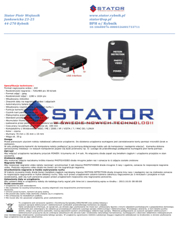 Stator Piotr Wojtasik Jankowicka 23-25 44-270 Rybnik www.stator.rybnik.pl [email protected] BPH o/ Rybnik 10-10600076-0000326001733711 Specyfikacja techniczna : Format nagrywania wideo : AVI - Rozdzielczość nagrania : 720x480 pix 30 kl/sek - Format zdjęć : jpeg - Rozdzielczość zdjęć : 1280 x 1024 pix - Wbudowany mikrofon - Znacznik daty na nagraniach wideo i zdjęciach - Automatyczny balans bieli - Wbudowany czujnik ruchu ( detektor ruchu ) - Funkcja kamerki internetowej - Czytnik kart pamięci micro SD - Maksymalna pojemność kart 16 GB - Standard przyłączeniowy : USB 1.1 i 2.0 - Akumulator litowo-jonowy 260 mAh - Ładowanie przez ports USB z komputera lub ładowarką przez gniazdko elektryczne( ładowarka do kupienia na innej aukcji) - Czas pracy na pełnym akumulatorze ok. 100 min - Kompatybilny z Windows98 / 98SE / ME / 2000 / XP / VISTA / 7 / MAC OS / LINUX - Kolor : czarny - Wymiary 70 mm x 35 mm x 19 mm - Waga ok. 35 g Uwaga Przed pierwszym użyciem należy naładować całkowicie urządzenie. Do działania urządzenia wymagane jest zainstalowanie karty pamięci microSD (brak w zestawie). W celu podłączenia kamerki do komputera należy podłączyć ją za pomocą dołączonego kabla usb do komputera i następnie właczyć. Kamerka dokona samoczynnej instalacji i w naszym komputerze pojawi się dysk przenośny np. G: (uwaga do prawidłowego podłączenia wymagana jest karta pamięci. Zał/wył Aby włączyć urządzenie naciskamy przycisk POWER i trzymamy ok 3-4 sek. Po włączeniu dioda zapali się światłem ciągłym i urządzenie przejdzie w stan czuwania. Zrobienie zdjęć Aby wykonać zdjęcie naciskamy krótko klawisz PHOTO/VIDEO dioda mrugnie jeden raz i oznacza to iż zdjęcie zostało zrobione Nagranie Video Aby rozpocząć nagranie video należy nacisnąć i przytrzymać 3 sek klawisz PHOTO?VIDEO dioda mrugnie 3 razy i zgaśnie, oznacza to rozpoczęcie nagrania video. Podczas nagrania video dioda nie świeci ani nie sygnalizuje nagrania. Uruchomienie nagrania w trybie wykrywania ruchu W trakcie czuwania kiedy dioda świeci światłem ciągłym naciskamy klawisz MOTION DETECTION dioda mrugnie trzy razy i następnie raz na niebiesko oznacza to rozpoczęcie nagrywania w trybie detekcji ruchu. Gdy ruch przed urządzeniem ustanie kamera zakończy nagrywanie po 3 minutach i przejdzie w tryb oczekiwania, jeśli się ruch ponownie pojawi przed urządzeniem rozpocznie ona nagrywanie ponownie. Ustawienie daty w urządzeniu Aby ustawić datę w urządzeniu należy do katalogu karty wgrać plik time.txt z zawartością wpisu w środku : 2013.10.01 00:00:00 Środki ostrożności: • Urządzenie nie jest wodoodporne • Nie wystawiać na wysoką temperaturę, wysoką wilgotność oraz bezpośrednie promieniowanie słoneczne. • Chronić przed kurzem, dymem lub parą wodną. • Nie pozwól aby żadne małe elementy znalazły się w urządzeniu. • Nie umieszczaj na niestabilnym podłożu. • Nie rzucać aby nie upuszczać urządzenia, grozi uszkodzeniem. To urządzenie jest oznaczone zgodnie z Dyrektywą Europejską 2002/96/WE oraz polską Ustawą o zużytym sprzęcie elektrycznym i elektronicznym symbolem przekreślonego kontenera na odpady. Takie oznakowanie informuje, że sprzęt ten, po okresie jego użytkowania nie może być umieszczany łącznie z innymi odpadami pochodzącymi z gospodarstwa domowego. Użytkownik jest zobowiązany do oddania go prowadzącym zbieranie zużytego sprzętu elektrycznego i elektronicznego. Prowadzący zbieranie, w tym lokalne punkty zbiórki, sklepy oraz gminne jednostki, tworzą odpowiedni system umożliwiający oddanie tego sprzętu. Właściwe postępowanie ze zużytym sprzętem elektrycznym i elektronicznym przyczynia się do uniknięcia szkodliwych dla zdrowia ludzi i środowiska naturalnego konsekwencji, wynikających z obecności składników niebezpiecznych oraz niewłaściwego składowania i przetwarzania takiego sprzętu. W urządzeniu ograniczono niektóre substancje mogące negatywnie oddziaływać na środowisko w okresie użytkowania tego urządzenia oraz po jego zakończeniu.