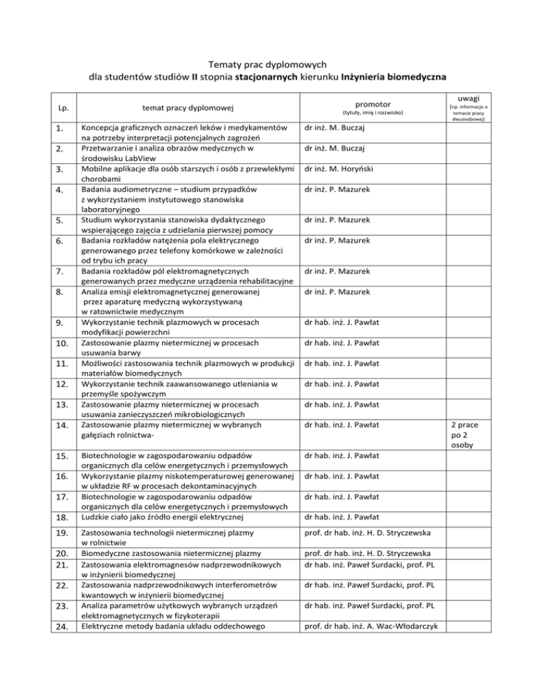 Tematy prac dyplomowych dla studentów studiów II stopnia stacjonarnych kierunku Inżynieria biomedyczna Lp. 1. 2. 3. 4. 5. 6. 7. 8. 9. 10. 11. 12. 13. 14. 15. 16. 17. 18. 19. 20. 21. 22. 23. 24. temat pracy dyplomowej promotor (tytuły, imię i nazwisko) Koncepcja graficznych oznaczeń leków i medykamentów na potrzeby interpretacji potencjalnych zagrożeń Przetwarzanie i analiza obrazów medycznych w środowisku LabView Mobilne aplikacje dla osób starszych i osób z przewlekłymi chorobami Badania audiometryczne – studium przypadków z wykorzystaniem instytutowego stanowiska laboratoryjnego Studium wykorzystania stanowiska dydaktycznego wspierającego zajęcia z udzielania pierwszej pomocy Badania rozkładów natężenia pola elektrycznego generowanego przez telefony komórkowe w zależności od trybu ich pracy Badania rozkładów pól elektromagnetycznych generowanych przez medyczne urządzenia rehabilitacyjne Analiza emisji elektromagnetycznej generowanej przez aparaturę medyczną wykorzystywaną w ratownictwie medycznym Wykorzystanie technik plazmowych w procesach modyfikacji powierzchni Zastosowanie plazmy nietermicznej w procesach usuwania barwy Możliwości zastosowania technik plazmowych w produkcji materiałów biomedycznych Wykorzystanie technik zaawansowanego utleniania w przemyśle spożywczym Zastosowanie plazmy nietermicznej w procesach usuwania zanieczyszczeń mikrobiologicznych Zastosowanie plazmy nietermicznej w wybranych gałęziach rolnictwa- dr inż. M. Buczaj Biotechnologie w zagospodarowaniu odpadów organicznych dla celów energetycznych i przemysłowych Wykorzystanie plazmy niskotemperaturowej generowanej w układzie RF w procesach dekontaminacyjnych Biotechnologie w zagospodarowaniu odpadów organicznych dla celów energetycznych i przemysłowych Ludzkie ciało jako źródło energii elektrycznej dr hab. inż. J. Pawłat Zastosowania technologii nietermicznej plazmy w rolnictwie Biomedyczne zastosowania nietermicznej plazmy Zastosowania elektromagnesów nadprzewodnikowych w inżynierii biomedycznej Zastosowania nadprzewodnikowych interferometrów kwantowych w inżynierii biomedycznej Analiza parametrów użytkowych wybranych urządzeń elektromagnetycznych w fizykoterapii Elektryczne metody badania układu oddechowego prof. dr hab. inż. H. D. Stryczewska uwagi (np. informacje o temacie pracy dwuosobowej) dr inż. M. Buczaj dr inż. M. Horyński dr inż. P. Mazurek dr inż. P. Mazurek dr inż. P. Mazurek dr inż. P. Mazurek dr inż. P. Mazurek dr hab. inż. J. Pawłat dr hab. inż. J. Pawłat dr hab. inż. J. Pawłat dr hab. inż. J. Pawłat dr hab. inż. J. Pawłat dr hab. inż. J. Pawłat dr hab. inż. J. Pawłat dr hab. inż. J. Pawłat dr hab. inż. J. Pawłat prof. dr hab. inż. H. D. Stryczewska dr hab. inż. Paweł Surdacki, prof. PL dr hab. inż. Paweł Surdacki, prof. PL dr hab. inż. Paweł Surdacki, prof. PL prof. dr hab. inż. A. Wac-Włodarczyk 2 prace po 2 osoby 25. 26. 27. 28. 29. 30. 31. 32. 33. 34. 35. 36. 37. 38. 39. 40. 41. 42. 43. 44. 45. 46. 47. 48. 49. 50. 51. 52. 53. 54. Stan obecny i perspektywy rozwoju w dziedzinie biopomiarów Zagrożenie personelu oddziaływaniem EM aparatury medycznej Fantomy do testowania systemów obrazowania medycznego Czytniki biometryczne - zasada działania, właściwości, zastosowania Praktyczne metody zmniejszania wpływu oddziaływań elektromagnetycznych na człowieka Rekonstrukcja widm w spektroskopii. Estymacja zawartości stężeń wybranych substancji na podstawie widm spektrometrycznych Mieszaniny gaussowskie w zastosowaniu do analizy widm spektrometrycznych. Metody zliczania i klasyfikacji wybranych obiektów w obrazach biomedycznych z wykorzystaniem platformy ImageJ Badanie wpływu szumów w obrazach MRI i CT na dokładność detekcji krawędzi Algorytmy automatycznego wyrównywania kontrastu w obrazach CLSM System rozpoznawanie osób działający w czasie rzeczywistym (2 osoby) Analiza porównawcza objętości komór rogowych na podstawie wyników badań MRI Porównanie wzmocnienia kontrastowego w konwencjonalnym MR i angio-MR Analiza grubości kory mózgowej w diagnostyce SM Metody optycznej diagnostyki krwi Zastosowanie spektrofotometrii w dermatologii. Zastosowanie spektrofotometrii w onkologii. Optyczne właściwości i modele skóry. Modele impedancji skóry. Zastosowanie termografii w medycynie. Badanie wpływu funkcji skalujących na wyznaczenie krawędzi w obrazach CT z zastosowaniem metody ChanVese Porównanie segmentacji teksturalnej i morfologicznej obrazów medycznych w badaniu osteoporozy Cyfrowa analiza danych w przetwarzaniu sygnału EKG Analiza porównawcza cech teksturalnych obrazów medycznych Opracowanie i wykonanie stanowiska do badania czujników cząstkowej rezerwy przepływu wieńcowego. Budowa stanowiska pomiarowego do pulsoksymetrii Badania parametrów stochastycznych natężenia prądu jonowego w spektrometrze mas. Układ nadzorowania aktywności ruchowej pacjenta z zastosowaniem mikromechanicznego akcelerometru 3D. prof. dr hab. inż. A. Wac-Włodarczyk Algorytmy przetwarzania sygnału czujnika fotopletyzmograficznego z przetwornikiem światłoczęstotliwość. Dr inż. Eligiusz Pawłowski prof. dr hab. inż. A. Wac-Włodarczyk prof. dr hab. inż. A. Wac-Włodarczyk prof. dr hab. inż. A. Wac-Włodarczyk prof. dr hab. inż. A. Wac-Włodarczyk dr inż. Sławomir Cięszczyk dr inż. Sławomir Cięszczyk dr inż. Sławomir Cięszczyk dr inż. Tomasz Ławicki dr inż. Tomasz Ławicki dr inż. Tomasz Ławicki Prof. A. Kotyra Prof. A. Kotyra Prof. A. Kotyra Prof. A. Kotyra Prof. O. Hotra Prof. O. Hotra Prof. O. Hotra Prof. O. Hotra Prof. O. Hotra Prof. O. Hotra Dr inż. W. Surtel Dr inż. W. Surtel Dr inż. W. Surtel Dr inż. W. Surtel Dr inż. W. Surtel Dr inż. W. Surtel Dr hab. inż. Jarosław Sikora, prof. PL Dr inż. Eligiusz Pawłowski 55. Algorytmy do analizy zmienności rytmu serca w środowisku LabVIEW. Dr inż. Eligiusz Pawłowski 56. Badania układów tłumieni
