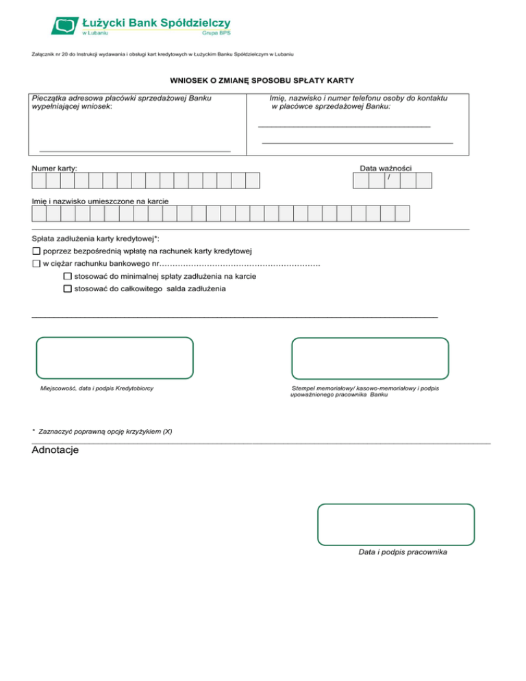 Załącznik nr 20 do Instrukcji wydawania i obsługi kart kredytowych w Łużyckim Banku Spółdzielczym w Lubaniu WNIOSEK O ZMIANĘ SPOSOBU SPŁATY KARTY Pieczątka adresowa placówki sprzedażowej Banku wypełniającej wniosek: Imię, nazwisko i numer telefonu osoby do kontaktu w placówce sprzedażowej Banku: _______________________________________ Data ważności / Numer karty: Imię i nazwisko umieszczone na karcie Spłata zadłużenia karty kredytowej*: poprzez bezpośrednią wpłatę na rachunek karty kredytowej w ciężar rachunku bankowego nr……………………………………………………. stosować do minimalnej spłaty zadłużenia na karcie stosować do całkowitego salda zadłużenia ____________________________________________________________________________________________ Miejscowość, data i podpis Kredytobiorcy Stempel memoriałowy/ kasowo-memoriałowy i podpis upoważnionego pracownika Banku * Zaznaczyć poprawną opcję krzyżykiem (X) ________________________________________________________________________________________________________ Adnotacje Data i podpis pracownika