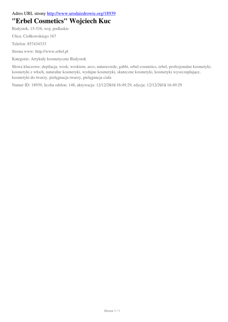 "Erbel Cosmetics" Wojciech Kuc, Bialystok, Ciolkowskiego 167