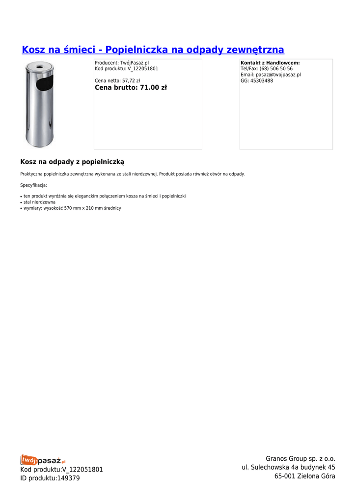 Kosz na śmieci - Popielniczka na odpady zewnętrzna Producent: TwójPasaż.pl Kod produktu: V_122051801 Cena netto: 57,72 zł Kontakt z Handlowcem: Tel/Fax: (68) 506 50 56 Email: [email protected] GG: 45303488 Cena brutto: 71.00 zł Kosz na odpady z popielniczką Praktyczna popielniczka zewnętrzna wykonana ze stali nierdzewnej. Produkt posiada również otwór na odpady. Specyfikacja: ● ● ● ten produkt wyróżnia się eleganckim połączeniem kosza na śmieci i popielniczki stal nierdzewna wymiary: wysokość 570 mm x 210 mm średnicy Kod produktu:V_122051801 ID produktu:149379 Granos Group sp. z o.o. ul. Sulechowska 4a budynek 45 65-001 Zielona Góra