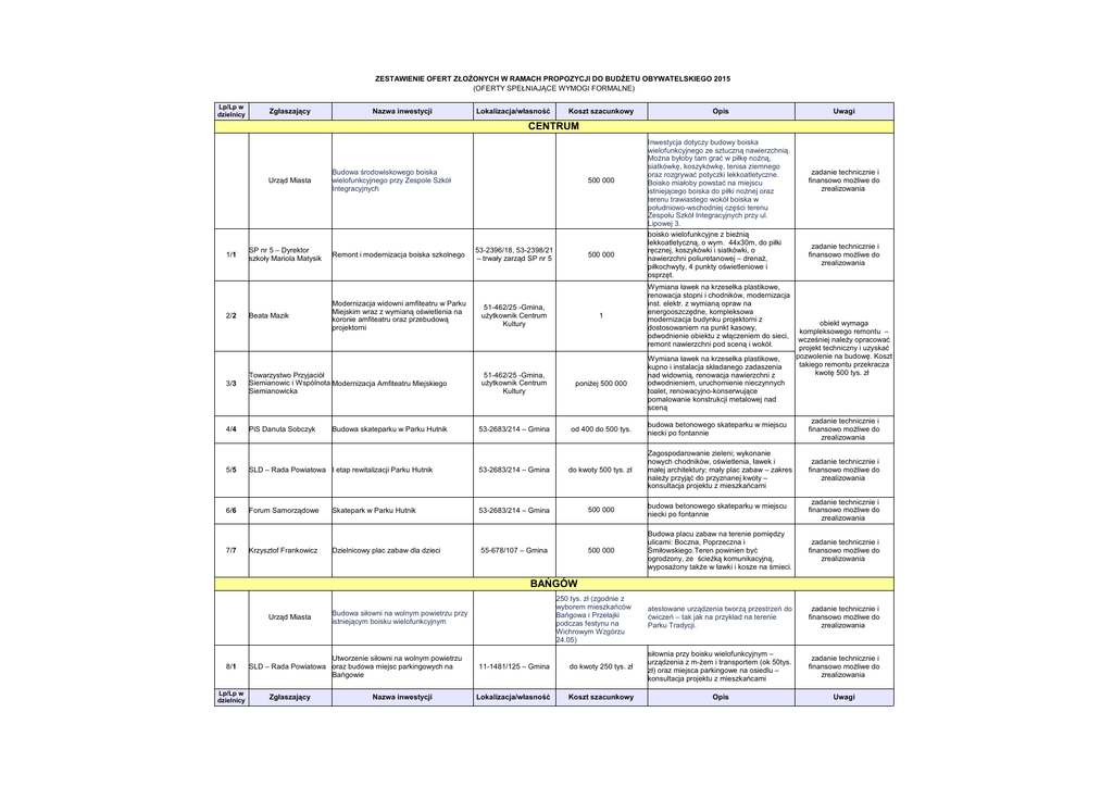 ZESTAWIENIE OFERT ZŁOŻONYCH W RAMACH PROPOZYCJI DO BUDŻETU OBYWATELSKIEGO 2015 (OFERTY SPEŁNIAJĄCE WYMOGI FORMALNE) Lp/Lp w dzielnicy Zgłaszający Nazwa inwestycji Lokalizacja/własność Koszt szacunkowy Opis Uwagi CENTRUM Urząd Miasta Budowa środowiskowego boiska wielofunkcyjnego przy Zespole Szkół Integracyjnych SP nr 5 – Dyrektor szkoły Mariola Matysik Remont i modernizacja boiska szkolnego 2/2 Beata Mazik Modernizacja widowni amfiteatru w Parku Miejskim wraz z wymianą oświetlenia na koronie amfiteatru oraz przebudową projektorni 3/3 Towarzystwo Przyjaciół Siemianowic i Wspólnota Modernizacja Amfiteatru Miejskiego Siemianowicka 4/4 PiS Danuta Sobczyk 5/5 1/1 500 000 53-2396/18, 53-2398/21 – trwały zarząd SP nr 5 500 000 51-462/25 -Gmina, użytkownik Centrum Kultury 1 Inwestycja dotyczy budowy boiska wielofunkcyjnego ze sztuczną nawierzchnią. Można byłoby tam grać w piłkę nożną, siatkówkę, koszykówkę, tenisa ziemnego oraz rozgrywać potyczki lekkoatletyczne. Boisko miałoby powstać na miejscu istniejącego boiska do piłki nożnej oraz terenu trawiastego wokół boiska w południowo-wschodniej części terenu Zespołu Szkół Integracyjnych przy ul. Lipowej 3. boisko wielofunkcyjne z bieżnią lekkoatletyczną, o wym. 44x30m, do piłki ręcznej, koszykówki i siatkówki, o nawierzchni poliuretanowej – drenaż, piłkochwyty, 4 punkty oświetleniowe i osprzęt. Wymiana ławek na krzesełka plastikowe, renowacja stopni i chodników, modernizacja inst. elektr. z wymianą opraw na energooszczędne, kompleksowa modernizacja budynku projektorni z dostosowaniem na punkt kasowy, odwodnienie obiektu z włączeniem do sieci, remont nawierzchni pod sceną i wokół. zadanie technicznie i finansowo możliwe do zrealizowania zadanie technicznie i finansowo możliwe do zrealizowania obiekt wymaga kompleksowego remontu – wcześniej należy opracować projekt techniczny i uzyskać pozwolenie na budowę. Koszt takiego remontu przekracza kwotę 500 tys. zł 51-462/25 -Gmina, użytkownik Centrum Kultury poniżej 500 000 Wymiana ławek na krzesełka plastikowe, kupno i instalacja składanego zadaszenia nad widownią, renowacja nawierzchni z odwodnieniem, uruchomienie nieczynnych toalet, renowacyjno-konserwujące pomalowanie konstrukcji metalowej nad sceną 53-2683/214 – Gmina od 400 do 500 tys. budowa betonowego skateparku w miejscu niecki po fontannie zadanie technicznie i finansowo możliwe do zrealizowania SLD – Rada Powiatowa I etap rewitalizacji Parku Hutnik 53-2683/214 – Gmina do kwoty 500 tys. zł Zagospodarowanie zieleni; wykonanie nowych chodników, oświetlenia, ławek i małej architektury; mały plac zabaw – zakres należy przyjąć do przyznanej kwoty – konsultacja projektu z mieszkańcami zadanie technicznie i finansowo możliwe do zrealizowania 6/6 Forum Samorządowe Skatepark w Parku Hutnik 53-2683/214 – Gmina 500 000 budowa betonowego skateparku w miejscu niecki po fontannie zadanie technicznie i finansowo możliwe do zrealizowania 7/7 Krzysztof Frankowicz Dzielnicowy plac zabaw dla dzieci 55-678/107 – Gmina 500 000 Budowa placu zabaw na terenie pomiędzy ulicami: Boczna, Poprzeczna i Śmiłowskiego.Teren powinien być ogrodzony, ze ścieżką komunikacyjną, wyposażony także w ławki i kosze na śmieci. zadanie technicznie i finansowo możliwe do zrealizowania 250 tys. zł (zgodnie z wyborem mieszkańców Bańgowa i Przełajki podczas festynu na Wichrowym Wzgórzu 24.05) atestowane urządzenia tworzą przestrzeń do ćwiczeń – tak jak na przykład na terenie Parku Tradycji. zadanie technicznie i finansowo możliwe do zrealizowania 11-1481/125 – Gmina do kwoty 250 tys. zł siłownia przy boisku wielofunkcyjnym – urządzenia z m-żem i transportem (ok 50tys. zł) oraz miejsca parkingowe na osiedlu – konsultacja projektu z mieszkańcami zadanie technicznie i finansowo możliwe do zrealizowania Lokalizacja/własność Koszt szacunkowy Opis Uwagi Budowa skateparku w Parku Hutnik BAŃGÓW Urząd Miasta 8/1 Lp/Lp w dzielnicy Budowa siłowni na wolnym powietrzu przy istniejącym boisku wielofunkcyjnym Utworzenie siłowni na wolnym powietrzu SLD – Rada Powiatowa oraz budowa miejsc parkingowych na Bańgowie Zgłaszający Nazwa inwestycji PRZEŁAJKA Urząd Miasta 250 tys. zł (zgodnie z wyborem mieszkańców Bańgowa i Przełajki podczas festynu na Wichrowym Wzgórzu 24.05) Budowa na terenie byłego basenu kącika rekreacyjnego, na które składać się będzie palenisko na grilla, elementy małej architektury i plac zabaw 9/1 Danuta Indyka Budowa siłowni na „Brodziku” wraz z małą architekturą, modernizacją placu zabaw oraz poprawą nawierzchni drogi prowadzącej od ulicy Rzecznej do placu zabaw 10/2 SLD – Rada Powiatowa Budowa boiska do siatkówki i tenisa oraz doposażenie placu zabaw 41-82/7 – Gmina do kwoty 250 tys. zł 11/3 Karina Skowronek Free Park Time Przełajka 41-82/7 – Gmina 190 941,51 41-82/7 – Gmina 250 000 Inwestycja ma polegać na modernizacji niezagospodarowanego miejsca, polegającej na budowy placu zabaw, a obok kącik, gdzie mieszkańcy będą mogli usiąść, porozmawiać, odpocząć. Będzie więc parę ławek, kosze na śmieci, palenisko. siłownia – 100tys.zł; poprawa nawierzchni ścieżki 50tys. zł; ławki, stojak na rowery, zadaszenie oraz odnowienie placu zabaw 100tys. zł boisko wielofunkcyjne do siatkówki i tenisa ziemnego – pozostałe środki na doposażenie placu zabaw skatepark na terenie dawnego basenu „Brodzik” zadanie technicznie i finansowo możliwe do zrealizowania zadanie technicznie i finansowo możliwe do zrealizowania zadanie technicznie i finansowo możliwe do zrealizowania zadanie technicznie i finansowo możliwe do zrealizowania MICHAŁKOWICE Urząd Miasta Budowa pola do mini golfa przy Parku Tradycji oraz toalety dla osób zwiedzających i korzystających z całego terenu Parku Tradycji 12/1 Ogród Społeczny – I etap rewitalizacji SLD – Rada Powiatowa obs