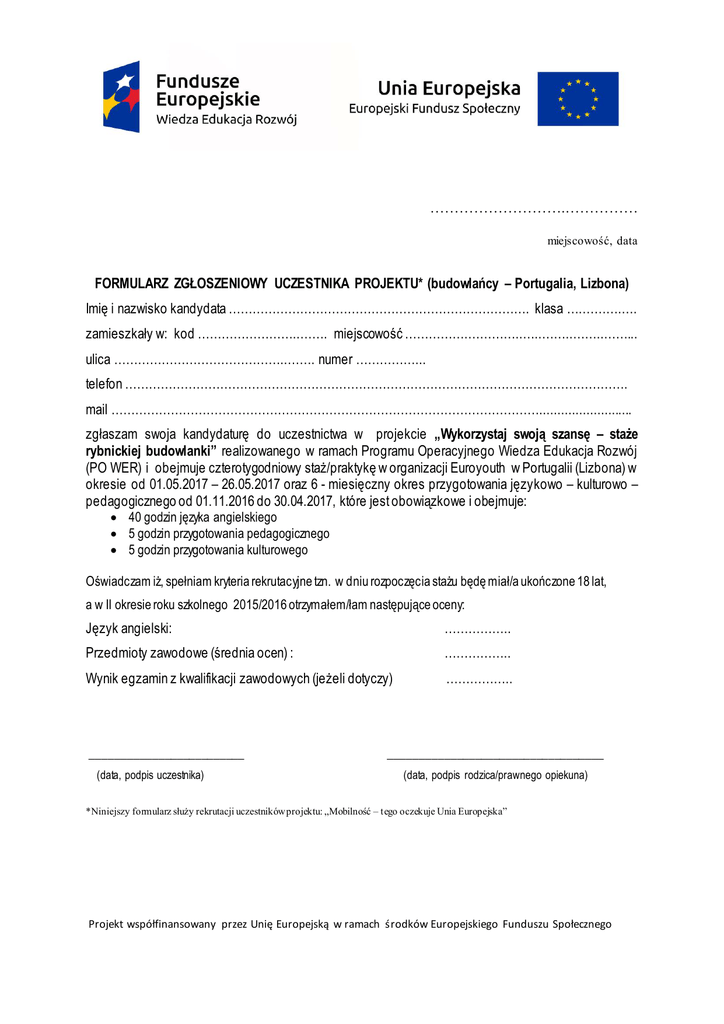 ……………………….…………… miejscowość, data FORMULARZ ZGŁOSZENIOWY UCZESTNIKA PROJEKTU* (budowlańcy – Portugalia, Lizbona) Imię i nazwisko kandydata …………………………………………………………………. klasa ….……….…. zamieszkały w: kod ……………………..……. miejscowość …………….…………..…..……..……..……... ulica ……………………………………..……. numer ……………... telefon ………………………………………………………………………………………………………………. mail ……………………………………………………………………………………………….......................... zgłaszam swoja kandydaturę do uczestnictwa w projekcie „Wykorzystaj swoją szansę – staże rybnickiej budowlanki” realizowanego w ramach Programu Operacyjnego Wiedza Edukacja Rozwój (PO WER) i obejmuje czterotygodniowy staż/praktykę w organizacji Euroyouth w Portugalii (Lizbona) w okresie od 01.05.2017 – 26.05.2017 oraz 6 - miesięczny okres przygotowania językowo – kulturowo – pedagogicznego od 01.11.2016 do 30.04.2017, które jest obowiązkowe i obejmuje: 40 godzin języka angielskiego 5 godzin przygotowania pedagogicznego 5 godzin przygotowania kulturowego Oświadczam iż, spełniam kryteria rekrutacyjne tzn. w dniu rozpoczęcia stażu będę miał/a ukończone 18 lat, a w II okresie roku szkolnego 2015/2016 otrzymałem/łam następujące oceny: Język angielski: …………….. Przedmioty zawodowe (średnia ocen) : …………….. Wynik egzamin z kwalifikacji zawodowych (jeżeli dotyczy) …………….. _________________________ (data, podpis uczestnika) ___________________________________ (data, podpis rodzica/prawnego opiekuna) *Niniejszy formularz służy rekrutacji uczestników projektu: „Mobilność – tego oczekuje Unia Europejska” Projekt współfinansowany przez Unię Europejską w ramach środków Europejskiego Funduszu Społecznego