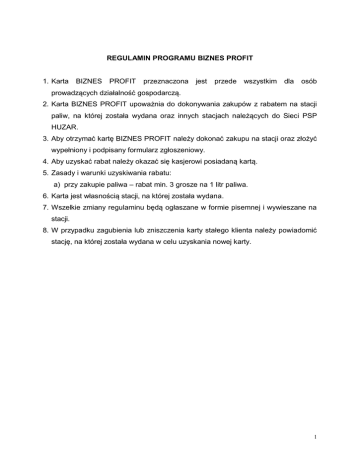 REGULAMIN PROGRAMU BIZNES PROFIT 1. Karta BIZNES PROFIT przeznaczona jest przede wszystkim dla osób prowadzących działalność gospodarczą. 2. Karta BIZNES PROFIT upoważnia do dokonywania zakupów z rabatem na stacji paliw, na której została wydana oraz innych stacjach należących do Sieci PSP HUZAR. 3. Aby otrzymać kartę BIZNES PROFIT należy dokonać zakupu na stacji oraz złożyć wypełniony i podpisany formularz zgłoszeniowy. 4. Aby uzyskać rabat należy okazać się kasjerowi posiadaną kartą. 5. Zasady i warunki uzyskiwania rabatu: a) przy zakupie paliwa – rabat min. 3 grosze na 1 litr paliwa. 6. Karta jest własnością stacji, na której została wydana. 7. Wszelkie zmiany regulaminu będą ogłaszane w formie pisemnej i wywieszane na stacji. 8. W przypadku zagubienia lub zniszczenia karty stałego klienta należy powiadomić stację, na której została wydana w celu uzyskania nowej karty. 1 FORMULARZ ZGŁOSZENIOWY KARTY BIZNES PROFIT Numer karty: ………………………………………………………………. Imię: ……………………………………………………………………….. Nazwisko: ………………………………………………………………….. Miejsce zamieszkania: …………………………………………………….. Kod pocztowy, miejscowość: ……………………………………………… Oświadczam, że zapoznałem się z regulaminem systemu rabatowania karty BIZNES PROFIT. Wyrażam zgodę na przetwarzanie wyżej podanych moich danych osobowych przez stację paliw............................................................ oraz na ich umieszczanie w bazie danych stacji dla celów niniejszej promocji, a także dla celów promocyjnych w przyszłości. Oświadczam, że jestem świadomy przysługującego mi prawa wglądu i aktualizacji moich danych osobowych oraz prawa kontroli ich przetwarzania. Podanie powyższych danych jest dobrowolne. ……………………………….. Data, podpis klienta ……………………………….. Potwierdzenie pracownika stacji 2