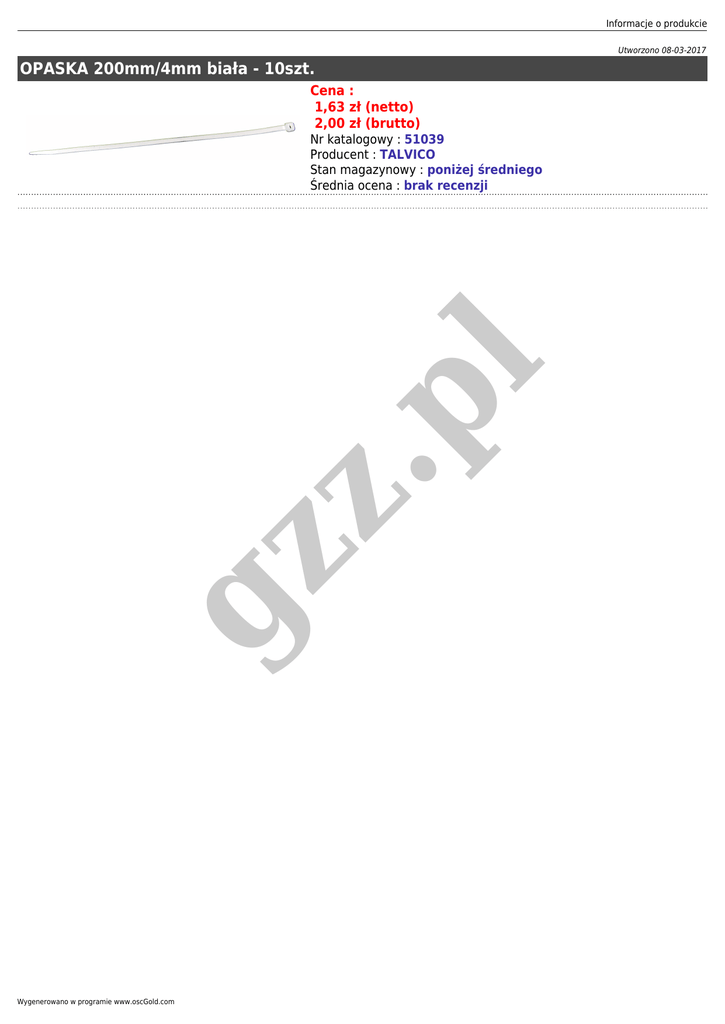 Informacje o produkcie Utworzono 08-03-2017 OPASKA 200mm/4mm biała - 10szt. Cena : 1,63 zł (netto) 2,00 zł (brutto) gz z .p l Nr katalogowy : 51039 Producent : TALVICO Stan magazynowy : poniżej średniego Średnia ocena : brak recenzji Wygenerowano w programie www.oscGold.com