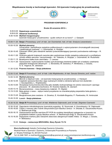 Współczesne trendy w technologii żywności. Od żywności tradycyjnej do prozdrowotnej. PROGRAM KONFERENCJI Środa 26 września 2012 r. 8.00-9.00 Rejestracja uczestników 9.00-9.30 Otwarcie konferencji 9.30-10.00 Wykład inauguracyjny: Żywność tradycyjna i prozdrowotna - qualis verbum et cui bono? - J. Gawęcki 10.00-11.30 Sesja I Prowadzący: prof. dr hab. Jan Oszmiański, hab. dr hab. Grażyna Lewandowicz 10.00-10.30 Wykład plenarny: Oznaczenie i identyfikacja związków polifenolowych z wykorzystaniem chromatografii cieczowej i spektroskopii masowej – J. Oszmiański, A. Wojdyło 10.30-10.45 Parametr ORAC jako wskaźnik wartości przeciwutleniającej żywności pochodzenia roślinnego – R. Olędzki 10.45-11.00 Wybrane gatunki krajowych owoców jako wartościowe źródło związków polecanych w profilaktyce chorób układu sercowo- naczyniowego – M. Teleszko, A. Wojdyło, J. Oszmiański, M. Rudzińska 11.00-11.15 Bioaktywne białka bulw ziemniaka – J. Lewosz 11.15-11.30 Opracowanie i wykorzystanie modelu symulowanego trawienia białek ryb w badaniu uwalniania peptydów biologicznie aktywnych – J. Borawska, M. Darewicz, P. Minkiewicz, J. Dziuba, G. E. Vegarud, M. Jakobsen 11.30-12.00 Przerwa kawowa – Sesja plakatowa 12.00-13.45 Sesja II Prowadzący: prof. dr hab. Lidia Wądołowska, dr hab. Danuta Górecka, prof. nadzw. 12.00-12.30 Wykład plenarny: Błonnik w błędnym kole – od żywności tradycyjnej do prozdrowotnej - J. Harasym 12.30-12.45 Częstość spożycia błonnika i jego wybranych źródeł a ciśnienie tętnicze krwi studentek J. Szczepańska, L. Wądołowska 12.45-13.00 Akceptacja konsumencka błonnika jako dodatku funkcjonalnego do soków owocowych i jasnego pieczywa - M. Jeżewska-Zychowicz, M. Kosicka-Gębska, M. Jeznach 13.00-13.15 Bionanoceluloza – nowy bezpieczny materiał - R. Olędzki 13.15-13.30 Beta-glukan z owsa – wpływ metod pozyskania na charakterystykę preparatów beta-glukanu – J. Harasym 13.30-13.45 Bezglutenowe piwo owsiane - A. Diowksz, E. Kordialik-Bogacka, P. Pawłowska, W. Ambroziak 13.45-15.30 Lunch - Sesja plakatowa 15.30-16.30 Sesja III Prowadzący: prof. dr hab. Waldemar Dąbrowski, prof. dr hab. Zbigniew Czarnecki 15.30-15.45 Zagrożenie mikrobiologiczne żywnością wygodną - B. Szymczak, A. Koronkiewicz, W. Dąbrowski 15.45-16.00 Ciasta z kremem jako nośnik toksynotwórczych Bacillus cereus - A. Dłubała, E. Daczkowska-Kozon, A. Bednarczyk-Drąg 16.00-16.15 Zastosowanie techniki real-time RT-PCR do szybkiej identyfikacji patogenów w żywności na przykładzie bakterii z grupy Bacillus cereus - A. Bednarczyk-Drąg, E. Daczkowska-Kozon 16.15-16.30 Peptydowe markery jako wskaźnik obecności alergennych białek mleka - D. Mogut, J. Dziuba, P. Minkiewicz 19.30 Kolacja – restauracja BROVARIA, Stary Rynek 73-74 Biuro konferencji: Katedra Technologii Żywienia Człowieka Wydział Nauk o Żywności i Żywieniu, Uniwersytet Przyrodniczy w Poznaniu ul. Wojska Polskiego 31, 60-624 Poznań Tel: 61 848 7307, e-mail:[email protected], www.wnozizpoznan.konferencja.org Współczesne trendy w technologii żywności. Od żywności tradycyjnej do prozdrowotnej. Czwartek 27 września 2012 r. 9.00-11.30 Sesja IV Prowadzący; prof. dr hab. Tadeusz Miśkiewicz, dr hab. Ewa Flaczyk, prof. nadzw. 9.00-9.30 Wykład plenarny: Prosumenci a żywność prozdrowotna - R. Nesterowicz, H. Mruk 9.30-9.45 Tradycyjne, kulinarne rarytasy województwa dolnośląskiego - T. Miśkiewicz 9.45-10.00 Produkty lokalne, regionalne i tradycyjne w sieci "Dziedzictwa Kulinarnego Wielkopolski" - A. Swulińska-Katulska 10.00-10.15 Ochrona regionalnych i tradycyjnych produktów spożywczych w Unii Europejskiej: szansa czy zagrożenie dla producentów - M. Krzywonos, J. Leśniewski 10.15-10.30 Wpływ procesu gliwienia na kształtowanie charakterystycznego aromatu tradycyjnie otrzymywanego wielkopolskiego sera smażonego - M. Majcher, K. Myszka, J. Kubiak, K. Czaczyk, H. H. Jeleń 10.30-10.45 Regionalne i tradycyjne oleje i tłuszcze w jadłospisie studenta - M. Krzywonos, D. Borowiak, M. Kosiorowska 10.45-11.00 Występowanie nadwagi i centralnego otłuszczenia w zależności od urozmaicenia spożycia żywności u młodzieży z małych miast i wsi w wieku 13-18 lat. Projekt POLYSES - A. Długosz, E.Niedźwiedzka, T. Długosz, L. Wądołowska 11.00-11.15 Przedstartowa redukcja masy ciała w taekwondo - wybrane zagadnienia - K. Janiszewska, K. Przybyłowicz 11.15-11.30 Restrykcje dietetyczne, nawykowe i emocjonalne objadanie a stan odżywienia młodych kobiet - D. Jesiołowska, K. Przybyłowicz 11.30-12.00 Przerwa kawowa - Sesja plakatowa 12.00- 14.00 Sesja V Prowadzący: prof. dr hab. Zdzisław Targoński, prof. dr hab. Edward Pospiech 12.00-12.30 Wykład plenarny: Współczesne problemy oceny autentyczności żywności - H. Jeleń, E. Pospiech 12.30-12.45 Wpływ obróbek termicznych na jakość lipidów w farszach ze śledzia bałtyckiego - G. Bienkiewicz, G. Tokarczyk, Z. Domiszewski 12.45-13.00 Wykorzystanie mięsa ryb małocennych w żywności przekąskowej - T. Krzywiński, G. Tokarczyk 13.00-13.15 Zastosowanie preparatów transglutaminazy do poprawy mechanicznych właściwości surimi z ryb z rodziny nitecznikowatych (Nemipteridae) - G. Tokarczyk, M. Szymczak, G. Bienkiewicz, K. Felisiak, T. Krzywiński 13.15-13.30 Technologia a jakość marynat rybnych - M. Szymczak 13.30-13.45 Aktywność przeciwutleniająca i proteolityczna solonych śledzi atlantyckich (Clupea harengus l.) - K. Felisiak, G. Tokarczyk, S. Przybylska, M. Lamperska 13.45-14.00 Prozdrowotne dodatki do żywności zawierające immobilizowane nienasycone kwasy tłuszczowe oraz probiotyczne bakterie otrzymywane metodą suszenie rozpyłowego - A. Bartkowiak, A. Tarnowiecka-Kuca, W. Krawczyńska 14.00-14.30 Zakończenie konferencji 14.30-15.30 Lunch Biuro konferencji: Katedra Technologii Żywienia Człowieka Wydział Nauk o Żywności i Żywieniu, Uniwersytet Przyrodniczy w Poznaniu ul. Wojska Pols