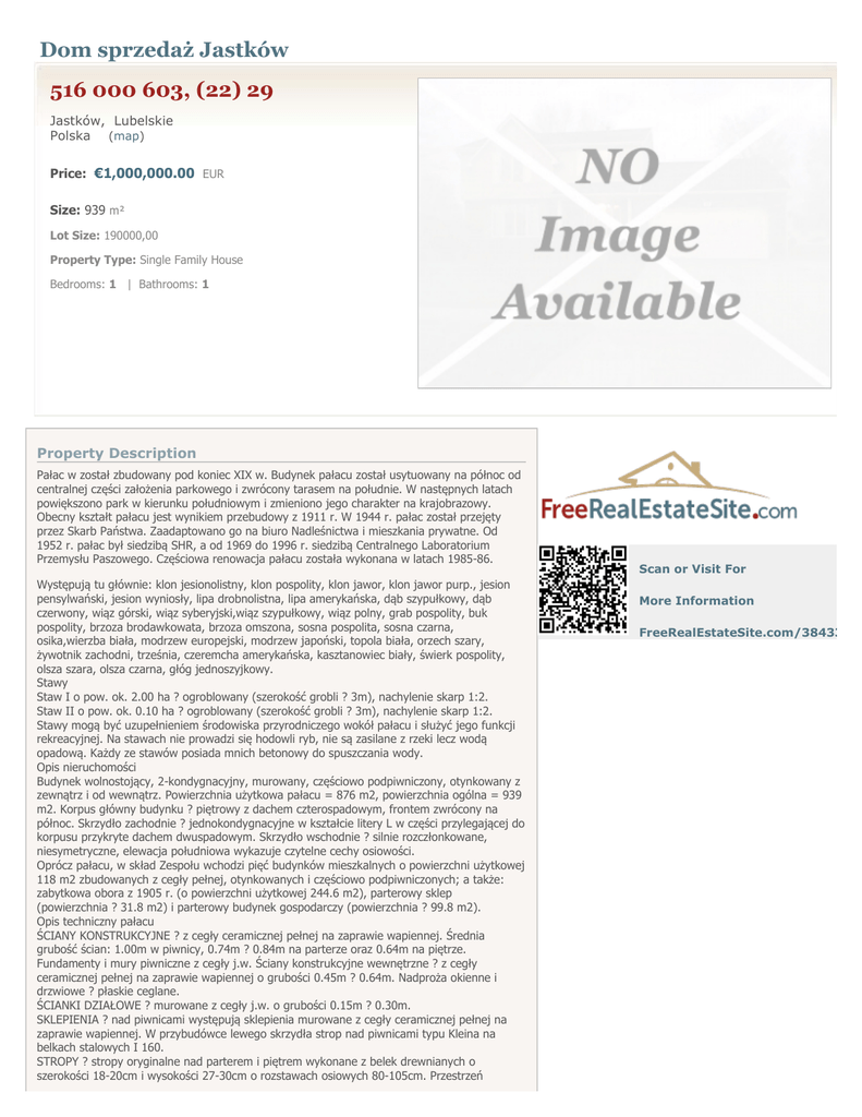 Dom sprzedaż Jastków 516 000 603, (22) 29 Jastków, Lubelskie Polska (map) Price: €1,000,000.00 EUR Size: 939 m² Lot Size: 190000,00 Property Type: Single Family House Bedrooms: 1 | Bathrooms: 1 Property Description Pałac w został zbudowany pod koniec XIX w. Budynek pałacu został usytuowany na północ od centralnej części założenia parkowego i zwrócony tarasem na południe. W następnych latach powiększono park w kierunku południowym i zmieniono jego charakter na krajobrazowy. Obecny kształt pałacu jest wynikiem przebudowy z 1911 r. W 1944 r. pałac został przejęty przez Skarb Państwa. Zaadaptowano go na biuro Nadleśnictwa i mieszkania prywatne. Od 1952 r. pałac był siedzibą SHR, a od 1969 do 1996 r. siedzibą Centralnego Laboratorium Przemysłu Paszowego. Częściowa renowacja pałacu została wykonana w latach 1985-86. Występują tu głównie: klon jesionolistny, klon pospolity, klon jawor, klon jawor purp., jesion pensylwański, jesion wyniosły, lipa drobnolistna, lipa amerykańska, dąb szypułkowy, dąb czerwony, wiąz górski, wiąz syberyjski,wiąz szypułkowy, wiąz polny, grab pospolity, buk pospolity, brzoza brodawkowata, brzoza omszona, sosna pospolita, sosna czarna, osika,wierzba biała, modrzew europejski, modrzew japoński, topola biała, orzech szary, żywotnik zachodni, trześnia, czeremcha amerykańska, kasztanowiec biały, świerk pospolity, olsza szara, olsza czarna, głóg jednoszyjkowy. Stawy Staw I o pow. ok. 2.00 ha ? ogroblowany (szerokość grobli ? 3m), nachylenie skarp 1:2. Staw II o pow. ok. 0.10 ha ? ogroblowany (szerokość grobli ? 3m), nachylenie skarp 1:2. Stawy mogą być uzupełnieniem środowiska przyrodniczego wokół pałacu i służyć jego funkcji rekreacyjnej. Na stawach nie prowadzi się hodowli ryb, nie są zasilane z rzeki lecz wodą opadową. Każdy ze stawów posiada mnich betonowy do spuszczania wody. Opis nieruchomości Budynek wolnostojący, 2-kondygnacyjny, murowany, częściowo podpiwniczony, otynkowany z zewnątrz i od wewnątrz. Powierzchnia użytkowa pałacu = 876 m2, powierzchnia ogólna = 939 m2. Korpus główny budynku ? piętrowy z dachem czterospadowym, frontem zwrócony na północ. Skrzydło zachodnie ? jednokondygnacyjne w kształcie litery L w części przylegającej do korpusu przykryte dachem dwuspadowym. Skrzydło wschodnie ? silnie rozczłonkowane, niesymetryczne, elewacja południowa wykazuje czytelne cechy osiowości. Oprócz pałacu, w skład Zespołu wchodzi pięć budynków mieszkalnych o powierzchni użytkowej 118 m2 zbudowanych z cegły pełnej, otynkowanych i częściowo podpiwniczonych; a także: zabytkowa obora z 1905 r. (o powierzchni użytkowej 244.6 m2), parterowy sklep (powierzchnia ? 31.8 m2) i parterowy budynek gospodarczy (powierzchnia ? 99.8 m2). Opis techniczny pałacu ŚCIANY KONSTRUKCYJNE ? z cegły ceramicznej pełnej na zaprawie wapiennej. Średnia grubość ścian: 1.00m w piwnicy, 0.74m ? 0.84m na parterze oraz 0.64m na piętrze. Fundamenty i mury piwniczne z cegły j.w. Ściany konstrukcyjne wewnętrzne ? z cegły ceramicznej pełnej na zaprawie wapiennej o grubości 0.45m ? 0.64m. Nadproża okienne i drzwiowe ? płaskie ceglane. ŚCIANKI DZIAŁOWE ? murowane z cegły j.w. o grubości 0.15m ? 0.30m. SKLEPIENIA ? nad piwnicami występują sklepienia murowane z cegły ceramicznej pełnej na zaprawie wapiennej. W przybudówce lewego skrzydła strop nad piwnicami typu Kleina na belkach stalowych I 160. STROPY ? stropy oryginalne nad parterem i piętrem wykonane z belek drewnianych o szerokości 18-20cm i wysokości 27-30cm o rozstawach osiowych 80-105cm. Przestrzeń Scan or Visit For More Information FreeRealEstateSite.com/384339 pomiędzy belkami wypełniona ślepym pułapem z bali grubości 6-8cm i glinobitką 8-10cm. Podłogi wykonane z desek i parkietu. Sufity wykończone tynkiem na trzcinie mocowanej do podsufitki z desek. Część stropów drewnianych została wymieniona na stropy z prefabrykowanych płyt żelbetowych układanych na belkach stalowych, dwuteowych. SCHODY ? główna klatka schodowa drewniana na belkach policzkowych, boczna ? płytowa, żelbetowa. DACH I WIĘŹBA DACHOWA ? więźby drewniane. Nad korpusem głównym konstrukcja krokwiowo ? jętkowa z dwoma ścianami stolcowymi. Nad skrzydłami parterowymi konstrukcja krokwiowo ? płatwiowa i krokwiowa. Pokrycie dachu z blachy stalowej ocynkowanej na deskowaniu. STOLARKA OKIE Year Built: 1821 Garage Size: 1 Car