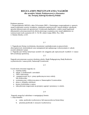 REGULAMIN PRZYZNAWANIA NAGRÓD dla uczniów Szkoły Podstawowej w Kornatce im. Świętej Jadwigi Królowej Polski Podstawa prawna: 1. Rozporządzenie MENiS z dnia 24 kwietnia 2002 r. Zmieniające rozporządzenie w sprawie zasad wydawania wzorów świadectw, dyplomów państwowych i innych druków szkolnych, sposobu dokonywania ich sprostowań i wydawania duplikatów, a także zasad legalizacji dokumentów przeznaczonych do obrotu prawnego za granicą oraz zasad odpłatności za wykonywanie tych czynności (D. U. Nr 48 z dnia 6 maja 2002r. Poz. 446) 2. Statutu Szkoły, § 223. §1 1. Nagroda jest formą wyróżnienia, docenienia i podziękowania za pracowitość, obowiązkowość, koleżeńskość oraz umiejętność jak najlepszego wykorzystania w szkole swoich zdolności i pasji. 2. Nagroda jest formą motywacji uczniów do osiągania jak najwyższych wyników w nauce lub rywalizacji sportowej. §2 Nagrody przyznawane są przez dyrekcję szkoły, Radę Pedagogiczną, Radę Rodziców wychowawców i nauczycieli, Samorząd Uczniowski. §3 Uczeń może otrzymać nagrody za: a. rzetelną naukę b. udział w konkursach i zawodach c. 100% frekwencję d. zaangażowanie się w pracę społeczną na rzecz szkoły lub środowiska: systematyczna i efektywna praca w Samorządzie Uczniowskim praca w sklepiku szkolnym pomoc koleżeńską w nauce, e. zdecydowane reagowanie na przejawy agresji i przemocy w szkole. §4 Nagrody mogą być udzielane w następującej formie: 1. indywidualne: a. ustna pochwała wychowawcy lub nauczyciela na forum klasy b. pisemna pochwała w zeszycie wychowawcy c. pisemna bądź ustna pochwała wychowawcy lub nauczyciela do rodziców d. ustna pochwała dyrektora wobec uczniów lub rodziców e. nagrody rzeczowe i dyplomy uznania f. świadectwo ukończenia roku szkolnego z wyróżnieniem g. nagroda książkowa h. wpis do „Złotej Księgi” i. List Gratulacyjny do rodziców j. odznaka „Srebrnej Tarczy” i „Złotej Tarczy” k. nagroda specjalna Rady Pedagogicznej „Perełka Królowej Jadwigi” 2. zbiorowe: a. pochwała wychowawcy, b. pochwała dyrektora szkoły wobec Rady Pedagogicznej, uczniów, Rady Rodziców c. dyplom uznania d. nagroda rzeczowa §5 Szczegółowe kryteria przyznawania nagród: „ PEREŁKA KRÓLOWEJ JADWIGI” (nagroda rzeczowa) Nagroda fundowana jest przez Radę Pedagogiczną dla ucznia kończącego szkołę, który spełnił przynajmniej cztery z wymienionych kryteriów: jest szczególnie uzdolniony w jakiejś dziedzinie osiąga bardzo dobre wyniki w nauce ma wzorową ocenę zachowania staje w obronie słabszych wykazuje inicjatywę w pomocy uczniom mniej zdolnym wykazuje duże zaangażowanie w życie Kościoła Katolickiego Oznaka jest wyróżnieniem szczególnym i bardzo wyjątkowym. ODZNAKA „ZŁOTEJ TARCZY” Odznaka jest wręczana na zakończenie roku szkolnego uczniom klasy VI, którzy: otrzymali wzorową ocenę z zachowania mają średnią ocen minimum 5,0 Spełnili dodatkowo jeden z niżej wymienionych warunków: podejmowali inicjatywy społeczne oraz sami inicjowali tego typu działania na rzecz szkoły lub środowiska wyjątkowo aktywnie pracowali w samorządzie szkoły lub innych organizacjach działających na terenie szkoły rozsławili w sposób szczególny imię szkoły np. w konkursach przedmiotowych, zawodach sportowych na szczeblu powiatowym , wojewódzkim lub ogólnopolskim. Odznakę przyznaje Rada Pedagogiczna na uzasadniony wniosek wychowawcy klasy, opiekuna organizacji szkolnych lub dyrektora. Jest to nagroda szczególna i wyjątkowa. Uczniowie, którzy otrzymują odznakę „Złotej Tarczy” zostają wyróżnieni Listem Gratulacyjnym skierowanym do rodziców. ODZNAKA „SREBRNEJ TARCZY” Odznaka jest wręczana na koniec roku szkolnego uczniom klas IV-V, którzy: otrzymali wzorową ocenę z zachowania mają średnią ocen minimum 5,0 Spełnili dodatkowo jeden z niżej wymienionych warunków: podejmowali inicjatywy społeczne oraz sami inicjowali tego typu działania na rzecz szkoły lub środowiska wyjątkowo aktywnie pracowali w samorządzie szkoły lub innych organizacjach działających na terenie szkoły rozsławili w sposób szczególny imię szkoły np. w konkursach przedmiotowych, zawodach sportowych na szczeblu powiatowym , wojewódzkim lub ogólnopolskim. Odznakę przyznaje Rada Pedagogiczna na uzasadniony wniosek wychowawcy klasy, opiekuna organizacji szkolnych lub dyrektora. Jest to nagroda szczególna i wyjątkowa. Uczniowie, którzy otrzymują odznakę „Srebrnej Tarczy” zostają wyróżnieni Listem Gratulacyjnym skierowanym do rodziców. ŚWIADECTWO Z WYRÓŻNIENIEM (z biało-czerwonym paskiem) Otrzymują uczniowie klas IV – VI, którzy: mają średnią ocen końcowo-rocznych minimum 4,75 wzorową lub bardzo dobrą ocenę z zachowania WPIS DO ”ZŁOTEJ KSIĘGI” W klasach I – III otrzymują uczniowie, którzy mają: bardzo dobre wyniki w nauce wzorową ocenę z zachowania W klasach IV-VI otrzymują uczniowie, którzy mają: średnią ocen końcowo-rocznych z obowiązkowych zajęć edukacyjnych minimum 5,0 wzorową ocenę z zachowania LIST GRATULACYJNY List gratulacyjny wychowawcy i dyrektora szkoły skierowany jest do rodziców ucznia, który otrzymał odznakę „Złotej Tarczy” lub „Srebrnej Tarczy”. NAGRODA KSIĄŻKOWA W klasach IV – VI nagrodę książkową otrzymują uczniowie, którzy mają: średnią ocen końcowo-rocznych z obowiązkowych zajęć edukacyjnych minimum 4.75 bardzo dobrą lub wzorową ocenę z zachowania W klasach I – III otrzymują uczniowie, którzy mają: bardzo dobre wyniki w nauce bardzo dobrą lub wzorową ocenę z zachowania W klasach I-VI nagrodę książkową otrzymują uczniowie za 100 % frekwencję ( niezależnie od innych nagród). Nagroda przyznawana jest na koniec roku szkolnego. NAGRODY RZECZOWE, DYPLOMY, PUCHARY Otrzymują przedszkolaki i uczniowie klas I-VI za: wysokie lokaty w konkursach i zawodach sportowych organizowanych w szkole i poza szkołą (
