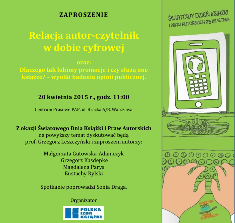 ZAPROSZENIE Relacja autor-czytelnik w dobie cyfrowej oraz: Dlaczego tak lubimy promocje i czy służą one książce? – wyniki badania opinii publicznej. 20 kwietnia 2015 r., godz. 11:00 Centrum Prasowe PAP, ul. Bracka 6/8, Warszawa Z okazji Światowego Dnia Książki i Praw Autorskich na powyższy temat dyskutować będą prof. Grzegorz Leszczyński i zaproszeni autorzy: Małgorzata Gutowska-Adamczyk Grzegorz Kasdepke Magdalena Parys Eustachy Rylski Spotkanie poprowadzi Sonia Draga. Organizator