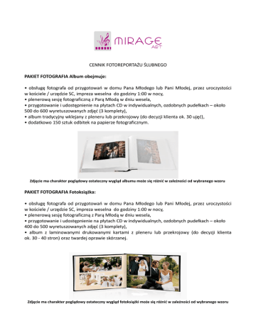 CENNIK FOTOREPORTAŻU ŚLUBNEGO PAKIET FOTOGRAFIA Album obejmuje: • obsługę fotografa od przygotowań w domu Pana Młodego lub Pani Młodej, przez uroczystości w kościele / urzędzie SC, impreza weselna do godziny 1:00 w nocy, • plenerową sesję fotograficzną z Parą Młodą w dniu wesela, • przygotowanie i udostępnienie na płytach CD w indywidualnych, ozdobnych pudełkach – około 500 do 600 wyretuszowanych zdjęć (3 komplety), • album tradycyjny wklejany z pleneru lub przekrojowy (do decyzji klienta ok. 30 ujęć), • dodatkowo 150 sztuk odbitek na papierze fotograficznym. Zdjęcie ma charakter poglądowy ostateczny wygląd albumu może się różnić w zależności od wybranego wzoru PAKIET FOTOGRAFIA Fotoksiążka: • obsługę fotografa od przygotowań w domu Pana Młodego lub Pani Młodej, przez uroczystości w kościele / urzędzie SC, impreza weselna do godziny 1:00 w nocy, • plenerową sesję fotograficzną z Parą Młodą w dniu wesela, • przygotowanie i udostępnienie na płytach CD w indywidualnych, ozdobnych pudełkach – około 400 do 500 wyretuszowanych zdjęć (3 komplety), • album z laminowanymi drukowanymi kartami z pleneru lub przekrojowy (do decyzji klienta ok. 30 - 40 stron) oraz twardej oprawie skórzanej. Zdjęcie ma charakter poglądowy ostateczny wygląd fotoksiążki może się różnić w zależności od wybranego wzoru DODATKOWO ----------------------------------------------------------------------------------------------------------------------------------+ 300 zł obsługa drugiego fotografa, skutkująca większą o 150 szt ilością zdjęć dostarczonych na płytach CD, dodatkowymi, ciekawymi ujęciami ----------------------------------------------------------------------------------------------------------------------------------+ 250 zł plenerowa sesja fotograficzna organizowana w innym niż wesele dniu, trwająca około 5-7 godzin, w kilku wybranych lokalizacjach ----------------------------------------------------------------------------------------------------------------------------------+150 zł zdjęcia w formie prezentacji na DVD ----------------------------------------------------------------------------------------------------------------------------------+ 400 zł obsługa fotograficzna poprawin ----------------------------------------------------------------------------------------------------------------------------------do ustalenia w zależności od nakładu dodatkowe odbitki w formatach 13x18, 15x21, 18x24, 30x45 ----------------------------------------------------------------------------------------------------------------------------------Dojazd do 40 km Gratis.