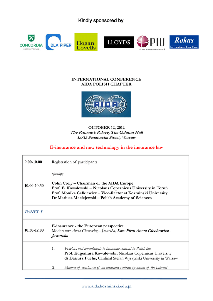 Kindly sponsored by INTERNATIONAL CONFERENCE AIDA POLISH CHAPTER OCTOBER 12, 2012 The Primate’s Palace, The Column Hall 13/15 Senatorska Street, Warsaw E-insurance and new technology in the insurance law 9.00-10.00 Registration of participants opening: 10.00-10.30 Colin Croly – Chairman of the AIDA Europe Prof. E. Kowalewski – Nicolaus Copernicus University in Toruń Prof. Monika Całkiewicz – Vice-Rector at Kozminski University Dr Mariusz Maciejewski – Polish Academy of Sciences PANEL I 10.30-12.00 E-insurance - the European perspective Moderator: Aneta Ciechowicz – Jaworska, Law Firm Aneta Ciechowicz - Jaworska 1. PEICL and amendments to insurance contract in Polish law Prof. Eugeniusz Kowalewski, Nicolaus Copernicus University dr Dariusz Fuchs, Cardinal Stefan Wyszyński University in Warsaw 2. Manner of conclusion of an insurance contract by means of the Internet www.aida.kozminski.edu.pl Prof. Jérôme Kullmann, University of Paris-Dauphine, Director of the Institute des Assurances de Paris, University of Paris I - PanthéonSorbonne, Vice-President of AIDA, Vice-President of AIDA Europe, President of AIDA France 12.00-13.00 3. Unfair trade practices in the distance marketing of insurance products Prof. Pierpaolo Marano, Member of the Council of AIDA Italy, Chairman of AIDA Europe Working Party, Member of the Council of AIDA Europe, Università Catollica del Sacro Cuore Largo A. Gemelli 4. E- insurance and a consumer in the European Union. Dr Katarzyna Malinowska, University of Warsaw, Chamber of Insurance and Risk Management, BMSP Legal Advisors Lunch PANEL II 13.00-15.00 New technology in insurance – legal regulation Moderator: dr Katarzyna Malinowska - University of Warsaw, Chamber of Insurance and Risk Management, BMSP Legal Advisors 1. E- insurance and new technology - opportunities and legal risks Piotr Narloch, President Concordia Polska TUW, WTUŻiR Concordia Capital S.A. 2. On- line insurance intermediaries Prof. Ioannis Rokas, Member of AIDA Presidential Council & Europe Executive Committee, Chairman of AIDA "Distribution of Insurance Products" Working Party, Chairman of HILA (AIDA Greece), Athens University of Economics & Business, Managing Partner at I.K. Rokas & Partners Law Firm 3. Use of new technologies in conclusion of insurance contracts towards insurance intermediaries Bartosz Wojno, Polish Financial Supervision Authority 4. Conclusion of insurance contracts in B2C model by means of the Internet and the provisions of the Polish Civil Code on insurance contract Paweł Sukiennik, Vice President, Chief Underwriter, Leadenhall Polska S.A. 5. E-i insurance in Polish law. Selected issues Beata Mrozowska, Senior Associate at Hogan Lovells Law Firm 6. The right of subjects of insurance contracts concluded by means of the Internet or phone - manners of execution www.aida.kozminski.edu.pl dr Marcin Orlicki, Adam Mickiewicz University 15.00-15.30 Coffee break Discussion Panel 15.30-16.15 „E-insurance” – Current Issues Moderator: Anna Tarasiuk – Flodrowska, counsel, Hogan Lovells Speakers will include: 16:15 – 16:20 1. Magdalena Barcicka, former Deputy Chairman of Insurance Guarantee Fund, insurance expert 2. Iwona Filipska, Olejnik Filipska Law Office 3. Anna Grykin, director of Legal and Compliance Department, Link4 Towarzystwo Ubezpieczeń S.A. 4. Aldona Wnęk, director of Legal Department, Open Life Towarzystwo Ubezpieczeń Życie S.A. 5. Paweł Zylm, Direct Insurance Team at Polish Insurance Association (PIU) Summary, conference closing www.aida.kozminski.edu.pl