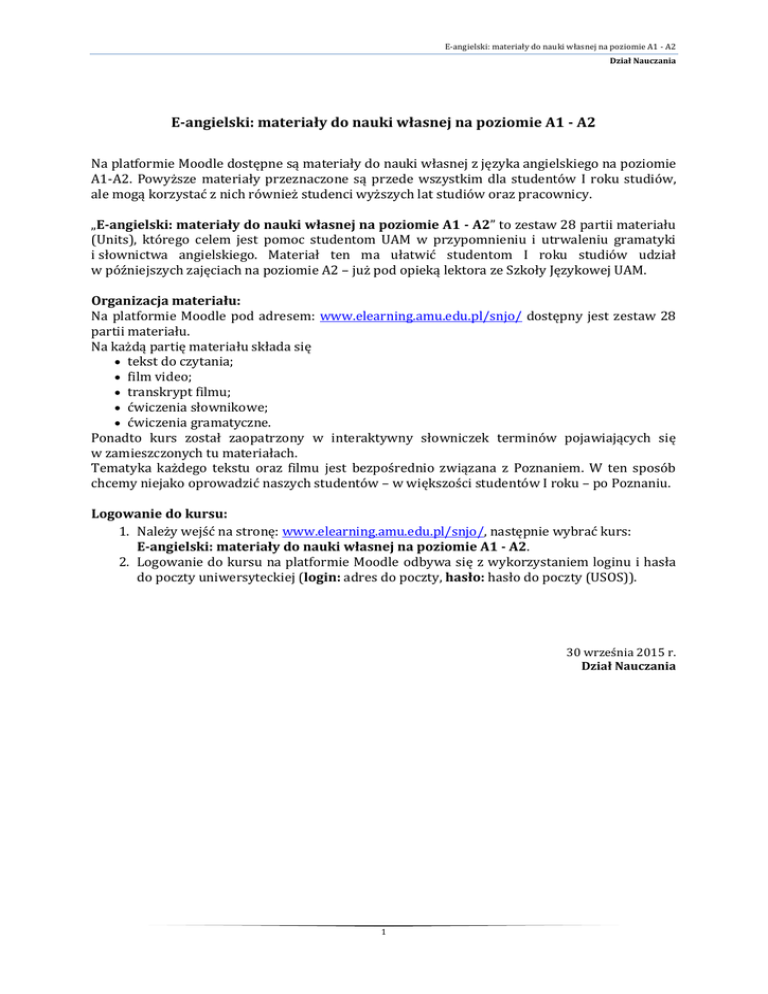 E-angielski: materiały do nauki własnej na poziomie A1 - A2 Dział Nauczania E-angielski: materiały do nauki własnej na poziomie A1 - A2 Na platformie Moodle dostępne są materiały do nauki własnej z języka angielskiego na poziomie A1-A2. Powyższe materiały przeznaczone są przede wszystkim dla studentów I roku studiów, ale mogą korzystać z nich również studenci wyższych lat studiów oraz pracownicy. „E-angielski: materiały do nauki własnej na poziomie A1 - A2” to zestaw 28 partii materiału (Units), którego celem jest pomoc studentom UAM w przypomnieniu i utrwaleniu gramatyki i słownictwa angielskiego. Materiał ten ma ułatwić studentom I roku studiów udział w późniejszych zajęciach na poziomie A2 – już pod opieką lektora ze Szkoły Językowej UAM. Organizacja materiału: Na platformie Moodle pod adresem: www.elearning.amu.edu.pl/snjo/ dostępny jest zestaw 28 partii materiału. Na każdą partię materiału składa się tekst do czytania; film video; transkrypt filmu; ćwiczenia słownikowe; ćwiczenia gramatyczne. Ponadto kurs został zaopatrzony w interaktywny słowniczek terminów pojawiających się w zamieszczonych tu materiałach. Tematyka każdego tekstu oraz filmu jest bezpośrednio związana z Poznaniem. W ten sposób chcemy niejako oprowadzić naszych studentów – w większości studentów I roku – po Poznaniu. Logowanie do kursu: 1. Należy wejść na stronę: www.elearning.amu.edu.pl/snjo/, następnie wybrać kurs: E-angielski: materiały do nauki własnej na poziomie A1 - A2. 2. Logowanie do kursu na platformie Moodle odbywa się z wykorzystaniem loginu i hasła do poczty uniwersyteckiej (login: adres do poczty, hasło: hasło do poczty (USOS)). 30 września 2015 r. Dział Nauczania 1