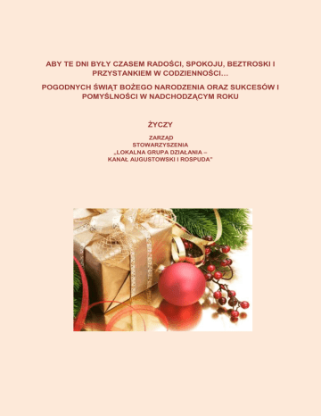 ABY TE DNI BYŁY CZASEM RADOŚCI, SPOKOJU, BEZTROSKI I PRZYSTANKIEM W CODZIENNOŚCI… POGODNYCH ŚWIĄT BOŻEGO NARODZENIA ORAZ SUKCESÓW I POMYŚLNOŚCI W NADCHODZĄCYM ROKU ŻYCZY ZARZĄD STOWARZYSZENIA „LOKALNA GRUPA DZIAŁANIA – KANAŁ AUGUSTOWSKI I ROSPUDA”