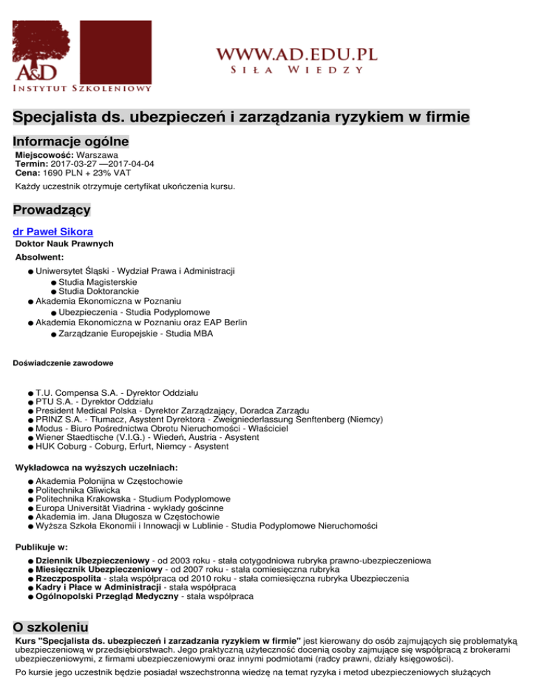 Specjalista ds. ubezpieczeń i zarządzania ryzykiem w firmie Informacje ogólne Miejscowość: Warszawa Termin: 2017-03-27 —2017-04-04 Cena: 1690 PLN + 23% VAT Każdy uczestnik otrzymuje certyfikat ukończenia kursu. Prowadzący dr Paweł Sikora Doktor Nauk Prawnych Absolwent: Uniwersytet Śląski - Wydział Prawa i Administracji ● Studia Magisterskie ● Studia Doktoranckie ● Akademia Ekonomiczna w Poznaniu ● Ubezpieczenia - Studia Podyplomowe ● Akademia Ekonomiczna w Poznaniu oraz EAP Berlin ● Zarządzanie Europejskie - Studia MBA ● Doświadczenie zawodowe ● ● ● ● ● ● ● T.U. Compensa S.A. - Dyrektor Oddziału PTU S.A. - Dyrektor Oddziału President Medical Polska - Dyrektor Zarządzający, Doradca Zarządu PRINZ S.A. - Tłumacz, Asystent Dyrektora - Zweigniederlassung Senftenberg (Niemcy) Modus - Biuro Pośrednictwa Obrotu Nieruchomości - Właściciel Wiener Staedtische (V.I.G.) - Wiedeń, Austria - Asystent HUK Coburg - Coburg, Erfurt, Niemcy - Asystent Wykładowca na wyższych uczelniach: ● ● ● ● ● ● Akademia Polonijna w Częstochowie Politechnika Gliwicka Politechnika Krakowska - Studium Podyplomowe Europa Universität Viadrina - wykłady gościnne Akademia im. Jana Długosza w Częstochowie Wyższa Szkoła Ekonomii i Innowacji w Lublinie - Studia Podyplomowe Nieruchomości Publikuje w: ● ● ● ● ● Dziennik Ubezpieczeniowy - od 2003 roku - stała cotygodniowa rubryka prawno-ubezpieczeniowa Miesięcznik Ubezpieczeniowy - od 2007 roku - stała comiesięczna rubryka Rzeczpospolita - stała współpraca od 2010 roku - stała comiesięczna rubryka Ubezpieczenia Kadry i Płace w Administracji - stała współpraca Ogólnopolski Przegląd Medyczny - stała współpraca O szkoleniu Kurs "Specjalista ds. ubezpieczeń i zarzadzania ryzykiem w firmie" jest kierowany do osób zajmujących się problematyką ubezpieczeniową w przedsiębiorstwach. Jego praktyczną użyteczność docenią osoby zajmujące się współpracą z brokerami ubezpieczeniowymi, z firmami ubezpieczeniowymi oraz innymi podmiotami (radcy prawni, działy księgowości). Po kursie jego uczestnik będzie posiadał wszechstronna wiedzę na temat ryzyka i metod ubezpieczeniowych służących zarządzaniu nim. Program Kształtowanie się pojęcia ryzyka i system zarządzani ryzykiem 1. Współczesne pojęcie ryzyka 2. Współczesne wymogi dotyczące podejścia do ryzyka w zarządzaniu różnymi podmiotami rynkowymi 3. Nowe wyzwania dla zarządzania ryzykiem 4. Obszary ryzyka współczesnego przedsiębiorstwa (ćwiczenie – mapa ryzyka) 5. Cele zarządzania ryzykiem 6. Poszczególne etapy procesu zarządzania ryzykiem 7. Metody sterowania ryzykiem (methods of handling risk) 8. Ubezpieczenia, jako szczególna metoda transferu ryzyka (cwiczenie – grupy wspólnego ryzyka) 9. Rynek ubezpieczeniowy w Polsce i za granicą 10. Podmioty rynku ubezpieczeń 11. Charakterystyka podstawowych grup produktowych 12. Prawne ramy funkcjonowania ubezpieczeń Ubezpieczenia mienia ruchomego i nieruchomego 1. Kodeksowa możliwość odmowy wypłaty odszkodowania z tytułu wadliwej deklaracji i notyfikacji ryzyka 2. Odmowa z powodu wyrządzenia szkody umyślnie lub w sposób rażąco niedbały 3. Nakaz zapobiegania powstawaniu roszczeń i zmniejszania ich rozmiaru 4. Systemy ubezpieczenia mienia (all risks, named perills) 5. Charakterystycznie wyłączenia odpowiedzialności ubezpieczyciela 6. Problemy określenia sumy ubezpieczenia 7. Wyłączenia charakterystyczne dla ubezpieczenia mienia od żywiołów i kradzieży 8. Mienie w budowie i określenie zakresu jego ubezpieczenia 9. Problemy ubezpieczenia mienia w transporcie Ubezpieczenie OC działalności gospodarczej 1. Pojęcie i sposób powstawania odpowiedzialności cywilnej 2. Przesłanki odpowiedzialności cywilnej 3. Pojęcie szkody i sposób jej określenia 4. Odpowiedzialność na zasadzie ryzyka 5. Podstawowy zakres ubezpieczenia odpowiedzialności cywilnej przedsiębiorcy 6. Warunki odpowiedzialności za szkody środowiskowe, pracownicze i produkt niebezpieczny 7. Czysta strata finansowa, mienie powierzone, różne kategorie kosztów i inne rozszerzenia odpowiedzialności 8. Wyłączenia odpowiedzialności – dotyczące OC – kontraktu, wadliwego zachowania, rodzajowe i inne 9. Wyłączenia charakterystyczne dla OC – przewoźnika i firmy budowlanej Ubezpieczenia OC posiadacza pojazdu 1. Pojęcie ruchu, posiadacza, kierującego i ich konsekwencje 2. Odpowiedzialność posiadacza pojazdu za szkody z ruchu pojazdu 3. Ubezpieczenie odpowiedzialności cywilnej posiadacza pojazdu 4. Zakres ubezpieczenia OC – posiadacza 5. Sytuacje zrównane z ruchem i inne obszary sporne w OC posiadacza pojazdu 6. Wyłączenia odpowiedzialności z OC – posiadacza 7. Wypłata kosztorysowana za szkodę w pojeździe 8. Dopuszczalność stosowania amortyzacji oraz zamienników 9. Zwrot kosztów za pojazd zastępczy 10. Utrata wartości rynkowej pojazdu 11. Zmiany procedury szkodowej według wytycznych KNF Ubezpieczenie autocasco w praktyce przedsiębiorstw 1. Przegląd produktów dostępnych na rynku ubezpieczeniowym (All risks, ryzyka nazwane) 2. części składowe umowy ubezpieczenia, zdarzenia objęte ubezpieczeniem 3. Ustalenie pokrycia ubezpieczeniowego 4. Wyłączenia odpowiedzialności zakładu ubezpieczeń, lista typowych wyłączeń w relacji do art. 815 i 827 k.c. 5. Suma ubezpieczenia, franszyza redukcyjna i integralna 6. Szczególne warunki w ubezpieczeniach flotowych 7. Obowiązki ubezpieczającego związane z zawarciem i zarządzaniem ubezpieczeniem 8. Szkoda, zgłoszenie, wyliczenie i wypłata odszkodowania, 9. Cesja z polisy ubezpieczeniowej, regres do sprawcy zdarzenia 10. Problematyka szkód kradzieżowych, terminy, obowiązki formalne: klucze, dokumenty inne 11. Szkody kradzieżowe w orzecznictwie sądowym i praktyce ubezpieczeniowej Likwidacja szkód i postępowanie regresowe 1. Przestępczość ubezpieczeniowa – mit, czy rzeczywistoś