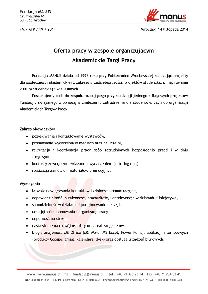 Fundacja MANUS Grunwaldzka 61 50 - 366 Wrocław FM / ATP / 19 / 2014 Wrocław, 14 listopada 2014 Oferta pracy w zespole organizującym Akademickie Targi Pracy Fundacja MANUS działa od 1995 roku przy Politechnice Wrocławskiej realizując projekty dla społeczności akademickiej z zakresu przedsiębiorczości, projektów studenckich, inspirowania kultury studenckiej i wielu innych. Poszukujemy osób do zespołu pracującego przy realizacji jednego z flagowych projektów Fundacji, związanego z pomocą w znalezieniu zatrudnienia dla studentów, czyli do organizacji Akademickich Targów Pracy. Zakres obowiązków pozyskiwanie i kontaktowanie wystawców, promowanie wydarzenia w mediach oraz na uczelni, rekrutacja i koordynacja pracy osób zatrudnionych bezpośrednio przed i w dniu targowym, kontakty zewnętrzne związane z wydarzeniem (catering etc.), realizacja zamówień materiałów promocyjnych. Wymagania łatwość nawiązywania kontaktów i zdolności komunikacyjne, odpowiedzialność, sumienność, pracowitość, konsekwencja w działaniu i inicjatywa, samodzielność w działaniu i podejmowaniu decyzji, umiejętności planowania i organizacji pracy, odporność na stres, nastawienie na rozwój osobisty oraz realizację celów, biegła znajomość MS Office (MS Word, MS Excel, Power Point), aplikacji internetowych (produkty Google: gmail, kalendarz, dysk) oraz obsługa urządzeń biurowych. www: www.manus.pl mail: [email protected] NIP: 898-10-11-437 REGON: 930490978 KRS: 0000100892 tel.: +48 71 320 23 74 fax: +48 71 734 53 41 Rachunek bankowy: BZWBK 02 1090 2402 0000 0006 1000 9406 Fundacja MANUS Grunwaldzka 61 50 - 366 Wrocław Mile widziane: doświadczenie na podobnym stanowisku, przy organizacji targów, konferencji, seminariów, wydarzeń. znajomość języka angielskiego, dyspozycyjność przynajmniej cztery dni w tygodniu, od poniedziałku do piątku. Atuty współpracy z Fundacją MANUS: jesteśmy gotowi rozpocząć współpracę z osobami bez doświadczenia zawodowego, pozwalamy na zdobycie ciekawego doświadczenia, oferujemy ciekawą pracę w młodym i dynamicznym zespole, umożliwiamy pracę przy projekcie, który daje możliwość bezpośredniego kontaktu z wieloma pracodawcami, nie tylko z Dolnego Śląska, Rekrutacja Zgłoszenia (CV ze zdjęciem) prosimy nadsyłać na adres: [email protected]. W tytule maila prosimy wpisać nr referencyjny: FM/ATP/19/2014 oraz imię i nazwisko. Rekrutację planujemy zakończyć, po znalezieniu odpowiednich osób, nie później niż do 28 listopada 2014 r. Zachęcamy do aplikowania! Prosimy o dołączenie do zgłoszenia klauzuli: Wyrażam zgodę na przetwarzanie moich danych osobowych przez Fundację MANUS, zawartych w złożonych przeze mnie dokumentach, w tym na przetwarzanie ich w przyszłości dla celów związanych z procesem rekrutacji. Niniejszą zgodę składam dobrowolnie i oświadczam, że zostałem poinformowany o uprawnieniach przysługujących mi na podstawie ustawy z dnia 29 sierpnia 1997 r. o ochronie danych osobowych (Dz. U.02.101.926.j.t.). www: www.manus.pl mail: [email protected] NIP: 898-10-11-437 REGON: 930490978 KRS: 0000100892 tel.: +48 71 320 23 74 fax: +48 71 734 53 41 Rachunek bankowy: BZWBK 02 1090 2402 0000 0006 1000 9406