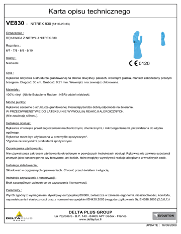 1 . *2 15 3 VE830 % B''%-;D ! "#$ % $# % #& % &#' ( ! '- ) *+ . * /+0 1 !(0 *1 2+12 3 104 *1 50!14 .(56 0071 389+6 + 1 +:! . *1! ) 3 ; <823=> ; ? 2)=> 6-' ; 071 071 5( 0; @1 8! 'A 1 !( B 1 ( C219 2)) CD 9 : ) *+ ; @ .2+1! /+0 *( *1 2+12 3 104; E* 947 ) 9 9) 7 9. => = ; EFG < G HIJ I ?K; B 0 47 * ( +2D; *1 2+4 )*823 /+0 5 7 . 9 3 L 5 ! 6 5 ! 6 + 3 6 . 0 9 9 2L!1+2 3M(3; /+0 L )! 2L!1+0 0 . !=( *.L!0!N; N39 0*!*1+ . 92+1 *.L!0! ; 3 2L!1+0 2L!0> . + * 2L!1+0 + =(! 0 .0!L*!5 *1 2+45 )*823 ; /+0 0 *2)*14 !5 4+ + 3 ! 1+*!6 1+ 56 +1M 38!)! 0!08!0> +4 ( 3 2 0 L( 0!5 *M); *1 2+4 *+890 G+890> 0 !3 (!5 .+0 5; 5 > . 9 =0 18 0 (3 7; *1 2+4 !* # +* 04 C + *3M(!5 (: 9 !* +* 04 ; E 1 ! ! M) 39! 0!3 9! +1!0! 2 .4*+ 4 &#""6 08* 0 + * 3 6 *+9( 0= 6 +O 126 .0 1 (*1!= 2 .4*+ P-- B0!39 2L!1+0 QD6 - B-666'D DELTA PLUS GROUP La Peyrolière - B.P. 140 - 84405 APT Cedex - France www.deltaplus.fr UPDATE : 16/05/2008 1 . *2 15 3 VE830 % B''%-;D $P%- BID . ! . + 9 ' 9 " B 1( R -6 I %5.1 R -6 09 1(+ *92 B*9 +2*1!D PA BKD R P6 +0* * +0! &"A R '6 5+* R "D; ! M) 39! 0!3 32(4 S'&Q#-P B9082474 &#'&#D 9= 1 8M0 . !5 9 +1+12 1!+28 *.L!0! BND --#$-# B9082474 &#'-#D 9= 10 !0 *12!5 . !5 9 +1+12 . 92+1 *.L!0! ; N/+0 39 0*!*1+ . 92+1 *.L!0! 6 09823 . M0 . + 09( 9! +1!0! Q#Q$-#; T 32(1 . 79 BD '&Q#-P 9 -$ .U9 + -P ; 0 *. 0 1 8M0 BD 0! )M0 . !5 9 +1+12 L!0= 7; '&Q#-P T - /+0 5 7 . 9 3 L @5 ! B E ! 1 ! . *1 50!14 D - 9. => = = B 9 9 P D 9. => . / *1 ! /9 B 9 9 Q D 9. => 9 B 9 9 P D ' 9. => . +82 B 9 9 P D T P-- !3 3M( 9( /+0 5 !5 T $P%- /+0 5 7 . 9 *2)*14 5 ! + 3 % /=> ! 9. = . V + *2)*14 5 !5 I /+0 9. . + *2)*14 5 !56 1*10 09823 ! $P% DELTA PLUS GROUP La Peyrolière - B.P. 140 - 84405 APT Cedex - France www.deltaplus.fr UPDATE : 16/05/2008