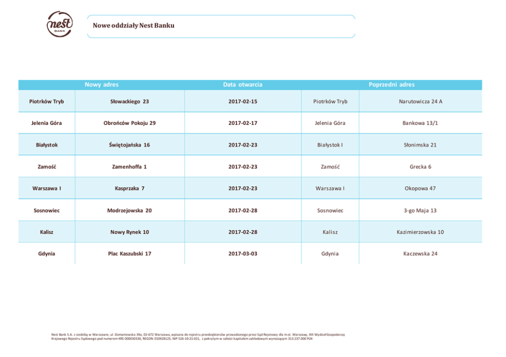 Nowe oddziały Nest Banku Nowy adres Data otwarcia Poprzedni adres Piotrków Tryb Słowackiego 23 2017-02-15 Piotrków Tryb Narutowicza 24 A Jelenia Góra Obrońców Pokoju 29 2017-02-17 Jelenia Góra Bankowa 13/1 Białystok Świętojańska 16 2017-02-23 Białystok I Słonimska 21 Zamość Zamenhoffa 1 2017-02-23 Zamość Grecka 6 Warszawa I Kasprzaka 7 2017-02-23 Warszawa I Okopowa 47 Sosnowiec Modrzejowska 20 2017-02-28 Sosnowiec 3-go Maja 13 Kalisz Nowy Rynek 10 2017-02-28 Kalisz Kazimierzowska 10 Gdynia Plac Kaszubski 17 2017-03-03 Gdynia Kaczewska 24 Nest Bank S.A. z siedzibą w Warszawie, ul. Domaniewska 39a, 02-672 Warszawa, wpisana do rejestru przedsiębiorców prowadzonego przez Sąd Rejonowy dla m.st. Warszawy, XIII Wydział Gospodarczy Krajowego Rejestru Sądowego pod numerem KRS 000030330, REGON 010928125, NIP 526-10-21-021, z pokrytym w całości kapitałem zakładowym wynoszącym 313.237.000 PLN