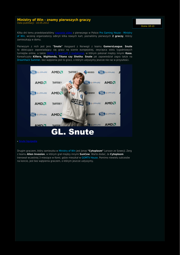 Ministry of Win - znamy pierwszych graczy Data publikacji : 10.05.2012 Ocena: 3/5 (2) Kilka dni temu przedstawialiśmy nagranie video z pierwszego w Polsce Pro Gaming House - Ministry of Win, wczoraj organizatorzy odkryli kilka nowych kart, poznaliśmy pierwszych 2 graczy, którzy zamieszkają w domu. Pierwszym z nich jest Jens "Snute" Aasgaard z Norwegii z teamu GamersLeague. Snute to obiecująco zapowiadający się gracz na scenie europejskiej, zwycięzca wielu tygodniowych turniejów online, a także ONOG i2 StarCraft 2 Invitational, w którym pokonał między innymi Kasa, Koreańczyka Killera, Nightenda, Titana czy Shetha. Snute jak zapowiedział zagra także na Dreamhack Summer, bez wątpienia jest to gracz, o którym usłyszymy jeszcze nie raz w przyszłości. ● Snute liquipedia Drugim graczem, który zamieszka w Ministry of Win jest Jonas "Cytoplasm" Larsson ze Szwecji. Zerg z teamu Alien Invasion, w którym grał między innymi SunCow. Warto dodać, że Cytoplasm trenował wcześniej 3 miesiące w Korei, gdzie mieszkał w GOMTV House. Pomimo niewielu sukcesów na koncie, jest bez wątpienia graczem, o którym jeszcze usłyszymy. ● Cytoplasm liquipedia Trzecim graczem jest Polak Maciej "Breathe" Leśniak, z teamu Rage Esports, zwycięzca Best Lan II. Póki co mamy 3 zergów. Dodatkowo Jojo z kanału youtube SC2News przeprowadził wywiad z jednym z organizatorów Ministry of Win - Jędrzejem Czarnotą, cały wywiad poniżej: ● Lista pytań na teamliquid.net Przypominamy, że po pewnej liczbie wyświetleń strony odblokowany zostanie kolejny materiał, kolejna granica wynosi 10tyś z czego brakuje trochę ponad 1000 odsłon. Ministry of Win ExtraContent zobaczyć można tutaj ● ● ● Strona: http://www.ministryofwin.com Facebook: http://www.facebook.com/ministryofwin Twitter: https://twitter.com/#!/MinistryofWin Tagi: Snute, Ministry of Win, Cytoplasm Uprasza się osoby kopiujące w całości newsy z naszej witryny na swoje strony lub fora o wstawianie widocznych klikalnych linków, bezpośrednio do pobranego tekstu. W przypadku braku widocznego linku, skopiowanie tekstu uważa się za kradzież własności intelektualnej. Dziękujemy: Administratorzy serwisu. Autor: Fanek Data publikacji : 10.05.2012 Data modyfikacji : 10.05.2012 Liczba wyświetleń tekstu: 4627 Komentarz (6) dodaj komentarz niewielu ** (3 linijka o cytoplasmie:) super oby wszystko szlo do przodu!~Vouch 2012/05/09 17:44 a dlaczego nie ma nic o tym na TEAM LIQUID? toż to przecież przedsięwzięcie ma skalę europejską. Chyba nie mamy tam siły przebicia. ok, znalazłem - nvm :D~Kris7 2012/05/09 19:44 aktualizacja, dodany 3 gracz~Fanek Battlenet Network 2012/05/10 13:13 gogo Breathe, korea czeka :P~Vouch 2012/05/10 14:36 Snute ładne zdjęcie, Cytoplasm mnie przeraża, a Polak wyszedł jak zawsze :D~vms 2012/05/10 18:00 Podoba mi się ten Czarnota, ma gość widać łeb na karku, podoba mi się też podejście do tematu, wygląda profesjonalnie~ Bogoos 2012/05/15 18:47 dodaj komentarz 08.10.2015 Kampania "Szepty o zagładzie" dostępna za darmo (0 komentarzy) 27.09.2015 Kolejni bohaterowie w trybie Sprzymierzonych Dowódców (0 komentarzy) 22.09.2015 Cyfrowe gadżety za udział w BlizzCon 2015 (0 komentarzy) 15.07.2015 Legacy of the Void dostępne w przedsprzedaży! (0 komentarzy) 17.06.2015 Informacje z E3 - prolog kampanii Legacy of the Void (0 komentarzy) 30.05.2015 WCS Europe - sobota (30 maja) 18.00 grupa G - MaNa! (0 komentarzy) 07.05.2015 DreamHack Open France 2015 - już 8 maja - MaNa! (0 komentarzy) 03.05.2015 Na wesoło: postacie E-sportu 50 (0 komentarzy) 03.05.2015 IEM Katowice 2015 - jeszcze raz! (0 komentarzy) 03.05.2015 KeSPA Cup 2015 Season 1 - live! (0 komentarzy) 26.04.2015 Proleague - Top5 gier miesiąca (0 komentarzy) 26.04.2015 CJ Entus wygrywa 2 runde Proleague! (0 komentarzy) 18.04.2015 Wersja beta Legacy of the Void – aktualizacja 2.5.1 (0 komentarzy) 18.04.2015 WCS finals 2015 - galeria (0 komentarzy) 18.04.2015 Omówienie zmian w balansie Legacy of the Void (0 komentarzy) 11.04.2015 WCS Europe kwalifikacje z Polakami - dziś (sobota) 18.00 (0 komentarzy) 11.04.2015 Aktualizacja balansu Heart of the Swarm – 9 kwietnia (0 komentarzy) 11.04.2015 GSL Season1 2015 - galeria (0 komentarzy) 11.04.2015 Zbanowane konta w StarCraft II (0 komentarzy) 04.04.2015 Red Bull Battle Grounds powraca jesienią 2015 (0 komentarzy) (zobacz wszystkie)