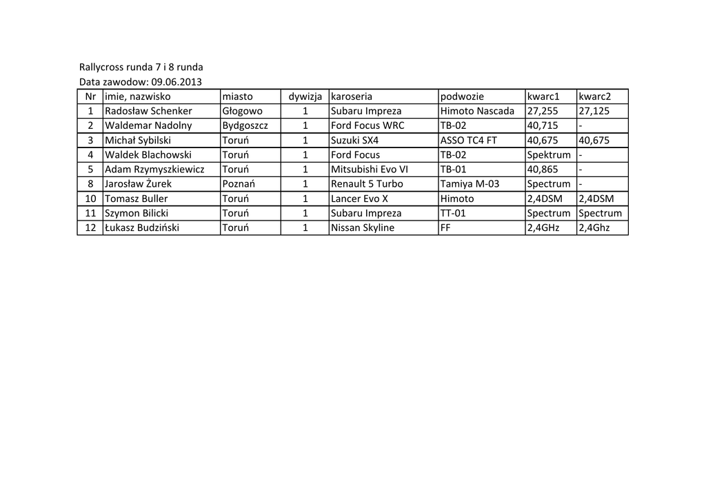 Rallycross runda 7 i 8 runda Data zawodow: 09.06.2013 Nr imie, nazwisko 1 Radosław Schenker 2 Waldemar Nadolny 3 Michał Sybilski 4 Waldek Blachowski 5 Adam Rzymyszkiewicz 8 Jarosław Żurek 10 Tomasz Buller 11 Szymon Bilicki 12 Łukasz Budziński miasto Głogowo Bydgoszcz Toruń Toruń Toruń Poznań Toruń Toruń Toruń dywizja 1 1 1 1 1 1 1 1 1 karoseria Subaru Impreza Ford Focus WRC Suzuki SX4 Ford Focus Mitsubishi Evo VI Renault 5 Turbo Lancer Evo X Subaru Impreza Nissan Skyline podwozie Himoto Nascada TB-02 ASSO TC4 FT TB-02 TB-01 Tamiya M-03 Himoto TT-01 FF kwarc1 27,255 40,715 40,675 Spektrum 40,865 Spectrum 2,4DSM Spectrum 2,4GHz kwarc2 27,125 40,675 2,4DSM Spectrum 2,4Ghz