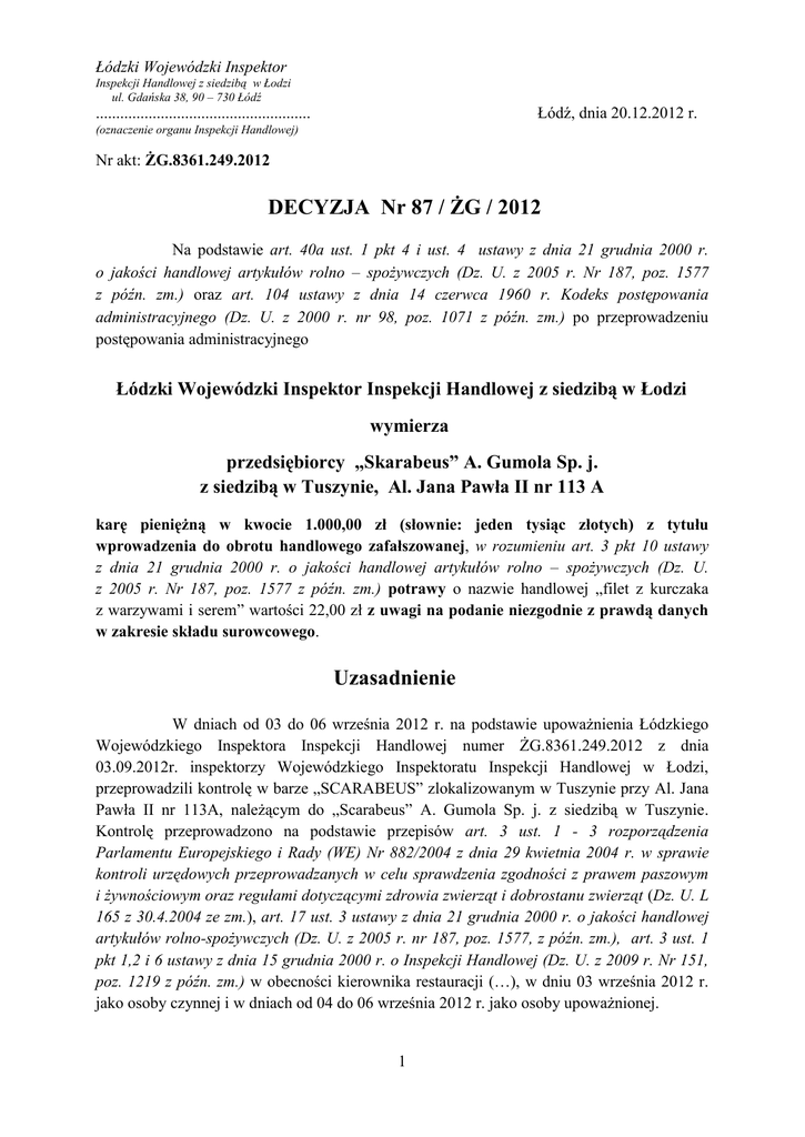 Łódzki Wojewódzki Inspektor Inspekcji Handlowej z siedzibą w Łodzi ul. Gdańska 38, 90 – 730 Łódź Łódź, dnia 20.12.2012 r. ..................................................... (oznaczenie organu Inspekcji Handlowej) Nr akt: ŻG.8361.249.2012 DECYZJA Nr 87 / ŻG / 2012 Na podstawie art. 40a ust. 1 pkt 4 i ust. 4 ustawy z dnia 21 grudnia 2000 r. o jakości handlowej artykułów rolno – spożywczych (Dz. U. z 2005 r. Nr 187, poz. 1577 z późn. zm.) oraz art. 104 ustawy z dnia 14 czerwca 1960 r. Kodeks postępowania administracyjnego (Dz. U. z 2000 r. nr 98, poz. 1071 z późn. zm.) po przeprowadzeniu postępowania administracyjnego Łódzki Wojewódzki Inspektor Inspekcji Handlowej z siedzibą w Łodzi wymierza przedsiębiorcy „Skarabeus” A. Gumola Sp. j. z siedzibą w Tuszynie, Al. Jana Pawła II nr 113 A karę pieniężną w kwocie 1.000,00 zł (słownie: jeden tysiąc złotych) z tytułu wprowadzenia do obrotu handlowego zafałszowanej, w rozumieniu art. 3 pkt 10 ustawy z dnia 21 grudnia 2000 r. o jakości handlowej artykułów rolno – spożywczych (Dz. U. z 2005 r. Nr 187, poz. 1577 z późn. zm.) potrawy o nazwie handlowej „filet z kurczaka z warzywami i serem” wartości 22,00 zł z uwagi na podanie niezgodnie z prawdą danych w zakresie składu surowcowego. Uzasadnienie W dniach od 03 do 06 września 2012 r. na podstawie upoważnienia Łódzkiego Wojewódzkiego Inspektora Inspekcji Handlowej numer ŻG.8361.249.2012 z dnia 03.09.2012r. inspektorzy Wojewódzkiego Inspektoratu Inspekcji Handlowej w Łodzi, przeprowadzili kontrolę w barze „SCARABEUS” zlokalizowanym w Tuszynie przy Al. Jana Pawła II nr 113A, należącym do „Scarabeus” A. Gumola Sp. j. z siedzibą w Tuszynie. Kontrolę przeprowadzono na podstawie przepisów art. 3 ust. 1 - 3 rozporządzenia Parlamentu Europejskiego i Rady (WE) Nr 882/2004 z dnia 29 kwietnia 2004 r. w sprawie kontroli urzędowych przeprowadzanych w celu sprawdzenia zgodności z prawem paszowym i żywnościowym oraz regułami dotyczącymi zdrowia zwierząt i dobrostanu zwierząt (Dz. U. L 165 z 30.4.2004 ze zm.), art. 17 ust. 3 ustawy z dnia 21 grudnia 2000 r. o jakości handlowej artykułów rolno-spożywczych (Dz. U. z 2005 r. nr 187, poz. 1577, z późn. zm.), art. 3 ust. 1 pkt 1,2 i 6 ustawy z dnia 15 grudnia 2000 r. o Inspekcji Handlowej (Dz. U. z 2009 r. Nr 151, poz. 1219 z późn. zm.) w obecności kierownika restauracji (…), w dniu 03 września 2012 r. jako osoby czynnej i w dniach od 04 do 06 września 2012 r. jako osoby upoważnionej. 1 Inspektorzy występując w charakterze nabywców zakupili m.in. potrawę o nazwie handlowej „filet z kurczaka z warzywami i serem” w cenie 22,00 zł, która została wyprodukowana na zamówienie w dniu 03 września 2012 r. w barze „SCARABEUS” zlokalizowanym w Tuszynie przy Al. Jana Pawła II nr 113A, należącym do „Scarabeus” A. Gumola Sp. j. z siedzibą w Tuszynie. Zamówienie zostało złożone w oparciu o dane zawarte w kartach menu dostępnych w sali konsumpcyjnej. Zgodnie z zawartą w nich deklaracją potrawa składała się z piersi z kurczaka z grilla 200g, zapiekanej z warzywami i serem, podawanej z surówką i frytkami lub ryżem. W toku czynności kontrolnych stwierdzono, że do przygotowania zamówionego dania użyto produktu seropodobnego o nazwie „Żółty nadmorski”, wyprodukowanego przez Okręgową Spółdzielnię Mleczarską w Giżycku, ul. Białostocka 25, zaś w karcie menu deklarowano „zapiekana z warzywami i serem”. Na stanie magazynowym placówki nie było sera dojrzewającego, znajdował się natomiast produkt seropodobny „Żółty nadmorski”, zawierający w składzie tłuszcz roślinny, w ilości 3,665 kg. Na podstawie przedłożonej faktury VAT numer 5416/12/VAT z dnia 20.08.2012r., wystawionej przez ABC „PIZZA” Zbigniew Kaczor, ul. Kościelnicka 113, 99-210 Uniejów ustalono, że kontrolowany przedsiębiorca dokonał zakupu 19,045 kg produktu seropodobnego „Żółty nadmorski”. W dniu kontroli w ofercie handlowej oprócz wyżej wymienionej potrawy znajdowało się 7 innych potraw (shorma z serem, shorma arabska z warzywami i serem, kebab z serem, shorma specjal, filet z kurczaka specjal, kebab specjal, sandwich wegetariański) do przygotowania, których winien być użyty ser. Nieprawidłowości zostały udokumentowane w protokole kontroli z dnia 03 września 2012 r. (numer akt ŻG.8361.249.2012) oraz na zdjęciach zrobionych w trakcie kontroli. Ujawnione nieprawidłowości w zakresie oznakowania potrawy, polegające na podaniu niezgodnie z prawdą danych w zakresie składu surowcowego świadczyły o jej zafałszowaniu w rozumieniu art. 3 pkt 10 ustawy z dnia 21 grudnia 2000 r. o jakości handlowej artykułów rolno – spożywczych (Dz. U. z 2005 r. Nr 187, poz. 1577 z późn. zm.), zwanej dalej „ustawą o jakości”. W związku z powyższym w dniu 21 listopada 2012 r. zostało wszczęte z urzędu postępowanie administracyjne w przedmiocie wymierzenia, na podstawie art. 40 a ust. 1 pkt 4 ustawy o jakości, kary pieniężnej z tytułu wprowadzenia do obrotu zafałszowanej potrawy. Strona została poinformowana o wszczęciu postępowania z urzędu oraz o przysługującym prawie do zapoznania się z aktami sprawy, wypowiedzenia się co do zebranych dowodów i materiałów, lecz z tego prawa nie skorzystała. Przedmiotowe pismo zostało odebrane przez stronę w dniu 23 listopada 2012 r. W prowadzonym postępowaniu Łódzki Wojewódzki Inspektor Inspekcji Handlowej wziął pod uwagę wyjaśnienie (…) złożone w toku kontroli w dniu 05 września 2012 r., iż ujawniony w toku inspekcji przypadek zafałszowania artykułu rolno – spożywczego miał charakter jednostkowy i został spowodowany błędem w realizacji zamówienia przez dostawcę. Zamiana sera na produkt seropodobny nie została zauważona przy przyjęciu dostawy z uwagi na nieobecność osoby odpowiedzialnej, która przebywała na urlopie wypoczynkowym. Na po