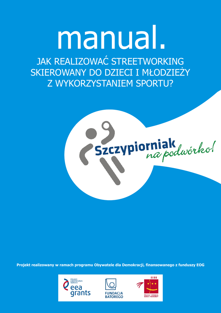 manual. JAK REALIZOWAĆ STREETWORKING SKIEROWANY DO DZIECI I MŁODZIEŻY Z WYKORZYSTANIEM SPORTU? Projekt realizowany w ramach programu Obywatele dla Demokracji, finansowanego z funduszy EOG N OPRACOWANIE Andrzej Orłowski, Tomasz Szczepański GPAS Praga Północ SKŁAD Tomasz Zdrojewski WARSZAWA 2016 WSTĘP M. anual kierujemy do osób, które chcą aktywnie działać na rzecz dzieci i młodzieży w środowisku lokalnym wykorzystując metodę streetworkingu - pedagogiki ulicy. Zebrany materiał jest sumą doświadczeń streetworkerów - pedagogów ulicy działających od kilkunastu lat w Stowarzyszeniu Grupa Pedagogiki i Animacji Społecznej Praga Północ. Autorzy uwzględnili w nim również dobre praktyki streetworkerów - pedagogów ulicy działających w Fundacji Fundusz Grantowy dla Płocka w ramach realizowanego w latach 2015 - 2016 projektu Szczypiorniak na podwórko. D. ziałania opisane w manualu kierowane powinny być przede wszystkim do dzieci i młodzieży pochodzących ze środowisk zagrożonych wykluczeniem społecznym i demoralizacją zamieszkujących osiedla, dzielnice lub obszary, w których występuje duża ilość rodzin wieloproblemowych, w których kumulują się takie problemy jak ubóstwo, bezrobocie, uzależnienie od alkoholu i narkotyków, przemoc, przestępczość. Streetworking - pedagogika ulicy może być skuteczną metodą w docieraniu do tego typu dzieci, gdyż z reguły nie objęte są one stacjonarną formą pomocy i wparcia. NIEZBĘDNE INFORMACJE DO ROZPOCZĘCIA DZIAŁAŃ I. Zabezpieczone środki finansowe na realizację projektu n Stałe, comiesięczne wynagrodzenie dla kadry n Dożywanie dzieci podczas zajęć, transport po mieście komunikacją miejską oraz wstęp do obiektów i miejsc o charakterze społecznym, kulturalnym, edukacyjnym, rozrywkowym, rekreacyjno-sportowym n Wyposażenie dzieci w stroje sportowe i sprzęt niezbędny do realizacji zajęć (w przypadku włączenia sportu do pedagogiki ulicznej, jako jednego z głównych narzędzi oddziaływania na dzieci) II. Rekrutacja i szkolenie streetworkerów - pedagogów ulicy n Konieczne szkolenie kadry przez osoby z doświadczeniem w zakresie prowadzenia programów metodą pedagogiki ulicy oraz prowadzenia szkoleń w tym zakresie * n Zapewnienie koordynatora zespołu streetworkerów pedagogów ulicy n Rekrutacja i szkolenie trenerów / instruktorów sportu (w przypadku włączenia sportu do pedagogiki ulicznej, jako jednego z głównych narzędzi oddziaływania na dzieci) III. Dokonanie wstępnej diagnozy problemów społecznych wskazujących rejony działań oraz zebranie informacji od służb i instytucji n Zlokalizowanie miejsc kumulacji problemów społecznych * Koordynatorzy zespołu streetworekrów - pedagogów ulicy i trenerów muszą ze sobą ściśle współpracować. Funkcję koordynatora obu grup może pełnić jedna osoba. ETAPY PRACY 1. DIAGNOZA CEL: Rozpoznanie środowiska i jego zasobów Identyfikacja problemów społecznych n Identyfikacja miejsc w których spędzają czas dzieci i młodzież wymagające n wsparcia streetworkera - pedagoga ulicy CO ROBIĆ? n Kontakty z instytucjami i organizacjami z lokalnego systemu wsparcia n Zapoznanie się z topografią terenu i jego infrastrukturą n Nawiązywanie kontaktów z lokalną społecznością n Obserwacja miejsc, w których skupiają się dzieci i młodzież JAK TO ROBIĆ? n Praca w parze (dwóch streetworkerów - pedagogów ulicy) n O różnych porach dnia i w różnych dniach tygodnia, głównie popołudniami n Korzystanie z różnych dostępnych źródeł informacji, takich jak: dokumenty, opracowania, informacje od lokalnej społeczności, Internet n Etap ten powinno realizować się w okresie wiosenno - letnim n Czas realizacji: do 2 tygodni Niezbędnik streetworkera pedagoga - ulicy, wyruszającego w teren: Identyfikator n Strój adekwatny do charakteru wykonywanej pracy, np. wygodne obuwie n Drobny sprzęt do gier, zabaw i animacji n Telefon n ETAPY PRACY 2. OBECNOŚĆ W ŚRODOWISKU I ANIMACJA CEL: Identyfikacja grupy ulicznej CO ROBIĆ? Wybór podwórek / podwórka do działań z dziećmi n Gry i zabawy podwórkowe oraz animacje z użyciem np.: chusty klanzy, n akcesoriów do żonglowania Uwzględnienie wśród potencjalnych uczestników grupy ulicznej aspektu n sportowego: rozwój fizyczny, sprawność fizyczna, motoryka, zainteresowanie sportem (w przypadku włączenia sportu do pedagogiki ulicznej, jako jednego z głównych narzędzi oddziaływania na dzieci) Organizacja działań na rzecz lokalnej społeczności, np.: mini pikniki, festyny, n turnieje sportowe Realizacja w okresie wiosenno - letnim n Wyłonienie grupy ulicznej do długofalowej pracy pedagogicznej i treningu n sportowego - rezultat główny JAK TO ROBIĆ? Odwiedzać te same, wybrane wcześniej podwórka n Używać sprzętu sportowego i do animacji n Działać w zespole minimum 2 osób n Zadbać o bezpieczeństwo zabaw na podwórku n Czas realizacji: do 1 miesiąca n ETAPY PRACY 3. PRACA Z GRUPĄ ULICZNĄ CEL: Przełamywanie izolacji społecznej, dostarczanie wiedzy o świecie, profilaktyka wykluczenia społecznego, kształtowanie zainteresowań, w tym związanych ze sportem CO ROBIĆ? n Organizowanie zajęć w obrębie dzielnicy, rejonu zamieszkania dzieci oraz poza nim, zagospodarowujących ich czas wolny, np.: wyjścia do parków, na place zabaw, do kin, na baseny, itd. n Organizowanie zajęć poznawczych, edukacyjnych i rozwojowych, np.: zwiedzanie straży pożarnej, teatru od kulis, spotkania z ciekawymi osobami, pasjonatami, itp. n Zapewnienie drobnych posiłków w trakcie zajęć n Organizowanie zajęć sportowych z aktywnym i biernym udziałem dzieci, wdrażanie do różnych dyscyplin sportowych (w przypadku włączenia sportu do pedagogiki ulicznej, jako jednego z głównych narzędzi oddziaływania na dzieci) n Korzystanie z zajęć sportowych organizowanych przez profesjonalną kadrę, np.: piłka ręczna na obiektach sportowych JAK TO ROBIĆ?