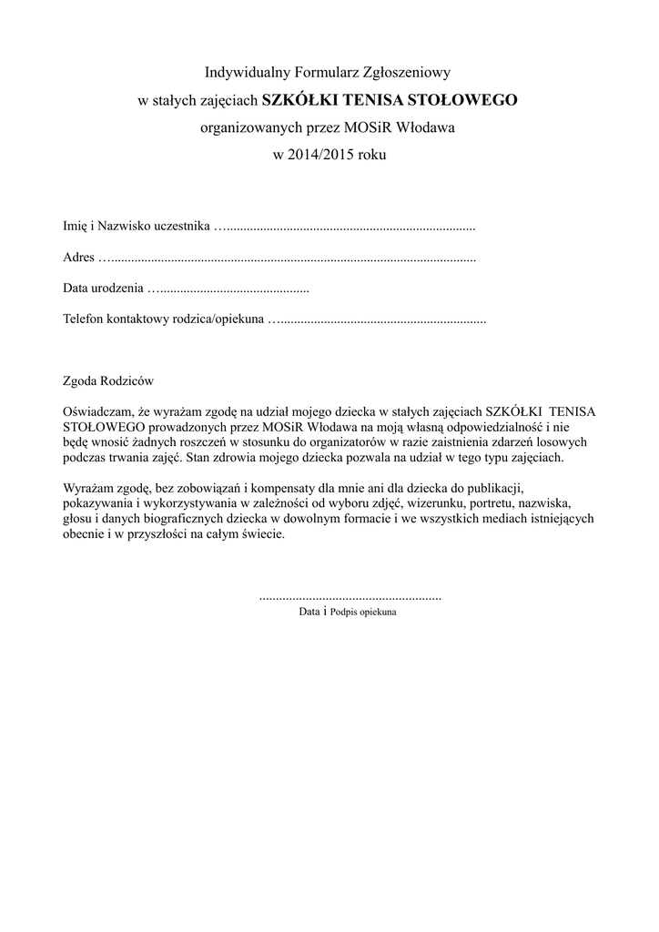Indywidualny Formularz Zgłoszeniowy w stałych zajęciach SZKÓŁKI TENISA STOŁOWEGO organizowanych przez MOSiR Włodawa w 2014/2015 roku Imię i Nazwisko uczestnika …........................................................................... Adres ….............................................................................................................. Data urodzenia …............................................. Telefon kontaktowy rodzica/opiekuna ….............................................................. Zgoda Rodziców Oświadczam, że wyrażam zgodę na udział mojego dziecka w stałych zajęciach SZKÓŁKI TENISA STOŁOWEGO prowadzonych przez MOSiR Włodawa na moją własną odpowiedzialność i nie będę wnosić żadnych roszczeń w stosunku do organizatorów w razie zaistnienia zdarzeń losowych podczas trwania zajęć. Stan zdrowia mojego dziecka pozwala na udział w tego typu zajęciach. Wyrażam zgodę, bez zobowiązań i kompensaty dla mnie ani dla dziecka do publikacji, pokazywania i wykorzystywania w zależności od wyboru zdjęć, wizerunku, portretu, nazwiska, głosu i danych biograficznych dziecka w dowolnym formacie i we wszystkich mediach istniejących obecnie i w przyszłości na całym świecie. ....................................................... Data i Podpis opiekuna
