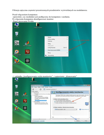 Filtracja optyczna częstości przestrzennych przedmiotów wyświetlanych na modulatorze. Przed włączeniem komputera: -sprawdzić, czy modulator jest podłączony do komputera i zasilania. Po włączeniu komputera skonfigurować monitor: -Panel sterowania Nvidia -> zakładka „konfigurowanie wielu monitorów” ->ustawienie: „klonowanie” -> zakładka „zmiana rozdzielczości” 800x600 Uruchomić sterownik modulatora: Ustawienia jasności i kontrastu powinny być w przybliżeniu: (jasność ~100, kontrast 255) Zestawiliśmy następujący układ pomiarowy: Za pomocą modulatora optycznego możemy wyświetlić różnego rodzaju przedmioty między innymi gwiazdę simensa, obrazki własne, siatki prostokątne i sinusoidalne o różnych stałych. Za pomocą dostępnych filtrów: przesłona irysowa, szczelina, manipulujemy w dziedzinie częstości przestrzennych w płaszczyźnie Fouriera. Obracając polaryzator, ustawiamy dogodne natężenie i kontrast. W płaszczyźnie obrazowej obserwujemy obraz po filtracji. Gwiazda Siemensa bez filtracji Gwiazda Siemensa z filtracją dolnoprzepustową Siatki bez filtracji Siatki z filtracją dolnoprzepustową