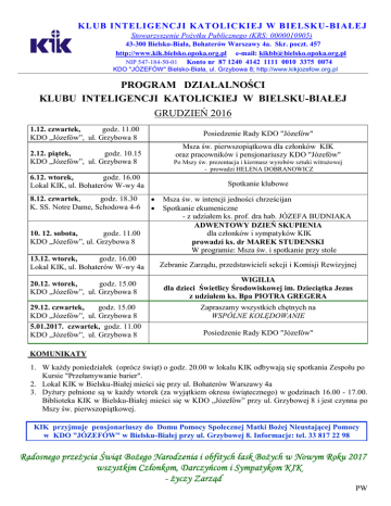 KLUB INTELIGENCJI KATOLICKIEJ W BIELSKU-BIAŁEJ Stowarzyszenie Pożytku Publicznego (KRS: 0000010905) 43-300 Bielsko-Biała, Bohaterów Warszawy 4a. Skr. poczt. 457 http://www.kik.bielsko.opoka.org.pl e-mail: [email protected] NIP 547-184-50-01 Konto nr 87 1240 4142 1111 0010 3375 0074 KDO "JÓZEFÓW" Bielsko-Biała, ul. Grzybowa 8; http://www.kikjozefow.org.pl PROGRAM DZIAŁALNOŚCI KLUBU INTELIGENCJI KATOLICKIEJ W BIELSKU-BIAŁEJ GRUDZIEŃ 2016 1.12. czwartek, godz. 11.00 KDO „Józefów”, ul. Grzybowa 8 Posiedzenie Rady KDO "Józefów" Msza św. pierwszopiątkowa dla członków KIK oraz pracowników i pensjonariuszy KDO "Józefów" 2.12. piątek, godz. 10.15 KDO „Józefów”, ul. Grzybowa 8 Po Mszy św. prezentacja i kiermasz wyrobów sztuki witrażowej - prowadzi HELENA DOBRANOWICZ 6.12. wtorek, godz. 16.00 Lokal KIK, ul. Bohaterów W-wy 4a 8.12. czwartek, godz. 18.30 K. SS. Notre Dame, Schodowa 4-6 10. 12. sobota, godz. 11.00 KDO „Józefów”, ul. Grzybowa 8 13.12. wtorek, godz. 16.00 Lokal KIK, ul. Bohaterów W-wy 4a 20.12. wtorek, godz. 15.00 KDO „Józefów”, ul. Grzybowa 8 29.12. czwartek, godz. 15.00 KDO „Józefów”, ul. Grzybowa 8 5.01.2017. czwartek, godz. 11.00 KDO „Józefów”, ul. Grzybowa 8 Spotkanie klubowe Msza św. w intencji jedności chrześcijan Spotkanie ekumeniczne - z udziałem ks. prof. dra hab. JÓZEFA BUDNIAKA ADWENTOWY DZIEŃ SKUPIENIA dla członków i sympatyków KIK prowadzi ks. dr MAREK STUDENSKI W programie: Msza św. i spotkanie przy stole Zebranie Zarządu, przedstawicieli sekcji i Komisji Rewizyjnej WIGILIA dla dzieci Świetlicy Środowiskowej im. Dzieciątka Jezus z udziałem ks. Bpa PIOTRA GREGERA Zapraszamy wszystkich chętnych na WSPÓLNE KOLĘDOWANIE Posiedzenie Rady KDO "Józefów" KOMUNIKATY 1. W każdy poniedziałek (oprócz świąt) o godz. 20.00 w lokalu KIK odbywają się spotkania Zespołu po Kursie "Przełamywanie barier". 2. Lokal KIK w Bielsku-Białej mieści się przy ul. Bohaterów Warszawy 4a 3. Dyżury pełnione są w każdy wtorek (za wyjątkiem okresu świątecznego) w godzinach 16.00 - 17.00. Biblioteka KIK w Bielsku-Białej mieści się w KDO „Józefów” przy ul. Grzybowej 8 i jest czynna po Mszy św. pierwszopiątkowej. KIK przyjmuje pensjonariuszy do Domu Pomocy Społecznej Matki Bożej Nieustającej Pomocy w KDO ”JÓZEFÓW” w Bielsku-Białej przy ul. Grzybowej 8. Informacje: tel. 33 817 22 98 Radosnego przeżycia Świąt Bożego Narodzenia i obfitych łask Bożych w Nowym Roku 2017 wszystkim Członkom, Darczyńcom i Sympatykom KIK - życzy Zarząd PW