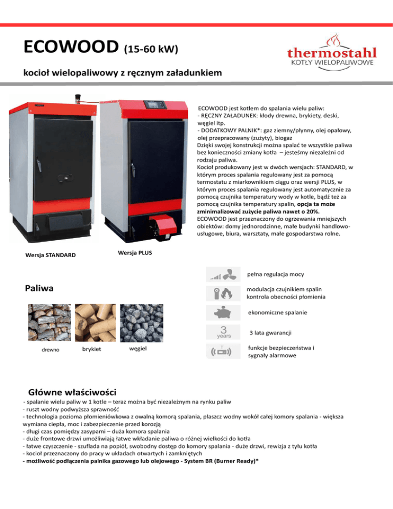 ECOWOOD (15-60 kW) kocioł wielopaliwowy z ręcznym załadunkiem ECOWOOD jest kotłem do spalania wielu paliw: - RĘCZNY ZAŁADUNEK: kłody drewna, brykiety, deski, węgiel itp. - DODATKOWY PALNIK*: gaz ziemny/płynny, olej opałowy, olej przepracowany (zużyty), biogaz Dzięki swojej konstrukcji można spalać te wszystkie paliwa bez konieczności zmiany kotła – jesteśmy niezależni od rodzaju paliwa. Kocioł produkowany jest w dwóch wersjach: STANDARD, w którym proces spalania regulowany jest za pomocą termostatu z miarkownikiem ciągu oraz wersji PLUS, w którym proces spalania regulowany jest automatycznie za pomocą czujnika temperatury wody w kotle, bądź też za pomocą czujnika temperatury spalin, opcja ta może zminimalizować zużycie paliwa nawet o 20%. ECOWOOD jest przeznaczony do ogrzewania mniejszych obiektów: domy jednorodzinne, małe budynki handlowousługowe, biura, warsztaty, małe gospodarstwa rolne. Wersja PLUS Wersja STANDARD pełna regulacja mocy Paliwa modulacja czujnikiem spalin kontrola obecności płomienia brykiet ekonomiczne spalanie 3 lata gwarancji drewno brykiet węgiel funkcje bezpieczeństwa i sygnały alarmowe Główne właściwości - spalanie wielu paliw w 1 kotle – teraz można być niezależnym na rynku paliw - ruszt wodny podwyższa sprawność - technologia pozioma płomieniówkowa z owalną komorą spalania, płaszcz wodny wokół całej komory spalania - większa wymiana ciepła, moc i zabezpieczenie przed korozją - długi czas pomiędzy zasypami – duża komora spalania - duże frontowe drzwi umożliwiają łatwe wkładanie paliwa o różnej wielkości do kotła - łatwe czyszczenie - szuflada na popiół, swobodny dostęp do komory spalania - duże drzwi, rewizja z tyłu kotła - kocioł przeznaczony do pracy w układach otwartych i zamkniętych - możliwość podłączenia palnika gazowego lub olejowego - System BR (Burner Ready)* STEROWNIK Automatyczne dostosowanie mocy Funkcja Lato/Zima Obsługa pompy C.O. Ochrona przed przegrzaniem Obsługa pompy C.W.U Termostat pokojowy Dźwiękowy sygnał w razie awarii Wielojęzyczne menu Wersja Ecowood PLUS wyposażona jest w regulator dzięki któremu mamy do wyboru różne tryby pracy: tradycyjny, PID – dzięki któremu praca wentylatora sterowana jest na podstawie temperatury wody w kotle oraz PIDS z czujnikiem spalin, który moduluje prędkość obrotów wentylatora w zależności od temperatury spalin, opcja ta może zminimalizować zużycie paliwa nawet o 20%. Wersja Ecowood STANDARD wyposażona jest w termostat z miarkownikiem ciągu, który reguluje proces spalania. DANE TECHNICZNE TYP KOTŁA ECW15 ECW 20 ECW 25 ECW 30 ECW40 ECW 50 ECW 60 kW 15 20 25 30 40 50 60 % 83 83 83 83 83 83 83 Wymiary (LxWxH) mm 1050x540x1235 1150x540x1235 1250x540x1235 1350x540x1235 1200x650x1380 1300x650x1380 1400x650x1380 Przyłącza cal 1½ 1½ 1½ 1½ 2 2 2 Max długość drewna mm 400 500 600 700 600 700 800 Max temp. pracy °C 95 95 95 95 95 95 95 Max ciśnienie rob. bar 2 2 2 2 2 2 2 180 180 180 180 220 220 220 lit 65 80 95 115 135 155 175 Zasilanie elektr. V/Hz 230/50 230/50 230/50 230/50 230/50 230/50 230/50 Waga całkowita kg 190 215 235 260 320 350 400 Nominalna moc Sprawność Średnica czopucha Pojemność wodna Wersja PLUS Wersja STANDARD THERMOSTAHL POLAND SP. Z O. O. Al. Wojska Polskiego 42B, 05-800 Pruszków tel. 22758 40 96, www.thermostahl.pl, AKCESORIA DODATKOWE Wężownica schładzająca, jest to wymiennik ciepła zabezpieczający kocioł przed przegrzaniem. Wymiennik wykonany jest z rury miedzianej lub stalowej, znajduje się wewnątrz korpusu kotła otaczając górną część komory ogniowej. Różnorodność regulatorów. W celu zaspokojenia wszystkich potrzeb, oferowane są sterowniki o rozbudowanych funkcjach: – modulacja wentylatora – automatyczny zapłon – czujnik sonda lambda – zdalne sterowanie GSM itp. Wiele opcji sterowania dostępnych na życzenie klienta. Termoregulator LTC, urządzenie stosowane w celu ochrony kotła przed zbyt niską temperaturą wody powrotnej. Dzięki utrzymaniu wysokiej temperatury wody powrotnej możliwe jest osiągnięcie większej sprawności kotła, ograniczenie osadzania się smoły oraz wydłużenie okresu eksploatacji kotła. Regulator ciągu kominowego służy do stabilizacji i zmniejszenia zbyt dużego podciśnienia w przewodach kominowych. Palniki pelletowe Palniki gaz, olej, olej przepracowany THERMOSTAHL POLAND SP. Z O. O. Al. Wojska Polskiego 42B, 05-800 Pruszków tel. 22758 40 96, www.thermostahl.pl,