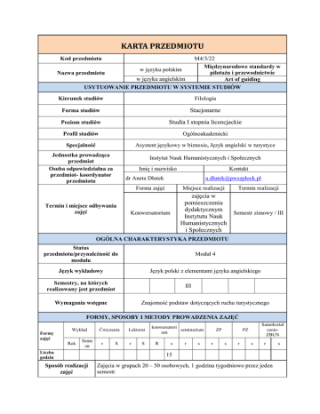 KARTA PRZEDMIOTU M4/3/22 Międzynarodowe standardy w pilotażu i przewodnictwie Art of guiding Kod przedmiotu w języku polskim Nazwa przedmiotu w języku angielskim USYTUOWANIE PRZEDMIOTU W SYSTEMIE STUDIÓW Kierunek studiów Filologia Forma studiów Stacjonarne Poziom studiów Studia I stopnia licencjackie Profil studiów Ogólnoakademicki Specjalność Asystent językowy w biznesie, Język angielski w turystyce Jednostka prowadząca przedmiot Osoba odpowiedzialna za przedmiot- koordynator przedmiotu Instytut Nauk Humanistycznych i Społecznych Imię i nazwisko Kontakt dr Aneta Dłutek Termin i miejsce odbywania zajęć [email protected] Forma zajęć Miejsce realizacji Termin realizacji Konwersatorium zajęcia w pomieszczeniu dydaktycznym Instytutu Nauk Humanistycznych i Społecznych Semestr zimowy / III OGÓLNA CHARAKTERYSTYKA PRZEDMIOTU Status przedmiotu/przynależność do modułu Moduł 4 Język wykładowy Język polski z elementami języka angielskiego Semestry, na których realizowany jest przedmiot III Znajomość podstaw dotyczących ruchu turystycznego Wymagania wstępne FORMY, SPOSOBY I METODY PROWADZENIA ZAJĘĆ Formy zajęć Wykład Rok Seme str Liczba godzin Sposób realizacji zajęć Ćwiczenia r S Lektorat r S konwersatori seminarium um R s r s ZP r Samokształ cenieZBUN PZ s r s r 15 Zajęcia w grupach 20 – 50 osobowych, 1 godzina tygodniowo przez jeden semestr s Sposób zaliczenia zajęć Zaliczenie na ocenę - słowne – wykład, dyskusja Metody dydaktyczne - praktyczne - projekt Przedmioty powiązane/moduł Moduł 4 Kruczek, Z. 2007. Kompendium pilota wycieczek. 2007, Kraków: Proksenia PodSzafranowicz-Małozięć, R. 2015. Podręcznik pilota wycieczek. Warszawa: stawowa Wydawnictwo Kadry Turystyki Sp. z o.o. Wykaz Kruczek, Z. 2007. Pilotaż i przewodnictwo w krajach Unii Europejskiej. literatury Kraków:Proksenia Uzupełni Kruczek, Z. 2010. Etyka przewodników turystycznych i pilotów wycieczek. ająca Kraków: Proksenia Materiały dodatkowe (np. artykuły prasowe) CELE, TREŚCI I EFEKTY KSZTAŁCENIA Cele przedmiotu (ogólne, szczegółowe) - przybliżyć słuchaczom problematykę z zakresu przewodnictwa turystycznego i pilotażu wycieczek, standardów jakości usług oraz zasad etycznych w tym zakresie - przybliżyć słuchaczom podstawowe zagadnienia dotyczące metodyki i techniki pracy przewodnika turystycznego i pilota wycieczek Treści programowe Efekty kształcenia Forma zajęć W01, W02, U01, U02, U03, K02 Konwersat orium W01, W02, U01, U02, U03, K02 Konwersat orium W01, W02, U01, U02, U03, K02 Konwersat orium W01, W02, U01, U02, U03, K02 Konwersat orium W01, W02, U01, U02, U03, K02 Konwersat orium W01, W02, U01, U02, U03, K02 Konwersat orium W01, W02, U01, U02, Konwersat Obsługa imprezy Temat Pojęcia i zagadnienia z zakresu przewodnictwa turystycznego i pilotażu wycieczek Standardy jakości usług w przewodnictwie turystycznym i pilotażu Kodeks etyki obowiązujący w przewodnictwie turystycznym i pilotażu Metodyka i technika pracy przewodnika turystycznego i pilota wycieczek Jak zostać pilotem wycieczek / przewodnikiem Przygotowanie do obsługi imprezy turystycznej Liczba godzin Suma liczby godzin 2 2 3 3 1 1 2 2 1 1 1 1 1 1 U03, K02 W01, W02, U01, U02, U03, K02 W01, W02, U01, U02, U03, K02 W01, W02, U01, U02, U03, K02 W01, W02, U01, U02, U03, K02 orium autokarowej i lotniczej Konwersat Logistyka w podróży orium Konwersat Zakwaterowanie orium grupy Jak zachowywać się w Konwersat sytuacjach trudnych, orium nagłych i awaryjnych Jak zakończyć i Konwersat rozliczyć imprezę orium turystyczną 1 1 1 1 1 1 1 1 15 Efekty kształcenia Student, który zaliczył przedmiot Kod w zakresie WIEDZY W01 W02 U01 ma uporządkowaną wiedzę ogólną, a w przypadku pewnych wybranych zakresów wiedzę szczegółową o turystyce oraz o współczesnym życiu kulturalnym i społecznym Unii Europejskiej, Wielkiej Brytanii oraz Polski zna podstawowe zasady tworzenia i rozwoju form przedsiębiorczości, szczególnie w zakresie turystyki, oraz tworzenia ich wizerunku na zewnątrz w zakresie UMIEJĘTNOŚCI potrafi wyszukiwać, selekcjonować, analizować, interpretować, oceniać i użytkować informacje ze źródeł pisanych i elektronicznych Odniesienie do efektów kształcenia dla kierunk u dla obszaru F1A_W1 7 H1A_W10 F1A_W1 8 S1A_W11 H1A_U01; H1P_U01; F1A_U0 7 umie praktycznie zastosować znajomość języka angielskiego podczas realizacji projektów i w działalności związanej z obszarem turystyki i biznesu H1A_U02 U02 H1A_U03 F1A_U2 1 U03 K02 H1A_U02 H1A_U01 potrafi właściwie analizować przyczyny i przebieg wybranych procesów i zjawisk społecznych, kulturowych, politycznych i ekonomicznych z wykorzystaniem standardowych metod i narzędzi tworząc wizerunek firmy w zakresie KOMPETENCJI potrafi zarządzać swoim czasem, podejmuje zobowiązania i dotrzymuje terminów H1A_U04 S1A_U03 F1A_U2 4 H1A_U04 H1A_K03; F1A_K0 4 H1A_K04 Realizacja efektów kształcenia w poszczególnych formach Student, który zaliczył przedmiot Kod w zakresie WIEDZY Ćw W Lek konwers W01 W02 sem ZP PZ ZBUN PZ ZBUN + + W Ćw W Ćw w zakresie UMIEJĘTNOŚCI Lek konwers sem ZP + + + U01 U02 U03 w zakresie KOMPETENCJI Lek konwers sem ZP PZ ZBUN + K02 Kryteria oceny osiągniętych efektów na ocenę 3 na ocenę 3,5 na ocenę 4 Uzyskanie od 50% - 65% łącznej liczby pkt. możliwych do uzyskania Uzyskanie od 66% - 75% łącznej liczby pkt. możliwych do uzyskania na ocenę 4,5 na ocenę 5 Uzyskanie od 76% Uzyskanie od Uzyskanie od 96% - 85% łącznej 86% - 95% - 100% łącznej liczby pkt. łącznej liczby liczby pkt. możliwych do pkt. możliwych możliwych do uzyskania do uzyskania uzyskania Metody oceny (F- formułująca, P- podsumowująca) Egzamin ustny Egzamin pisemny F Projekt Kolokwium X X P Zadania domowe Referat/ prezentacja Sprawozdanie Aktywność w czasie zajęć X X Metody weryfikacji efektów kształcenia Egzamin ustny Efekty kształcenia (kody) Egzamin pisemny Projekt Kolokwiu