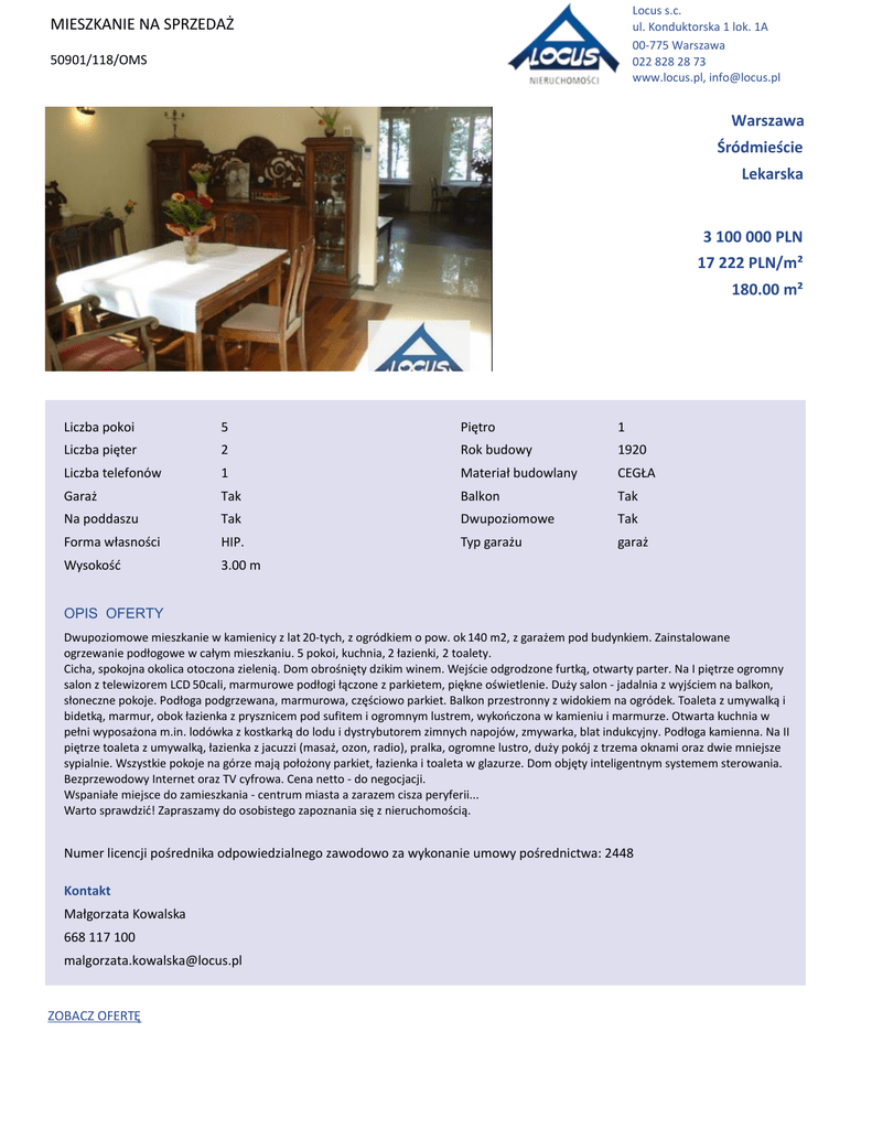 Locus s.c. ul. Konduktorska 1 lok. 1A 00-775 Warszawa 022 828 28 73 www.locus.pl, [email protected] D/^<E/E^WZ 50901/118/OMS Warszawa _ƌſĚŵŝĞƑĐŝĞ Lekarska 3 100 000 PLN 17 222 PLN/m² 180.00 m² Liczba pokoi 5 WŝħƚƌŽ 1 >ŝĐnjďĂƉŝħƚĞƌ 2 Rok budowy 1920 Liczba telefonów 1 DĂƚĞƌŝĂųďƵĚŽǁůĂŶLJ 'B 'ĂƌĂǏ Tak Balkon Tak Na poddaszu Tak Dwupoziomowe Tak &ŽƌŵĂǁųĂƐŶŽƑĐŝ HIP. dLJƉŐĂƌĂǏƵ ŐĂƌĂǏ tLJƐŽŬŽƑđ 3.00 m OPIS OFERTY Dwupoziomowe mieszkanie w kamienicy z lat 20-tych, z ogródkiem o pow. ok 140 m2͕njŐĂƌĂǏĞŵƉŽĚďƵĚLJŶŬŝĞŵ͘ĂŝŶƐƚĂůŽǁĂŶĞ ŽŐƌnjĞǁĂŶŝĞƉŽĚųŽŐŽǁĞǁĐĂųLJŵŵŝĞƐnjŬĂŶŝƵ͘5 pokoi, kuchnia, 2ųĂnjŝĞŶŬŝ͕2 toalety. ŝĐŚĂ͕ƐƉŽŬŽũŶĂŽŬŽůŝĐĂŽƚŽĐnjŽŶĂnjŝĞůĞŶŝČ͘ŽŵŽďƌŽƑŶŝħƚLJĚnjŝŬŝŵǁŝŶĞŵ͘tĞũƑĐŝĞŽĚŐƌŽĚnjŽŶĞĨƵƌƚŬČ͕ŽƚǁĂƌƚLJƉĂƌƚĞƌ͘EĂ/ƉŝħƚƌnjĞŽŐƌŽŵŶLJ salon z telewizorem LCD 50ĐĂůŝ͕ŵĂƌŵƵƌŽǁĞƉŽĚųŽŐŝųČĐnjŽŶĞnjƉĂƌŬŝĞƚĞŵ͕ƉŝħŬŶĞŽƑǁŝĞƚůĞŶŝĞ͘ƵǏLJƐĂůŽŶͲũĂĚĂůŶŝĂnjǁLJũƑĐŝĞŵŶĂďĂůŬŽŶ͕ ƐųŽŶĞĐnjŶĞƉŽŬŽũĞ͘WŽĚųŽŐĂƉŽĚŐƌnjĞǁĂŶĂ͕ŵĂƌŵƵƌŽǁĂ͕ĐnjħƑĐŝŽǁŽƉĂƌŬŝĞƚ͘ĂůŬŽŶƉƌnjĞƐƚƌŽŶŶLJnjǁŝĚŽŬŝĞŵŶĂŽŐƌſĚĞŬ͘dŽĂůĞƚĂnjƵŵLJǁĂůŬČŝ ďŝĚĞƚŬČ͕ŵĂƌŵƵƌ͕ŽďŽŬųĂnjŝĞŶŬĂnjƉƌLJƐnjŶŝĐĞŵƉŽĚƐƵĨŝƚĞŵŝŽŐƌŽŵŶLJŵůƵƐƚƌĞŵ͕ǁLJŬŽŷĐnjŽŶĂǁŬĂŵŝĞŶŝƵŝŵĂƌŵƵƌnjĞ͘KƚǁĂƌƚĂŬƵĐŚŶŝĂǁ ƉĞųŶŝǁLJƉŽƐĂǏŽŶĂŵ͘ŝŶ͘ůŽĚſǁŬĂnjŬŽƐƚŬĂƌŬČĚŽůŽĚƵŝĚLJƐƚƌLJďƵƚŽƌĞŵnjŝŵŶLJĐŚŶĂƉŽũſǁ͕njŵLJǁĂƌŬĂ͕ďůĂƚŝŶĚƵŬĐLJũŶLJ͘WŽĚųŽŐĂŬĂŵŝĞŶŶĂ͘EĂ// ƉŝħƚƌnjĞƚŽĂůĞƚĂnjƵŵLJǁĂůŬČ͕ųĂnjŝĞŶŬĂnjũĂĐƵnjnjŝ;ŵĂƐĂǏ͕ŽnjŽŶ͕ƌĂĚŝŽͿ͕ƉƌĂůŬĂ͕ŽŐƌŽŵŶĞůƵƐƚƌŽ͕ĚƵǏLJƉŽŬſũnjƚƌnjĞŵĂŽŬŶĂŵŝŽƌĂnjĚǁŝĞŵŶŝĞũƐnjĞ ƐLJƉŝĂůŶŝĞ͘tƐnjLJƐƚŬŝĞƉŽŬŽũĞŶĂŐſƌnjĞŵĂũČƉŽųŽǏŽŶLJƉĂƌŬŝĞƚ͕ųĂnjŝĞŶŬĂŝƚŽĂůĞƚĂǁŐůĂnjƵƌnjĞ͘ŽŵŽďũħƚLJŝŶƚĞůŝŐĞŶƚŶLJŵƐLJƐƚĞŵĞŵƐƚĞƌŽǁĂŶŝĂ͘ Bezprzewodowy Internet oraz TV cyfrowa. Cena netto - do negocjacji. tƐƉĂŶŝĂųĞŵŝĞũƐĐĞĚŽnjĂŵŝĞƐnjŬĂŶŝĂͲĐĞŶƚƌƵŵŵŝĂƐƚĂĂnjĂƌĂnjĞŵĐŝƐnjĂƉĞƌLJĨĞƌŝŝ͘͘͘ tĂƌƚŽƐƉƌĂǁĚnjŝđ͊ĂƉƌĂƐnjĂŵLJĚŽŽƐŽďŝƐƚĞŐŽnjĂƉŽnjŶĂŶŝĂƐŝħnjŶŝĞƌƵĐŚŽŵŽƑĐŝČ͘ EƵŵĞƌůŝĐĞŶĐũŝƉŽƑƌĞĚŶŝŬĂŽĚƉŽǁŝĞĚnjŝĂůŶĞŐŽnjĂǁŽĚŽǁŽnjĂǁLJŬŽŶĂŶŝĞƵŵŽǁLJƉŽƑƌĞĚŶŝĐƚǁĂ͗Ϯϰϰϴ Kontakt DĂųŐŽƌnjĂƚĂ<ŽǁĂůƐŬĂ 668 117 100 [email protected] KK&Zd%