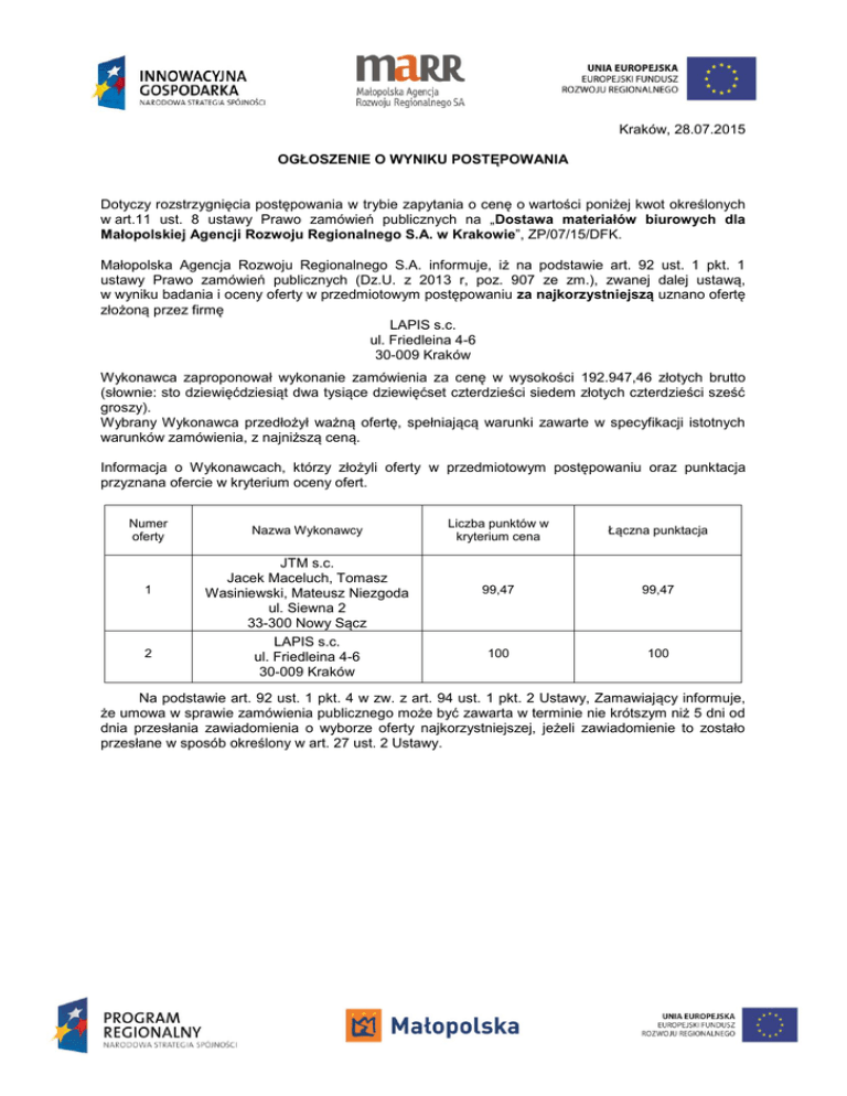 Kraków, 28.07.2015 OGŁOSZENIE O WYNIKU POSTĘPOWANIA Dotyczy rozstrzygnięcia postępowania w trybie zapytania o cenę o wartości poniżej kwot określonych w art.11 ust. 8 ustawy Prawo zamówień publicznych na „Dostawa materiałów biurowych dla Małopolskiej Agencji Rozwoju Regionalnego S.A. w Krakowie”, ZP/07/15/DFK. Małopolska Agencja Rozwoju Regionalnego S.A. informuje, iż na podstawie art. 92 ust. 1 pkt. 1 ustawy Prawo zamówień publicznych (Dz.U. z 2013 r, poz. 907 ze zm.), zwanej dalej ustawą, w wyniku badania i oceny oferty w przedmiotowym postępowaniu za najkorzystniejszą uznano ofertę złożoną przez firmę LAPIS s.c. ul. Friedleina 4-6 30-009 Kraków Wykonawca zaproponował wykonanie zamówienia za cenę w wysokości 192.947,46 złotych brutto (słownie: sto dziewięćdziesiąt dwa tysiące dziewięćset czterdzieści siedem złotych czterdzieści sześć groszy). Wybrany Wykonawca przedłożył ważną ofertę, spełniającą warunki zawarte w specyfikacji istotnych warunków zamówienia, z najniższą ceną. Informacja o Wykonawcach, którzy złożyli oferty w przedmiotowym postępowaniu oraz punktacja przyznana ofercie w kryterium oceny ofert. Numer oferty 1 2 Nazwa Wykonawcy JTM s.c. Jacek Maceluch, Tomasz Wasiniewski, Mateusz Niezgoda ul. Siewna 2 33-300 Nowy Sącz LAPIS s.c. ul. Friedleina 4-6 30-009 Kraków Liczba punktów w kryterium cena Łączna punktacja 99,47 99,47 100 100 Na podstawie art. 92 ust. 1 pkt. 4 w zw. z art. 94 ust. 1 pkt. 2 Ustawy, Zamawiający informuje, że umowa w sprawie zamówienia publicznego może być zawarta w terminie nie krótszym niż 5 dni od dnia przesłania zawiadomienia o wyborze oferty najkorzystniejszej, jeżeli zawiadomienie to zostało przesłane w sposób określony w art. 27 ust. 2 Ustawy.