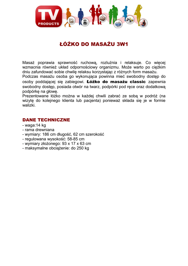 ŁÓŻKO DO MASAŻU 3W1 Masaż poprawia sprawność ruchową, rozluźnia i relaksuje. Co więcej wzmacnia również układ odpornościowy organizmu. Może warto po ciężkim dniu zafundować sobie chwilę relaksu korzystając z różnych form masażu. Podczas masażu osoba go wykonująca powinna mieć swobodny dostęp do osoby poddającej się zabiegowi. Łóżko do masażu classic zapewnia swobodny dostęp, posiada otwór na twarz, podpórki pod ręce oraz dodatkową podpórkę na głowę. Prezentowane łóżko można w każdej chwili zabrać ze sobą w podróż (na wizytę do kolejnego klienta lub pacjenta) ponieważ składa się je w formie walizki. DANE TECHNICZNE - waga:14 kg - rama drewniana - wymiary: 186 cm długość, 62 cm szerokość - regulowana wysokość: 58-85 cm - wymiary złożonego: 93 x 17 x 63 cm - maksymalne obciążenie: do 250 kg