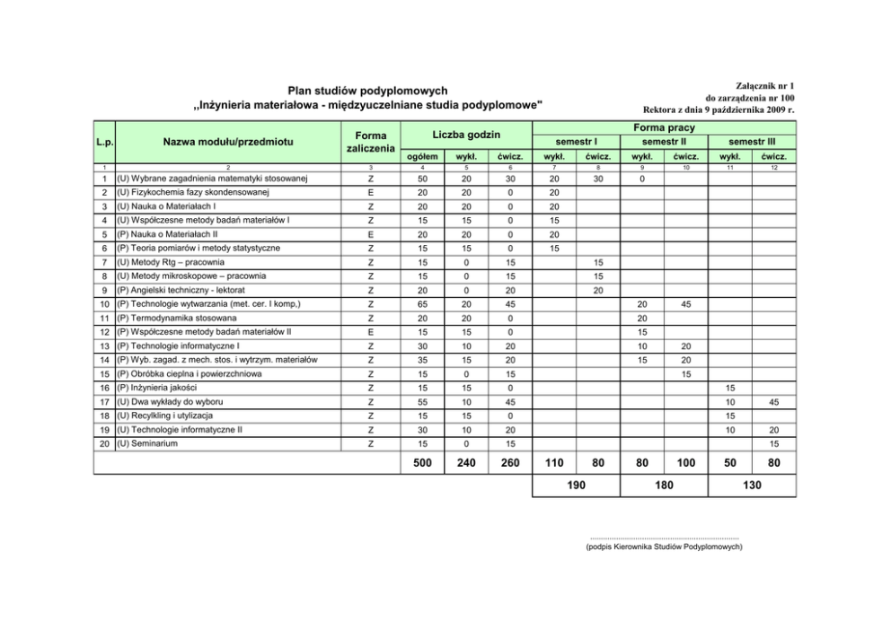 Załącznik nr 1 do zarządzenia nr 100 Rektora z dnia 9 października 2009 r. Plan studiów podyplomowych ,,Inżynieria materiałowa - międzyuczelniane studia podyplomowe" L.p. Nazwa modułu/przedmiotu 2 1 Forma zaliczenia Forma pracy Liczba godzin semestr I semestr II semestr III ogółem wykł. ćwicz. wykł. ćwicz. wykł. ćwicz. wykł. ćwicz. 3 4 5 6 7 8 9 10 11 12 30 0 1 (U) Wybrane zagadnienia matematyki stosowanej Z 50 20 30 20 2 (U) Fizykochemia fazy skondensowanej E 20 20 0 20 3 (U) Nauka o Materiałach I Z 20 20 0 20 4 (U) Współczesne metody badań materiałów I Z 15 15 0 15 5 (P) Nauka o Materiałach II E 20 20 0 20 6 (P) Teoria pomiarów i metody statystyczne Z 15 15 0 15 7 (U) Metody Rtg – pracownia Z 15 0 15 15 8 (U) Metody mikroskopowe – pracownia Z 15 0 15 15 9 (P) Angielski techniczny - lektorat Z 20 0 20 20 Z 65 20 45 20 11 (P) Termodynamika stosowana Z 20 20 0 20 12 (P) Współczesne metody badań materiałów II E 15 15 0 15 13 (P) Technologie informatyczne I Z 30 10 20 10 20 14 (P) Wyb. zagad. z mech. stos. i wytrzym. materiałów Z 35 15 20 15 20 15 (P) Obróbka cieplna i powierzchniowa Z 15 0 15 16 (P) Inżynieria jakości Z 15 15 0 15 17 (U) Dwa wykłady do wyboru Z 55 10 45 10 18 (U) Recylkling i utylizacja Z 15 15 0 15 19 (U) Technologie informatyczne II Z 30 10 20 10 20 (U) Seminarium Z 15 0 15 500 240 260 10 (P) Technologie wytwarzania (met. cer. I komp,) 45 15 45 20 15 110 80 190 80 100 50 180 ..................................................................... (podpis Kierownika Studiów Podyplomowych) 80 130