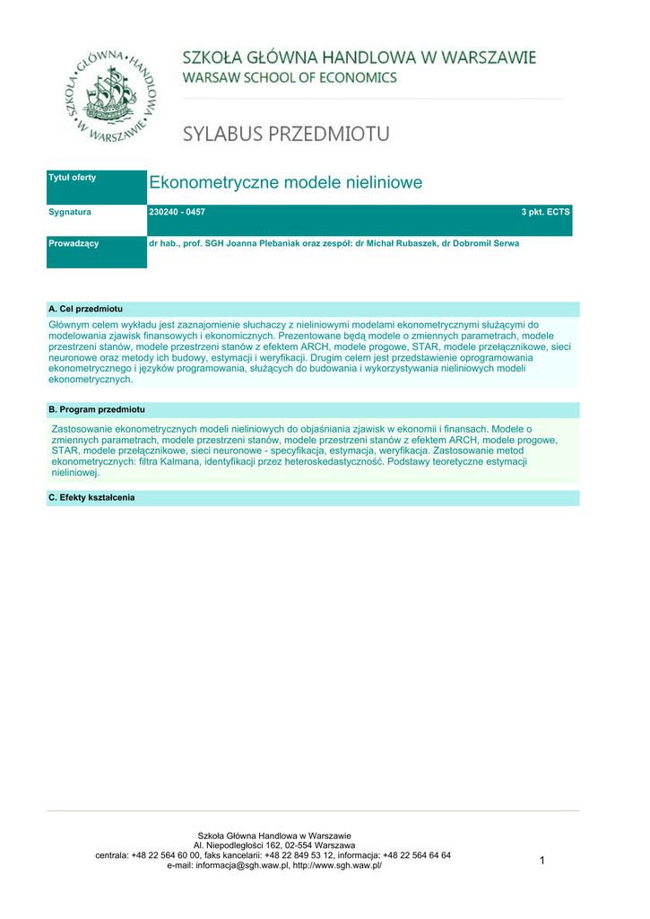 Tytuáoferty Ekonometryczne modele nieliniowe Sygnatura 230240 - 0457 Prowadzący dr hab., prof. SGH Joanna Plebaniak oraz zespyá: dr MichaáRubaszek, dr DobromiáSerwa 3 pkt. ECTS A. Cel przedmiotu Gáywnym celem wykáadu jest zaznajomienie sáuchaczy z nieliniowymi modelami ekonometrycznymi sáuĪącymi do modelowania zjawisk finansowych i ekonomicznych. Prezentowane bĊdąmodele o zmiennych parametrach, modele przestrzeni stanów, modele przestrzeni stanów z efektem ARCH, modele progowe, STAR, modele przeáącznikowe, sieci neuronowe oraz metody ich budowy, estymacji i weryfikacji. Drugim celem jest przedstawienie oprogramowania ekonometrycznego i jĊzyków programowania, sáuĪących do budowania i wykorzystywania nieliniowych modeli ekonometrycznych. B. Program przedmiotu Zastosowanie ekonometrycznych modeli nieliniowych do objaĞniania zjawisk w ekonomii i finansach. Modele o zmiennych parametrach, modele przestrzeni stanów, modele przestrzeni stanów z efektem ARCH, modele progowe, STAR, modele przeáącznikowe, sieci neuronowe - specyfikacja, estymacja, weryfikacja. Zastosowanie metod ekonometrycznych: filtra Kalmana, identyfikacji przez heteroskedastycznoĞü. Podstawy teoretyczne estymacji nieliniowej. C. Efekty ksztaácenia Szkoáa Gáywna Handlowa w Warszawie Al. NiepodlegáoĞci 162, 02-554 Warszawa centrala: +48 22 564 60 00, faks kancelarii: +48 22 849 53 12, informacja: +48 22 564 64 64 e-mail: [email protected], http://www.sgh.waw.pl/ 1 c.d.Ekonometryczne modele nieliniowe Wiedza Student powinien wiedzieü: 1. Jakie nieliniowe modele ekonometryczne stosowane sądo analizy zjawisk finansowych i makroekonomicznych. 2. Jakie metody stosowane sądo specyfikacji, szacowania parametrów, weryfikacji modeli nieliniowych stosowanych w finansach i ekonomii. 3. Jakie sąwáasnoĞci estymatorów dla modeli nieliniowych (NMNK i MNW). 4. Jak konstruuje siĊfunkcjĊwiarygodnoĞci dla wybranych modeli nieliniowych. 5. Jakie sąmetody optymalizacji funkcji wiarygodnoĞci i sumy kwadratów reszt w modelu nieliniowym. 6. Jakie programy ekonometryczne i jĊzyki programowanie sąwykorzystywane w budowaniu nieliniowych modeli ekonometrycznych. UmiejĊtnoĞci Student powinien potrafiü: 1. Analizowaüzjawiska finansowe i ekonomiczne przy wykorzystaniu modeli przestrzeni stanów, modeli przeáącznikowych. 2. Szacowaüparametry modeli nieliniowych, weryfikowaüjakoĞütych modeli, wybraünajlepszą specyfikacjĊdla wybranej klasy modeli. 3. Zaprogramowaüw wybranym jĊzyku programowania ekonometrycznego wybrane metody analizy nieliniowych modeli ekonometrycznych. Inne kompetencje Ponadto student ma moĪliwoĞü: 1. Udoskonalenia umiejĊtnoĞci obsáugi komputerowych pakietów ekonometrycznych. 2. Poszerzenia swojej wiedzy z zakresu teorii ekonometrii. D. Semestralny plan zajĊü 1 Wprowadzenie. Podstawowe informacje o modelach nieliniowych. Modele o zmiennych parametrach (przeáącznikowe, ze zmiennymi zero-jedynkowymi). 2 Podstawy teoretyczne estymacji nieliniowej. Nieliniowa metoda najmniejszych kwadratów. Metody optymalizacji: metoda Newtona-Raphsona, metoda Gaussa. 3 Metoda NajwiĊkszej WiarygodnoĞci. Estymator MNW i jego wáasnoĞci. 4 ûwiczenia w budowaniu estymatorów dla wybranych modeli na przykáadzie modeli GARCH. 5 Zapoznanie studentów z popularnymi programami ekonometrycznymi i programowaniem ekonometrycznym. 6 Modele przestrzeni stanów, filtr Kalmana. Modele przestrzeni stanów z efektem ARCH. 7 ûwiczenia w programowaniu modeli przestrzeni stanów. 8 Modele progowe, weryfikacja, estymacja, metoda bootstrap. 9 Modele áagodnego przejĞcia (STAR). 10 Sieci neuronowe jako nieliniowe modele ekonometryczne. 11 Modele przeáącznikowe Markowa i modele mieszaniny rozkáadów. 12 Metoda identyfikacji przez heteroskedastycznoĞü. 13 ûwiczenia w programowaniu ekonometrycznych modeli przeáącznikowych. 14 Prezentacje wybranych badaĔdotyczących ekonometrycznych modeli nieliniowych. 15 Podsumowanie i omówienie materiaáu. Szkoáa Gáywna Handlowa w Warszawie Al. NiepodlegáoĞci 162, 02-554 Warszawa centrala: +48 22 564 60 00, faks kancelarii: +48 22 849 53 12, informacja: +48 22 564 64 64 e-mail: [email protected], http://www.sgh.waw.pl/ 2 c.d.Ekonometryczne modele nieliniowe E. Literatura podstawowa (obowiązkowe podrĊczniki) J.D.Hamilton, Time Series Analysis, Princeton University Press 1994; Artykuáy z czasopism naukowych, wybrane przez wykáadowcĊ. F. Literatura uzupeániająca G.Chow, Ekonometria, PWN 1995; M.OsiĔska, Ekonometria finansowa, Polskie Wydawnictwo Ekonomiczne, Warszawa 2006; G.S.Maddala, Ekonometria, PWN 2006; Ch.Kim, Ch.Nelson, State-Space Models with Regime Switching, The MIT Press 1999; Ph.Frances, D.van Dijk, Non-linear time series models in empirical finance, Cambridge University Press 2006. G. NajwaĪniejsze publikacje autora(ów) dotyczące proponowanych zajĊü "WskaĨnik gieády jako model ekonometryczny (praktyczna weryfikacja zaáoĪeĔ)", w: "Mikroekonometria w teorii i praktyce", red. naukowy prof. dr hab. J. Hozer, Zeszyty Naukowe Uniwersytetu SzczeciĔskiego nr 318, Szczecin 2001, str. od 43 do 46. Wspyáautorzy: M. Kolupa (udziaáwáasny: wspyáautor 50%), "StacjonarnoĞüszeregów obserwacji zmiennych rynku kapitaáowego", w: "Mikroekonometria w teorii i praktyce", red. naukowy prof. dr hab. J. Hozer, Zeszyty Naukowe Uniwersytetu SzczeciĔskiego nr 320, Szczecin 2001, str. od 59 do 62. Wspyáautorzy: W. Marcinkowska Lewandowska (udziaáwáasny: wspyáautor 50%), "Prognozowanie wskaĨnika gieády", w: "Mikroekonometria w teoriii praktyce", red. naukowy prof. dr hab. J. Hozer, Zeszyty Naukowe Uniwersytetu SzczeciĔskiego nr 320, Szczecin 2001, str. od 63 do 80. Wspyáautorzy: M. Kolupa (udziaáwáasny: wspyáautor 50%) H. Sygnatury wymaganych prerekwizytów nie sąwymagane I. Wymiar i forma zajĊü Stacj. Sob. niedz. Popoáud. Ogyáem: 30 14 30 Wykáad 15 7 15 Laboratorium 15 7 15 J. Elementy oceny koĔcowej egzamin tradycyjny 100% K. Wymag