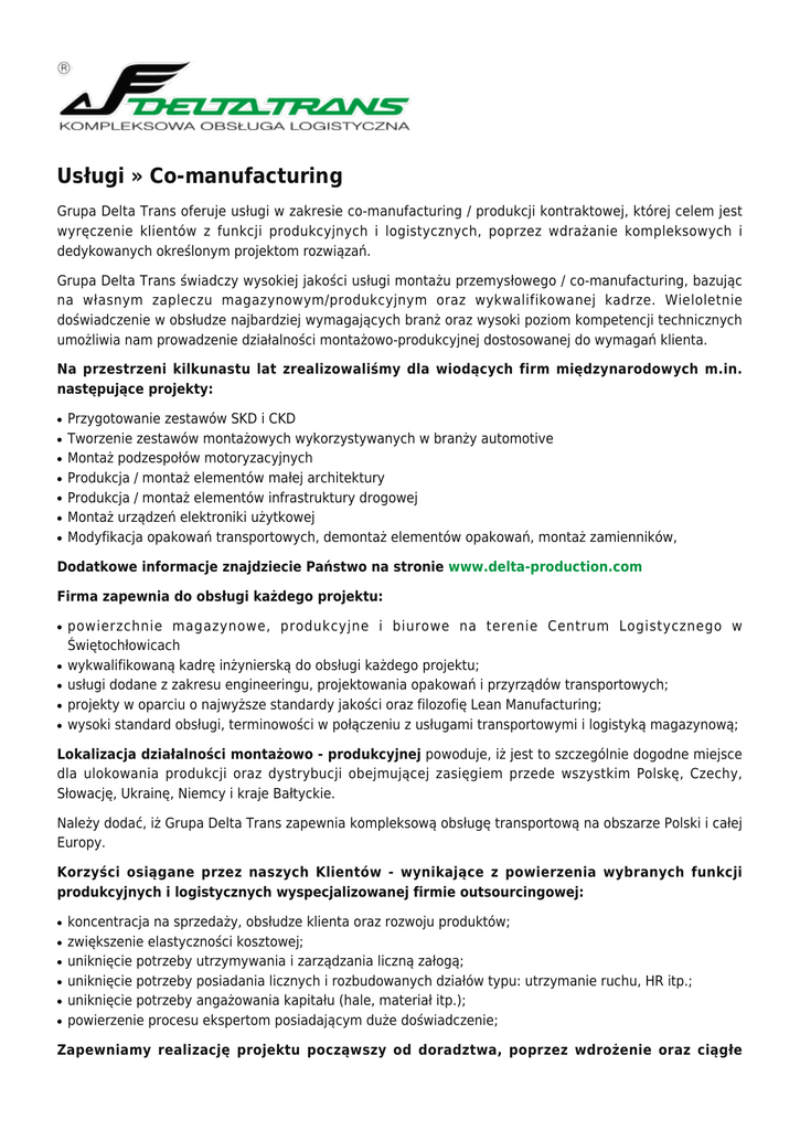 Usługi » Co-manufacturing Grupa Delta Trans oferuje usługi w zakresie co-manufacturing / produkcji kontraktowej, której celem jest wyręczenie klientów z funkcji produkcyjnych i logistycznych, poprzez wdrażanie kompleksowych i dedykowanych określonym projektom rozwiązań. Grupa Delta Trans świadczy wysokiej jakości usługi montażu przemysłowego / co-manufacturing, bazując na własnym zapleczu magazynowym/produkcyjnym oraz wykwalifikowanej kadrze. Wieloletnie doświadczenie w obsłudze najbardziej wymagających branż oraz wysoki poziom kompetencji technicznych umożliwia nam prowadzenie działalności montażowo-produkcyjnej dostosowanej do wymagań klienta. Na przestrzeni kilkunastu lat zrealizowaliśmy dla wiodących firm międzynarodowych m.in. następujące projekty: ● ● ● ● ● ● ● Przygotowanie zestawów SKD i CKD Tworzenie zestawów montażowych wykorzystywanych w branży automotive Montaż podzespołów motoryzacyjnych Produkcja / montaż elementów małej architektury Produkcja / montaż elementów infrastruktury drogowej Montaż urządzeń elektroniki użytkowej Modyfikacja opakowań transportowych, demontaż elementów opakowań, montaż zamienników, Dodatkowe informacje znajdziecie Państwo na stronie www.delta-production.com Firma zapewnia do obsługi każdego projektu: ● ● ● ● ● powierzchnie magazynowe, produkcyjne i biurowe na terenie Centrum Logistycznego w Świętochłowicach wykwalifikowaną kadrę inżynierską do obsługi każdego projektu; usługi dodane z zakresu engineeringu, projektowania opakowań i przyrządów transportowych; projekty w oparciu o najwyższe standardy jakości oraz filozofię Lean Manufacturing; wysoki standard obsługi, terminowości w połączeniu z usługami transportowymi i logistyką magazynową; Lokalizacja działalności montażowo - produkcyjnej powoduje, iż jest to szczególnie dogodne miejsce dla ulokowania produkcji oraz dystrybucji obejmującej zasięgiem przede wszystkim Polskę, Czechy, Słowację, Ukrainę, Niemcy i kraje Bałtyckie. Należy dodać, iż Grupa Delta Trans zapewnia kompleksową obsługę transportową na obszarze Polski i całej Europy. Korzyści osiągane przez naszych Klientów - wynikające z powierzenia wybranych funkcji produkcyjnych i logistycznych wyspecjalizowanej firmie outsourcingowej: ● ● ● ● ● ● koncentracja na sprzedaży, obsłudze klienta oraz rozwoju produktów; zwiększenie elastyczności kosztowej; uniknięcie potrzeby utrzymywania i zarządzania liczną załogą; uniknięcie potrzeby posiadania licznych i rozbudowanych działów typu: utrzymanie ruchu, HR itp.; uniknięcie potrzeby angażowania kapitału (hale, materiał itp.); powierzenie procesu ekspertom posiadającym duże doświadczenie; Zapewniamy realizację projektu począwszy od doradztwa, poprzez wdrożenie oraz ciągłe doskonalenie procesu w zakresie poszczególnych usług. Grupa Delta Trans w liczbach: ● ● ● ● ● ● ● ● ● 80 tys. m2 nowoczesnych powierzchni magazynowych, produkcyjnych i biurowych 100 doświadczonych techników, inżynierów oraz specjalistów od zarządzania kontroli jakości 27 lat doświadczenia w realizowaniu usług z zakresu outsourcingu produkcyjnego rocznie: 40 000 przygotowanych i wysłanych zestawów montażowych rocznie: 10 000 kontenerów morskich załadowanych i wyekspediowanych rocznie: 200.000 umytych opakowań KLT rocznie: 2 000 000 wydanych palet i przyjętych do Delta Trans rocznie: 780.000 opakowań transportowych naprawionych/zregenerowanych rocznie: 12 000 samochodów ciężarowych załadowanych/ rozładowanych w magazynach i halach produkcyjnych Delta Trans Kontakt.: e-mail: [email protected] tel. kom.: +48 601 485 562 Galeria
