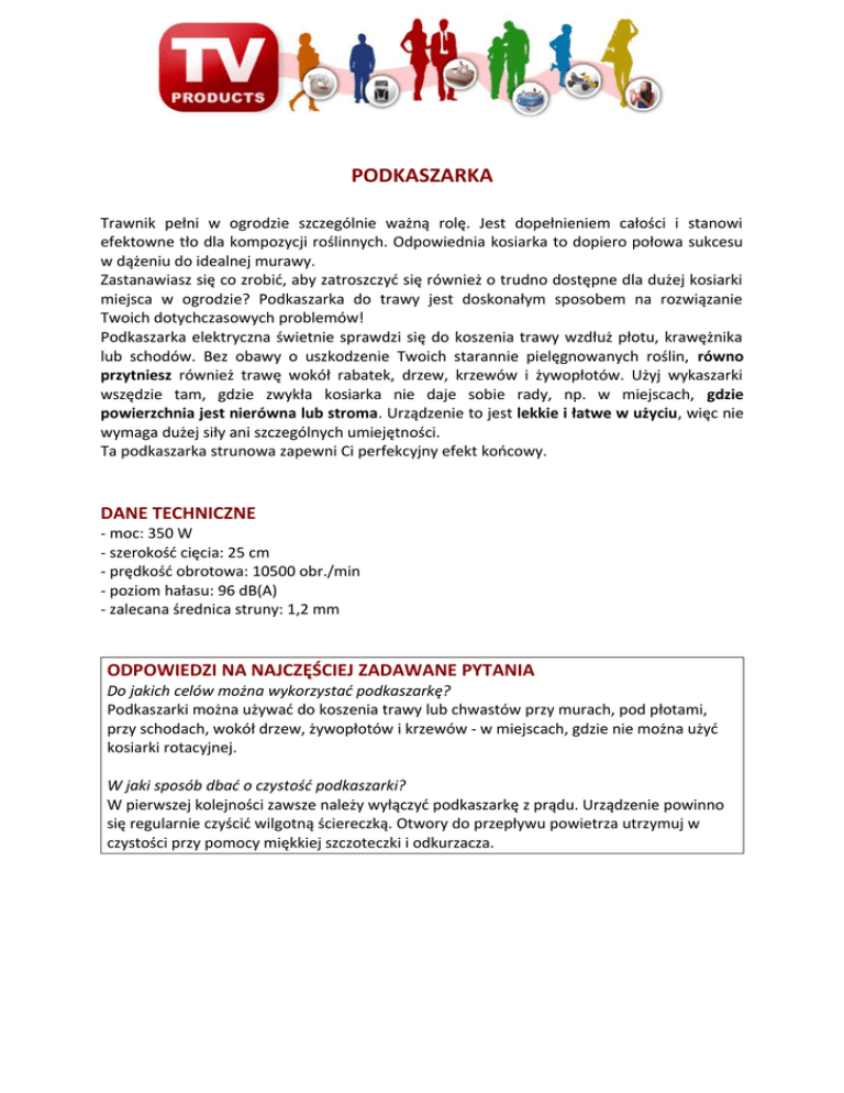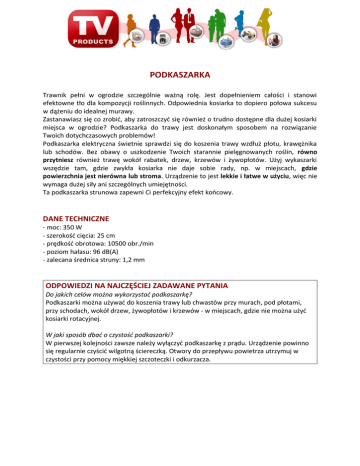 PODKASZARKA Trawnik pełni w ogrodzie szczególnie ważną rolę. Jest dopełnieniem całości i stanowi efektowne tło dla kompozycji roślinnych. Odpowiednia kosiarka to dopiero połowa sukcesu w dążeniu do idealnej murawy. Zastanawiasz się co zrobić, aby zatroszczyć się również o trudno dostępne dla dużej kosiarki miejsca w ogrodzie? Podkaszarka do trawy jest doskonałym sposobem na rozwiązanie Twoich dotychczasowych problemów! Podkaszarka elektryczna świetnie sprawdzi się do koszenia trawy wzdłuż płotu, krawężnika lub schodów. Bez obawy o uszkodzenie Twoich starannie pielęgnowanych roślin, równo przytniesz również trawę wokół rabatek, drzew, krzewów i żywopłotów. Użyj wykaszarki wszędzie tam, gdzie zwykła kosiarka nie daje sobie rady, np. w miejscach, gdzie powierzchnia jest nierówna lub stroma. Urządzenie to jest lekkie i łatwe w użyciu, więc nie wymaga dużej siły ani szczególnych umiejętności. Ta podkaszarka strunowa zapewni Ci perfekcyjny efekt końcowy. DANE TECHNICZNE - moc: 350 W - szerokość cięcia: 25 cm - prędkość obrotowa: 10500 obr./min - poziom hałasu: 96 dB(A) - zalecana średnica struny: 1,2 mm ODPOWIEDZI NA NAJCZĘŚCIEJ ZADAWANE PYTANIA Do jakich celów można wykorzystać podkaszarkę? Podkaszarki można używać do koszenia trawy lub chwastów przy murach, pod płotami, przy schodach, wokół drzew, żywopłotów i krzewów - w miejscach, gdzie nie można użyć kosiarki rotacyjnej. W jaki sposób dbać o czystość podkaszarki? W pierwszej kolejności zawsze należy wyłączyć podkaszarkę z prądu. Urządzenie powinno się regularnie czyścić wilgotną ściereczką. Otwory do przepływu powietrza utrzymuj w czystości przy pomocy miękkiej szczoteczki i odkurzacza.