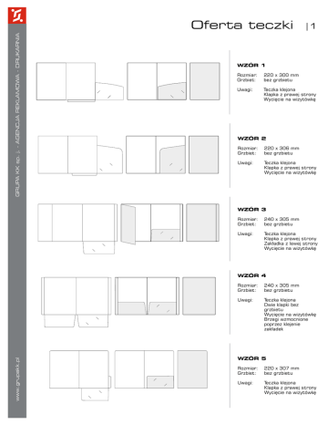 GRUPA KK sp. j. - AGENCJA REKLAMOWA - DRUKARNIA Oferta teczki |1 WZÓR 1 Rozmiar: Grzbiet: 20 x 300 mm 2 bez grzbietu Uwagi: eczka klejona T Klapka z prawej strony Wycięcie na wizytówkę WZÓR 2 Rozmiar: Grzbiet: 20 x 306 mm 2 bez grzbietu Uwagi: eczka klejona T Klapka z prawej strony Wycięcie na wizytówkę WZÓR 3 Rozmiar: Grzbiet: 40 x 305 mm 2 bez grzbietu Uwagi: eczka klejona T Klapka z prawej strony Zakładka z lewej strony Wycięcie na wizytówkę www.grupakk.pl WZÓR 4 Rozmiar: Grzbiet: 40 x 305 mm 2 bez grzbietu Uwagi: eczka klejona T Dwie klapki bez grzbietu Wycięcie na wizytówkę Brzegi wzmocnione poprzez klejenie zakładek WZÓR 5 Rozmiar: Grzbiet: 20 x 307 mm 2 bez grzbietu Uwagi: eczka klejona T Klapka z prawej strony Wycięcie na wizytówkę GRUPA KK sp. j. - AGENCJA REKLAMOWA - DRUKARNIA Oferta teczki |2 WZÓR 6 Rozmiar: Grzbiet: 25 x 307 mm 2 5 mm Uwagi: eczka klejona T Lewa klapka bez grzbietu Prawa klapka z grzbietem 4 mm Wycięcie na wizytówkę WZÓR 7 Rozmiar: Grzbiet: 32 x 320 mm 2 potrójny (0 mm, 8 mm, 10 mm) Uwagi: eczka składana T Trzy klapki z potrójnym grzbietem (0 mm, 8 mm, 10 mm) Możliwość zamontowania gumki WZÓR 8 Rozmiar: Grzbiet: 20 x 310 mm 2 5 mm Uwagi: eczka składana T Trzy klapki z grzbietem Wycięcie na wizytówkę Eleganckie zamknięcie www.grupakk.pl WZÓR 9 Rozmiar: Grzbiet: 20 x 305 mm 2 5 mm Uwagi: eczka składana T Prawa klapka z grzbietem Wycięcie na wizytówkę WZÓR 10 Rozmiar: Grzbiet: 17 x 310 mm 2 5 mm Uwagi: eczka klejona T Prawa klapka z grzbietem Eleganckie zamknięcie GRUPA KK sp. j. - AGENCJA REKLAMOWA - DRUKARNIA Oferta teczki |3 WZÓR 11 Rozmiar: Grzbiet: 25 x 310 mm 2 5 mm Uwagi: eczka klejona T Prawa klapka z grzbietem Eleganckie zamknięcie WZÓR 12 Rozmiar: Grzbiet: 20 x 305 mm 2 5 mm Uwagi: eczka klejona T Prawa klapka z grzbietem Wycięcie na wizytówkę WZÓR 13 Rozmiar: Grzbiet: 35 x 305 mm 2 bez grzbietu Uwagi: eczka klejona T Klapka z prawej strony Wycięcie na wizytówkę Możliwość wpięcia teczki do segregatora www.grupakk.pl WZÓR 14 Rozmiar: Grzbiet: 25 x 310 mm 2 5 mm Uwagi: eczka klejona T Prawa klapka z grzbietem Wycięcie na wizytówkę Możliwość wpięcia teczki do segregatora WZÓR 15 Rozmiar: Grzbiet: 20 x 305 mm 2 bez grzbietu Uwagi: eczka klejona T Klapka z prawej strony Wycięcie na wizytówkę www.grupakk.pl GRUPA KK sp. j. - AGENCJA REKLAMOWA - DRUKARNIA Oferta teczki AKCESORIA DODATKOWE - Wąsy do wpinania kartek Gumka Klips do mocowania CD Kieszonka foliowa |4